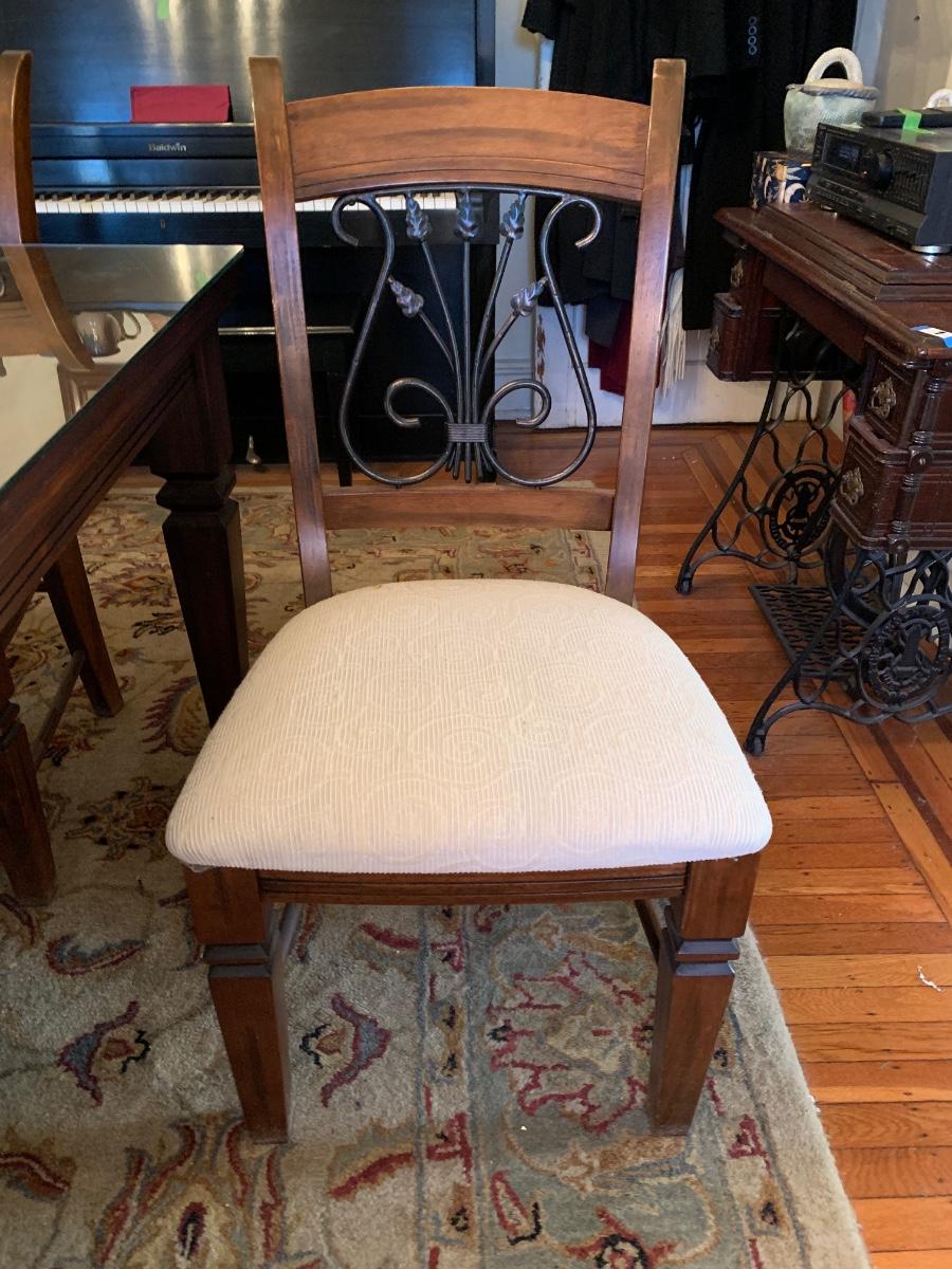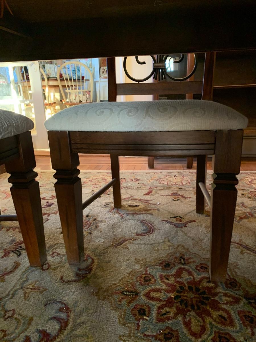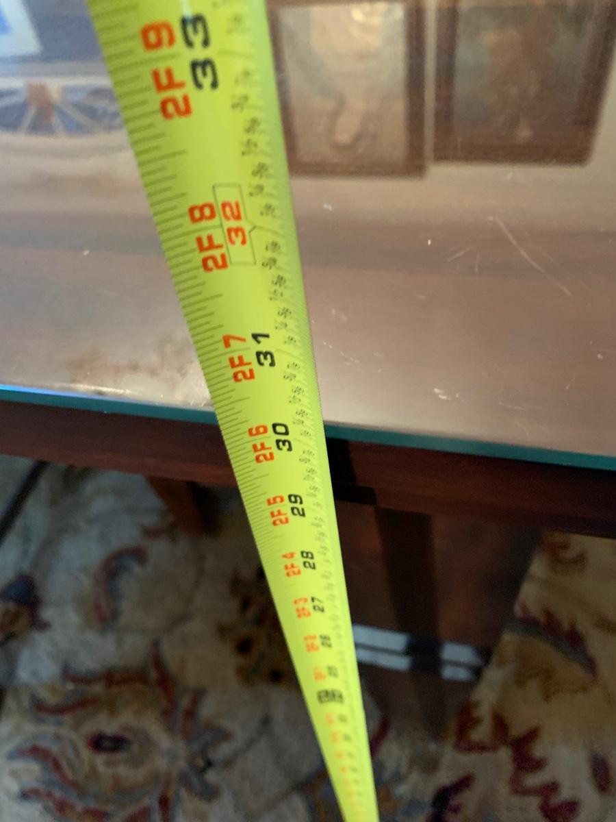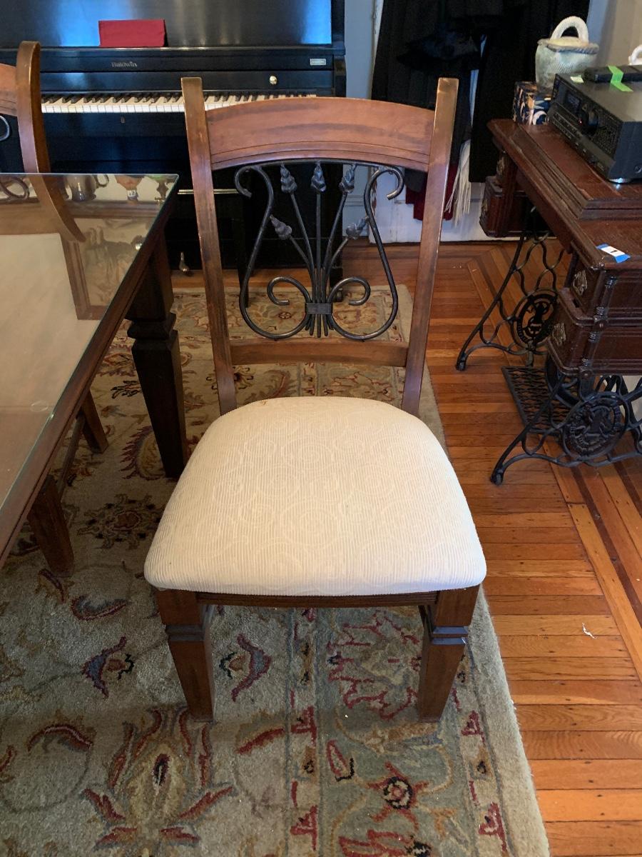 62 x 38 x 30 table & chairs set, This is a solid set and heavy. Has lovely scrollback design to the chairs, and a glass top to protect the wood.