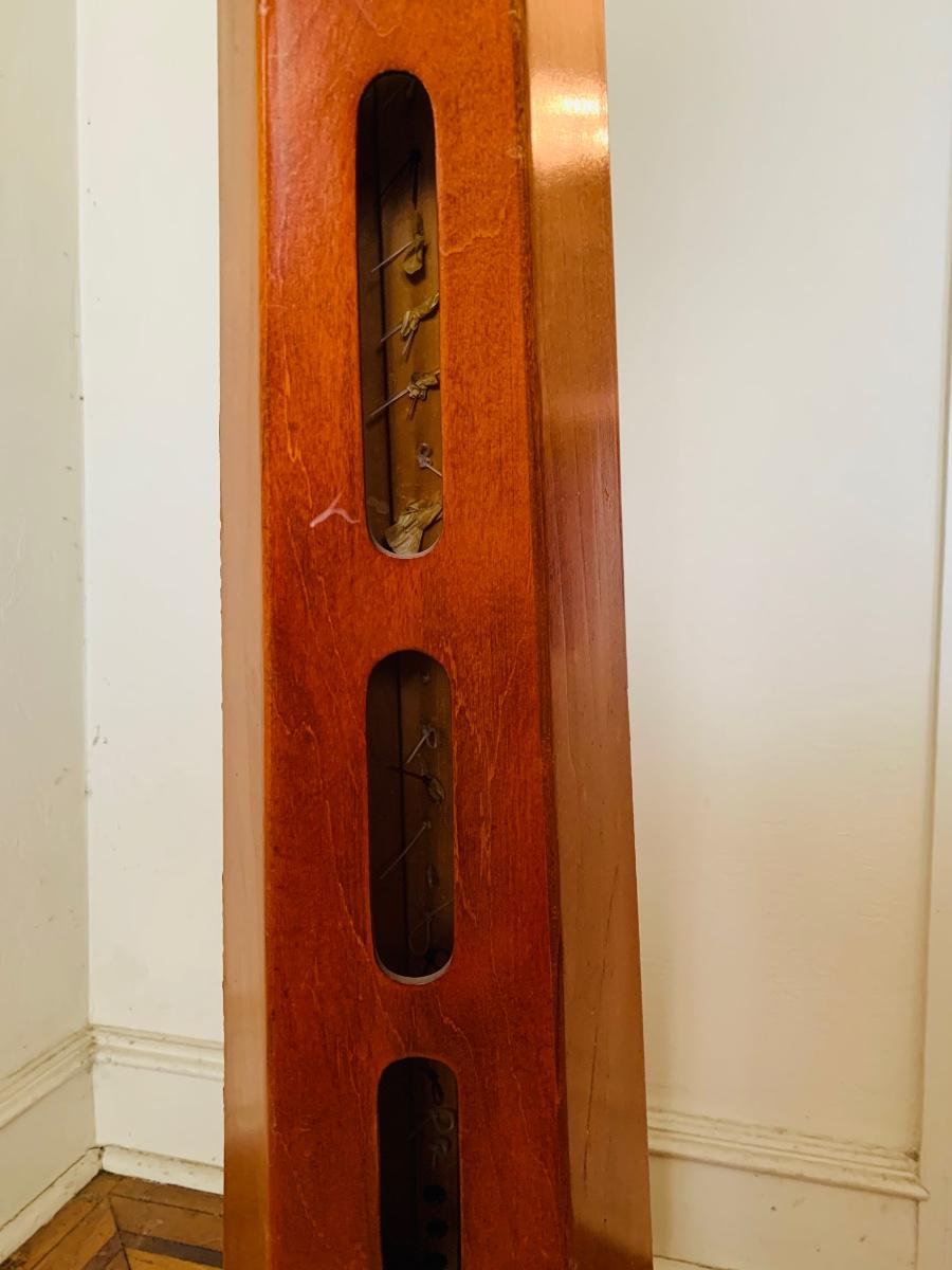 Wood shows wear in a few areas and a few missing strings however there are strings included. Overall height is approximately 65"