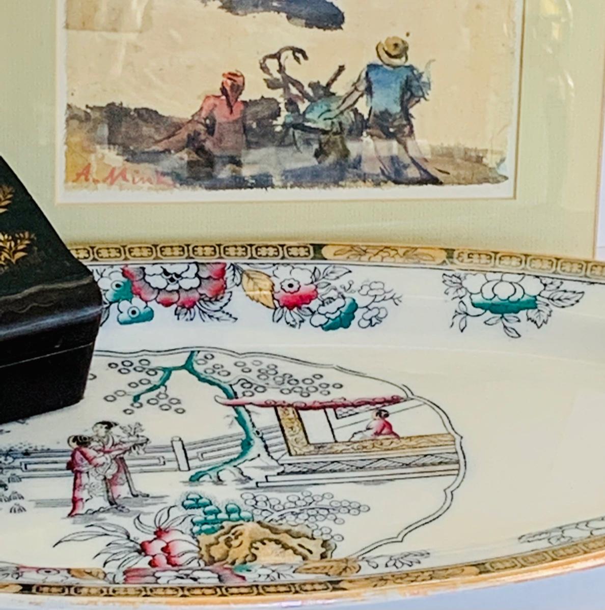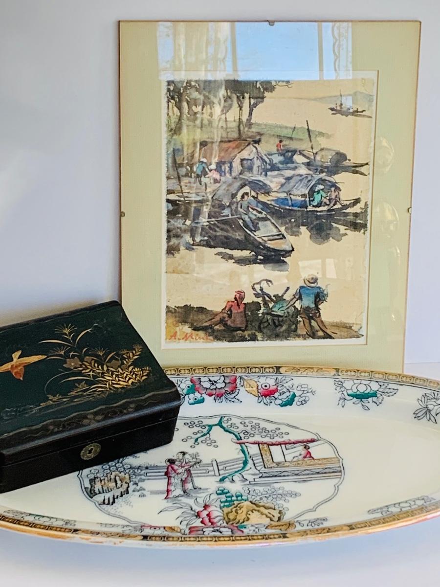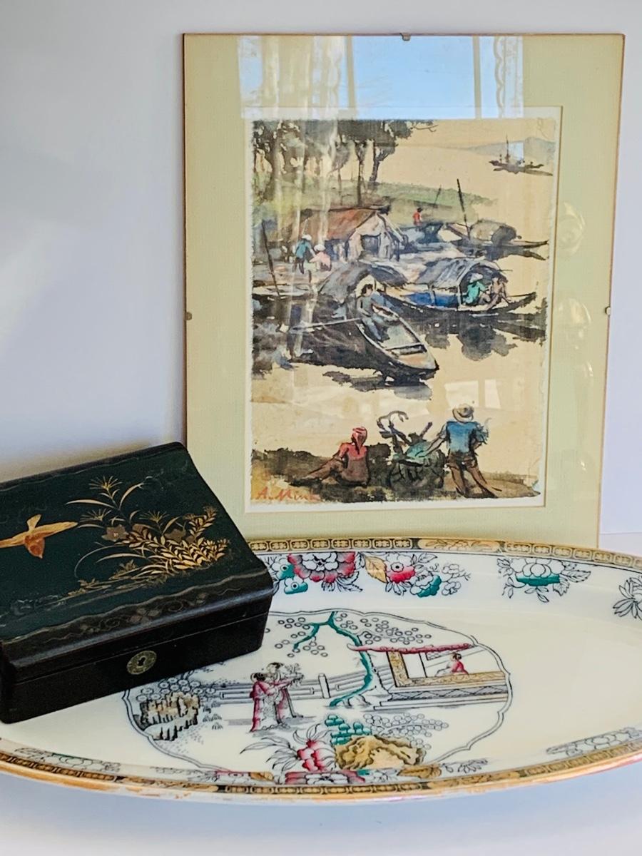 Beautiful platter and art along with a black jewelry box with inlay scene