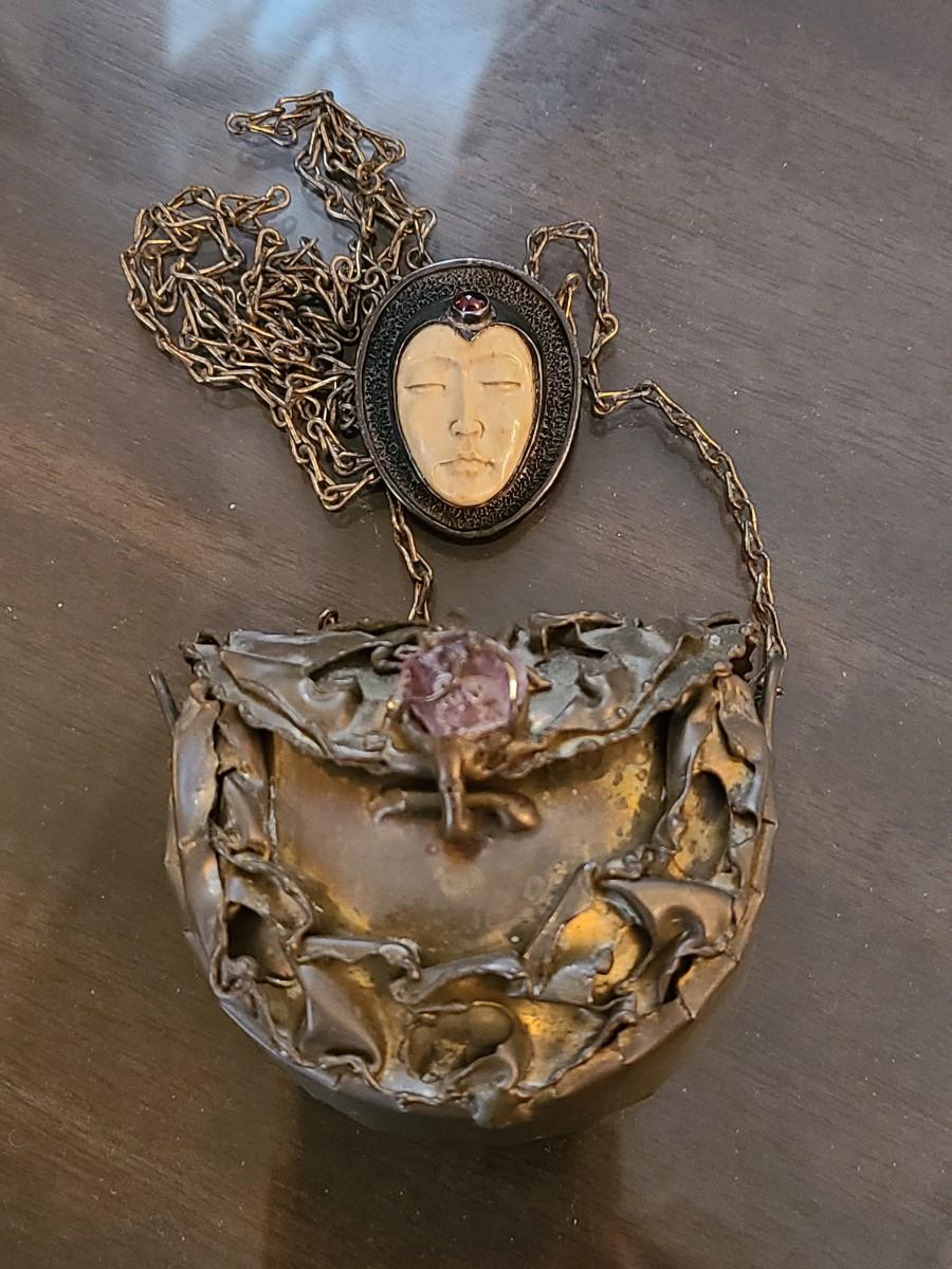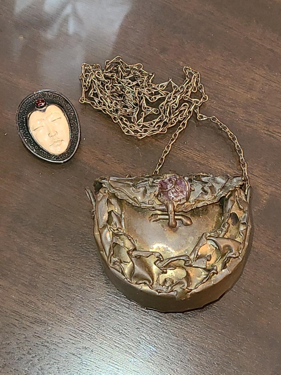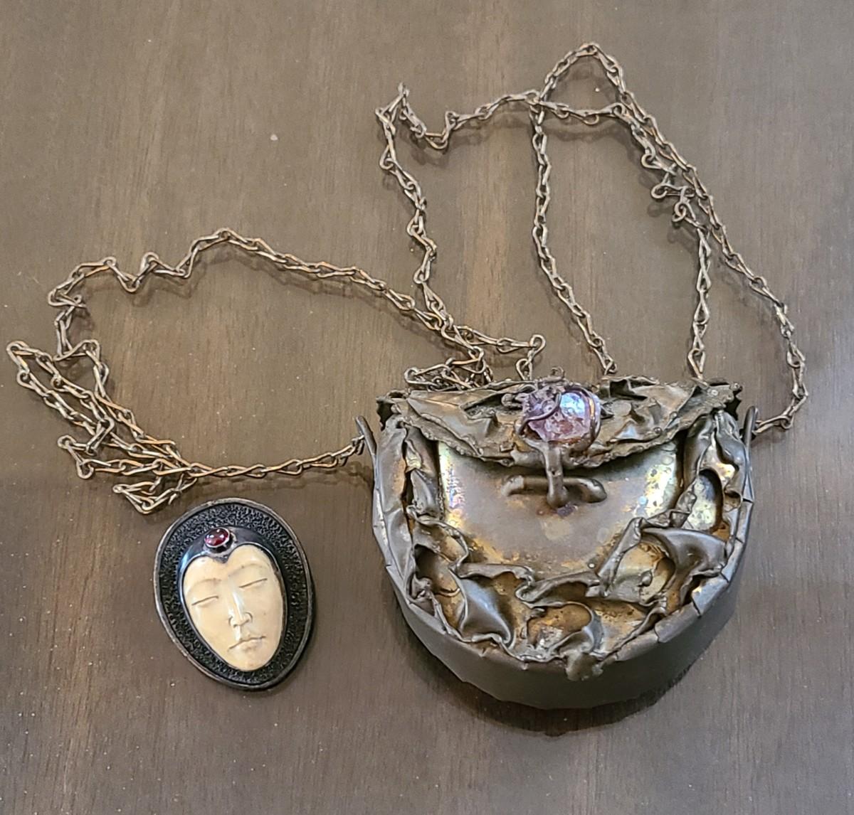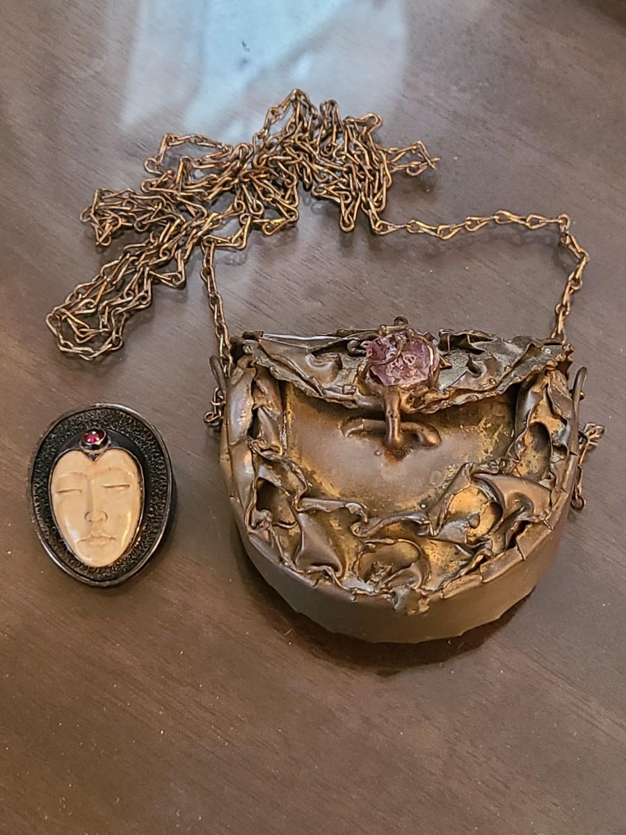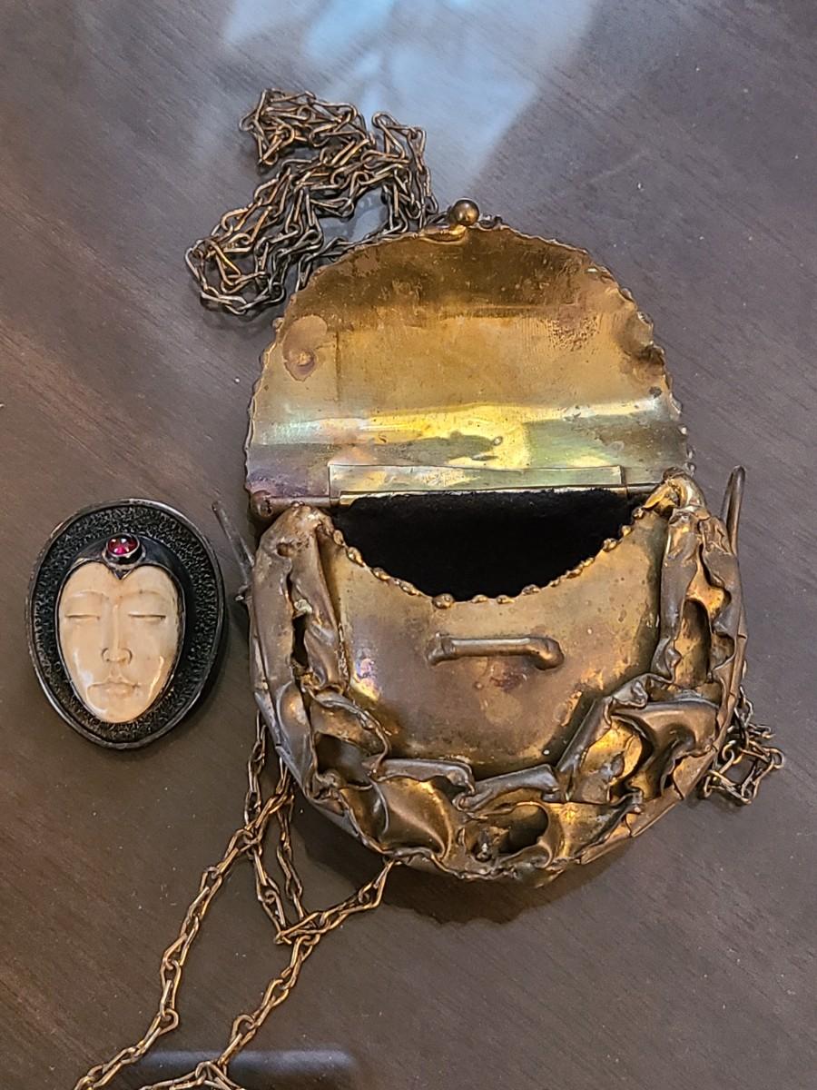 LOT: 144: Unique Sterling Silver & Bone Pendant and Mini Brutalist Bronze/Metal Purse.