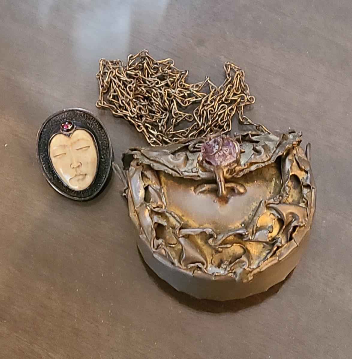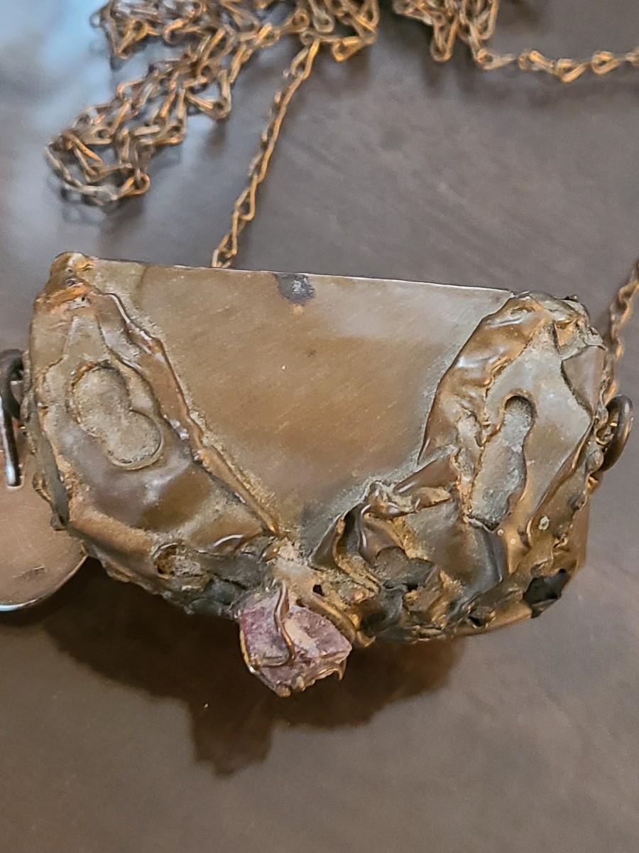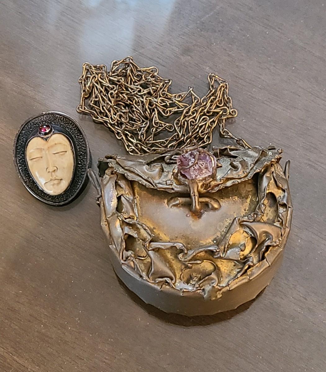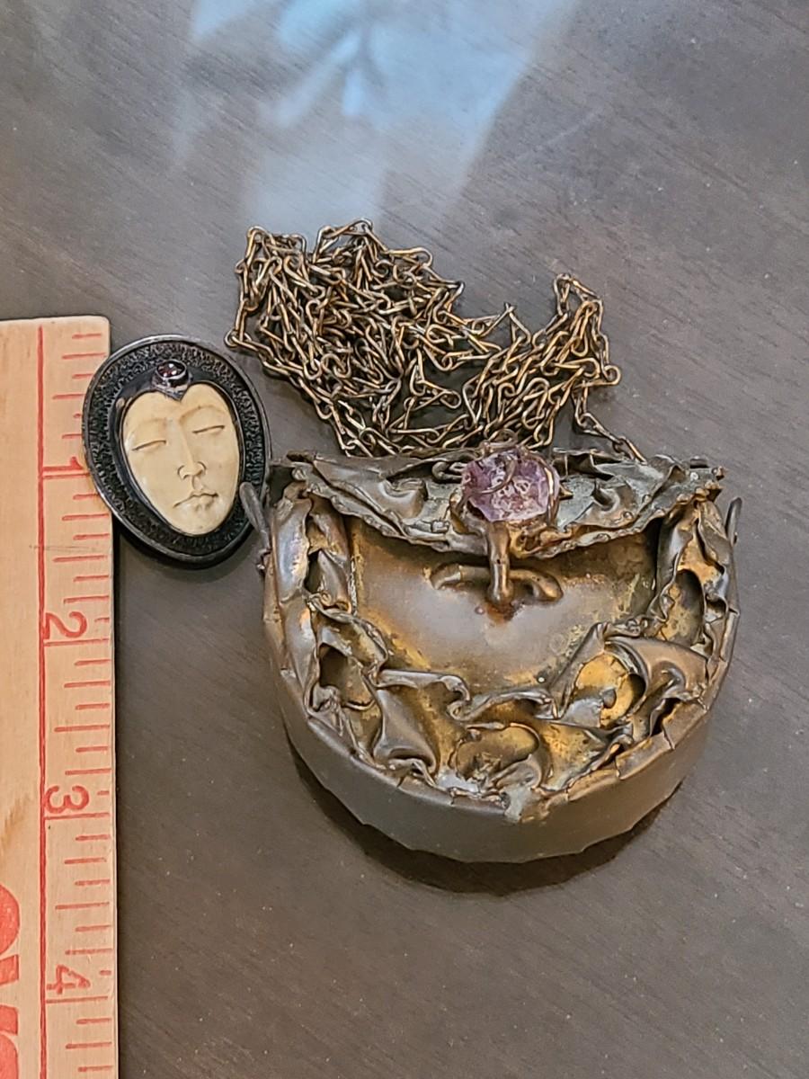 LOT: 144: Unique Sterling Silver & Bone Pendant and Mini Brutalist Bronze/Metal Purse.