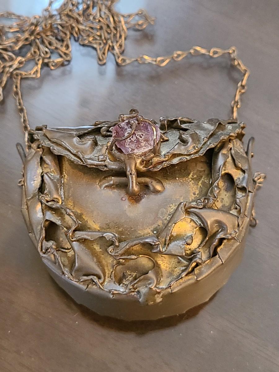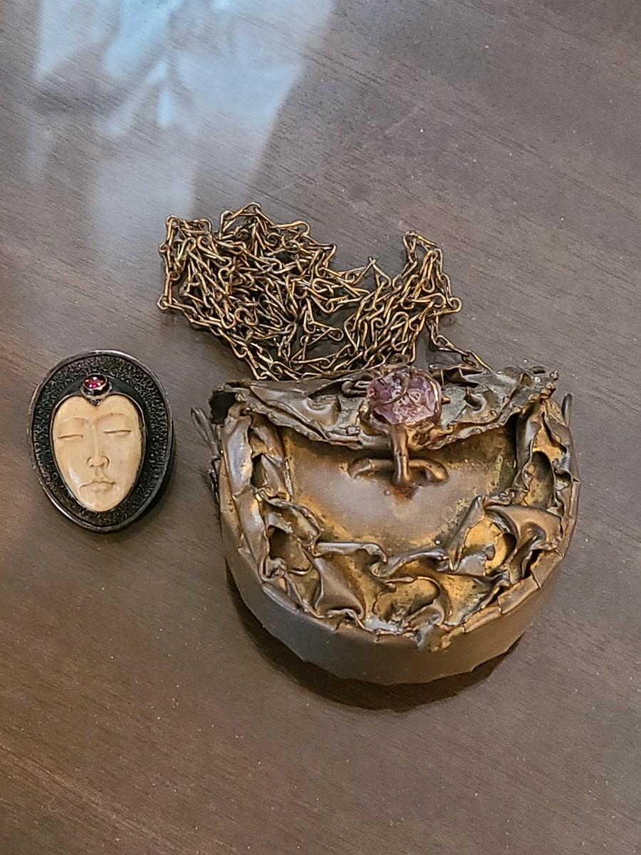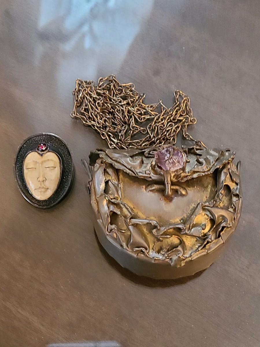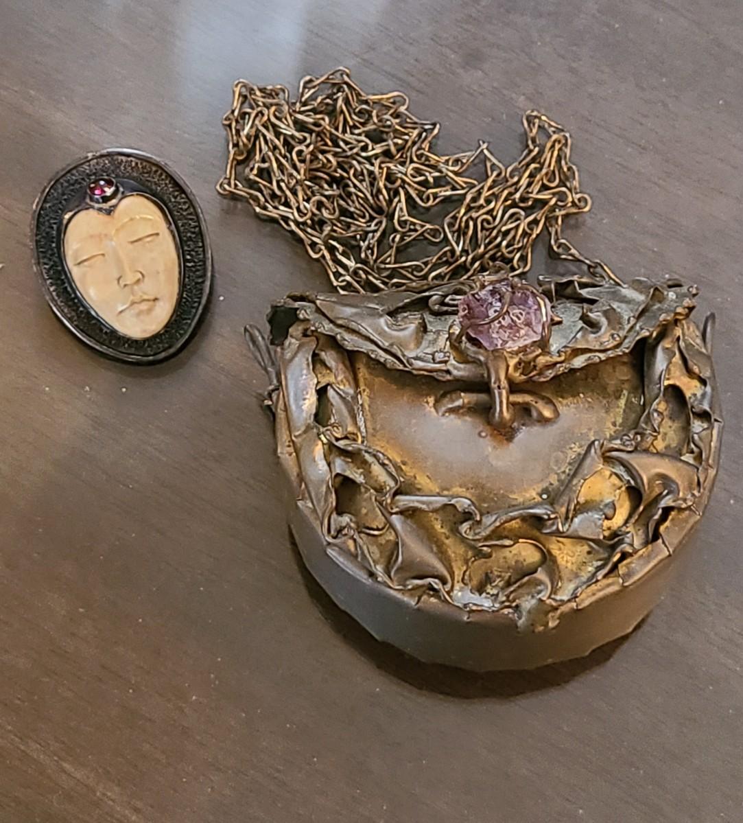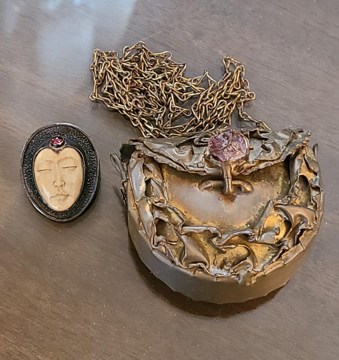 LOT: 144: Unique Sterling Silver & Bone Pendant and Mini Brutalist Bronze/Metal Purse.