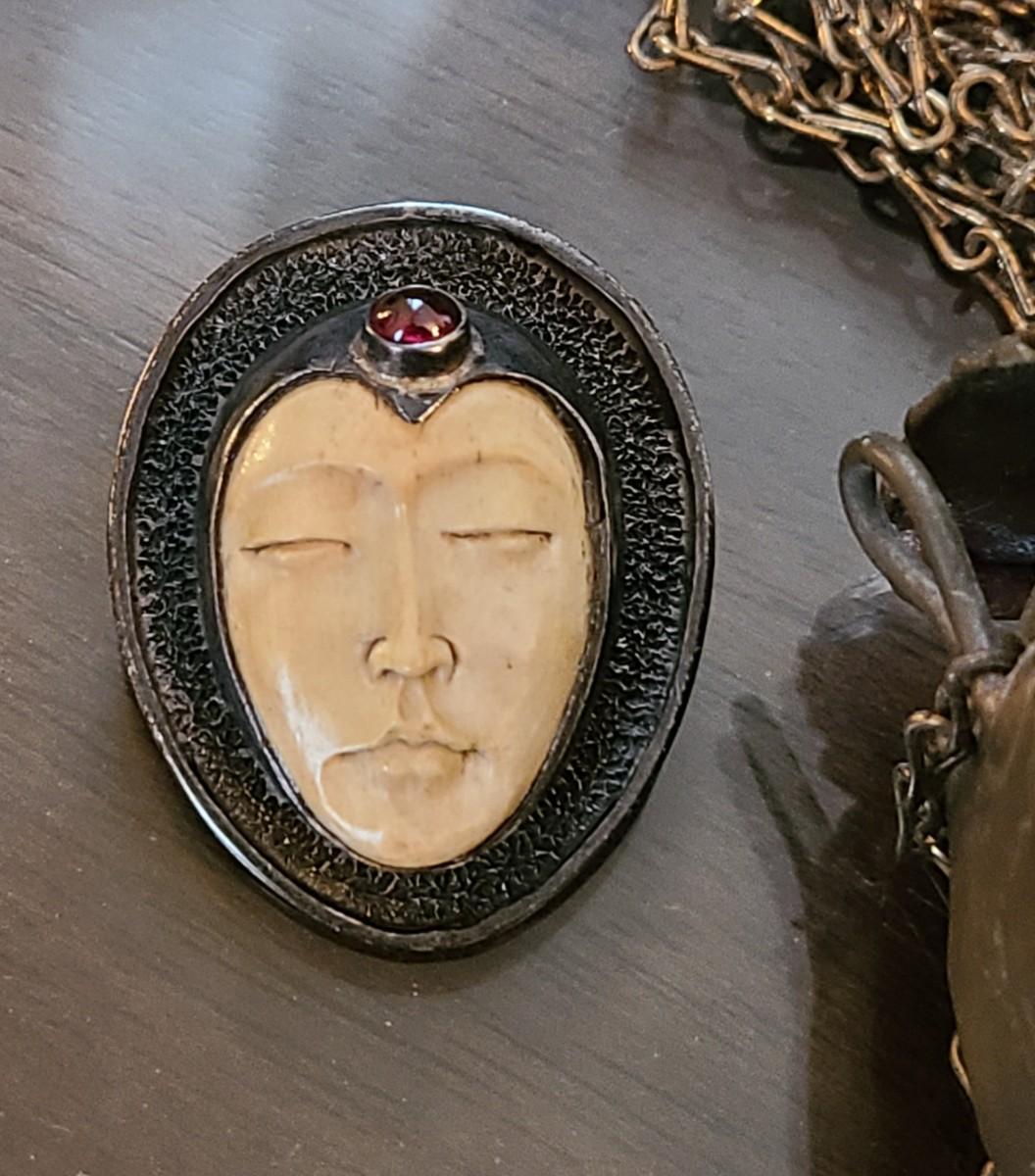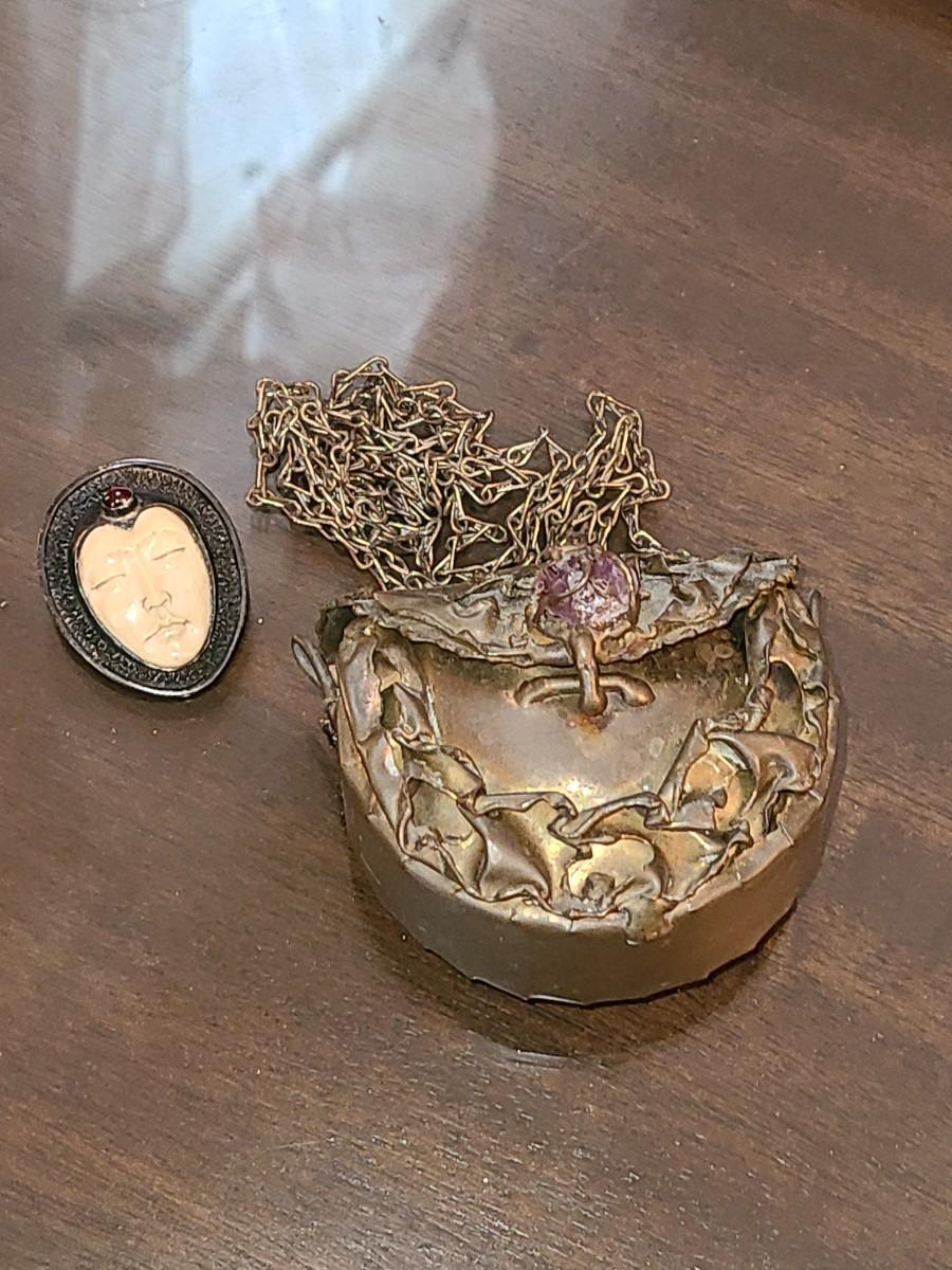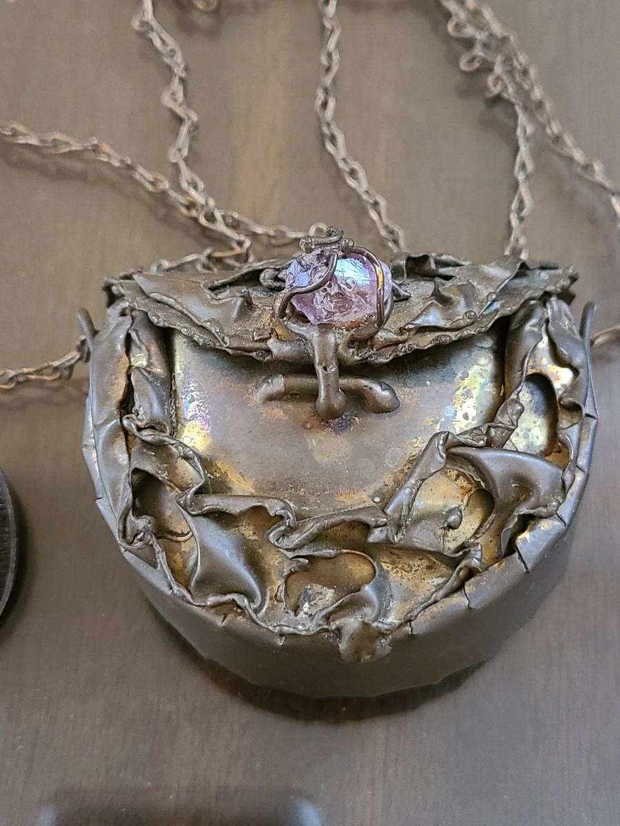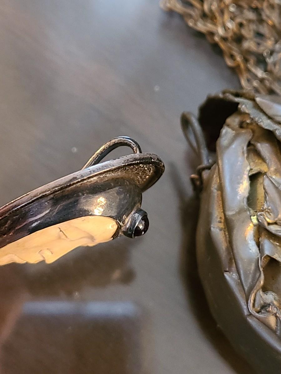 LOT: 144: Unique Sterling Silver & Bone Pendant and Mini Brutalist Bronze/Metal Purse.