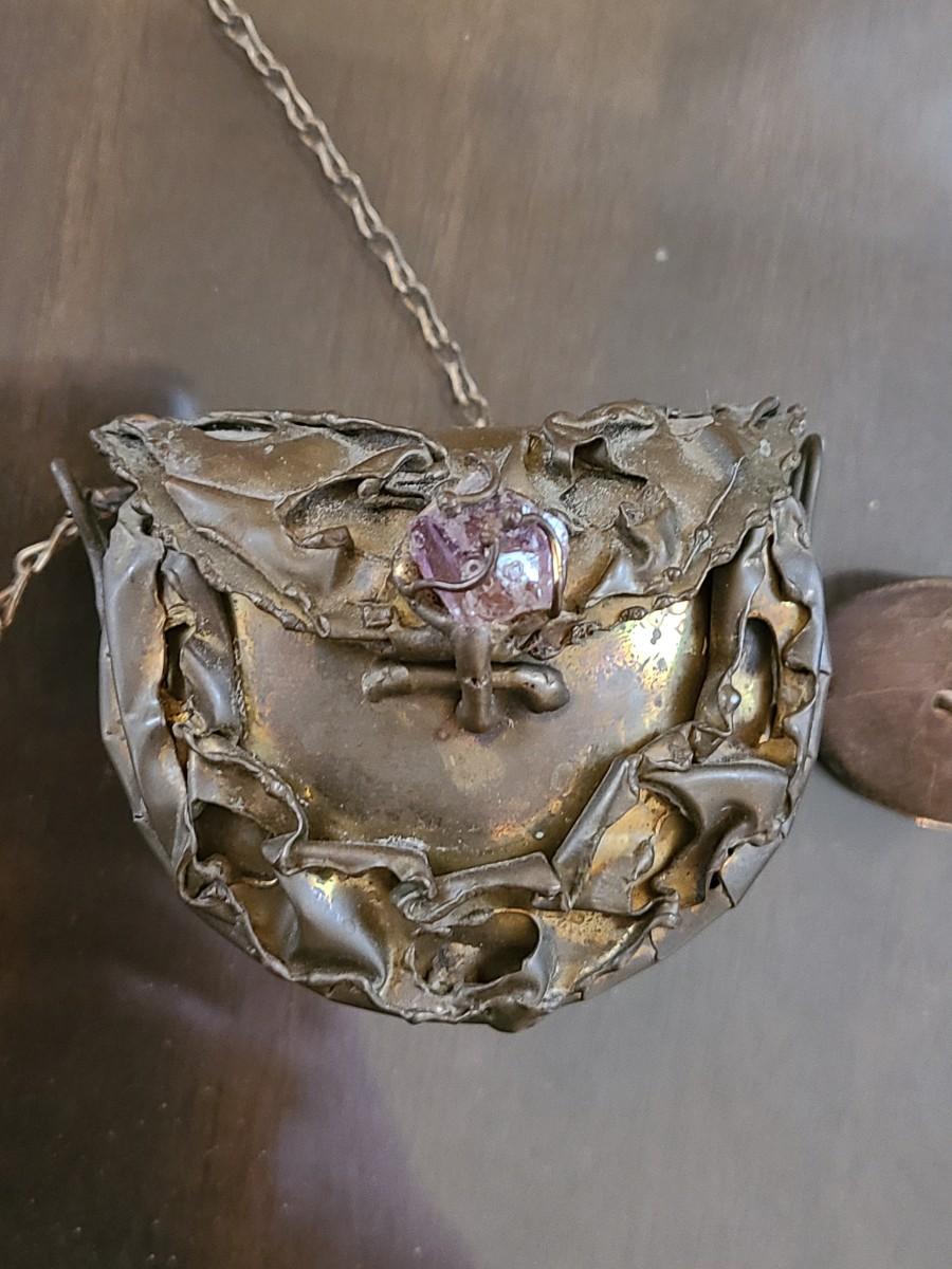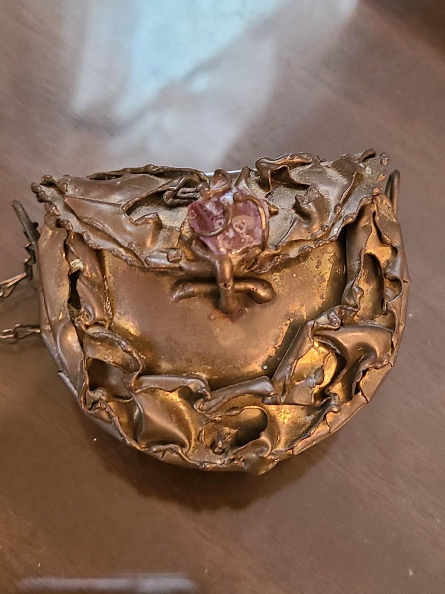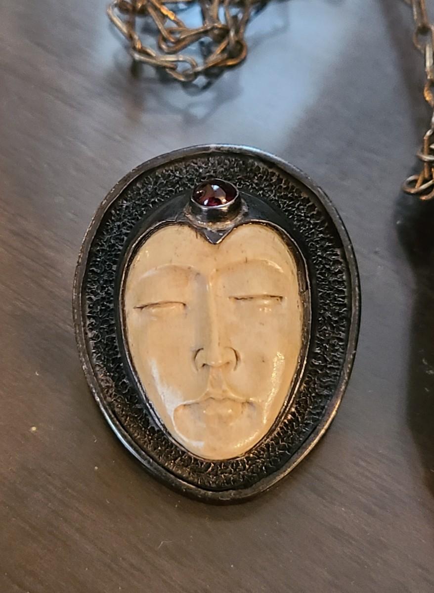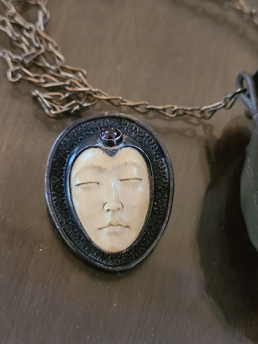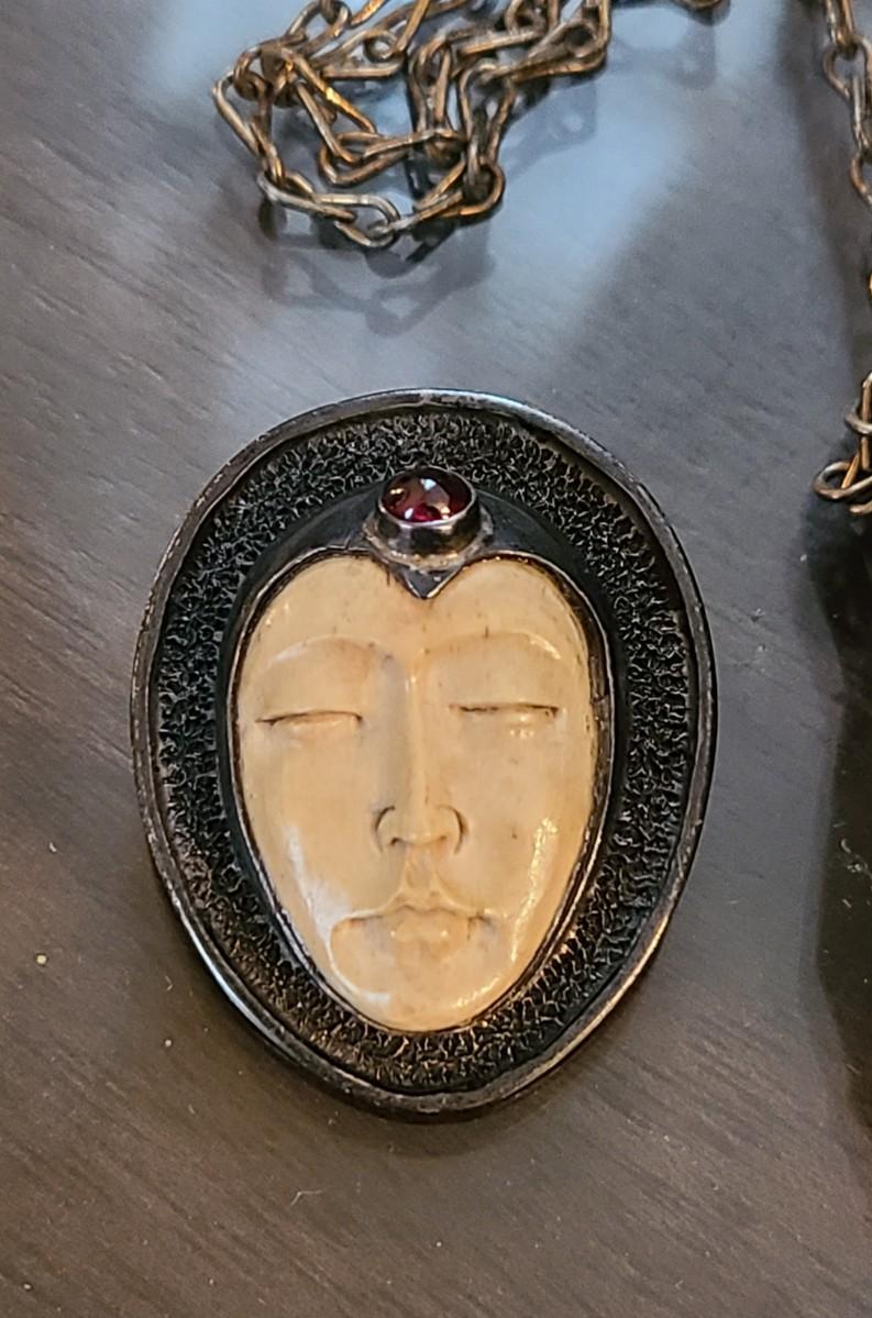 LOT: 144: Unique Sterling Silver & Bone Pendant and Mini Brutalist Bronze/Metal Purse.