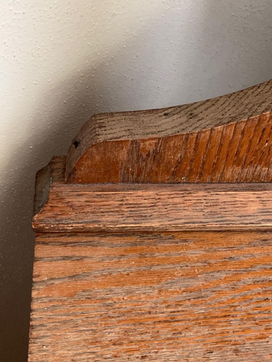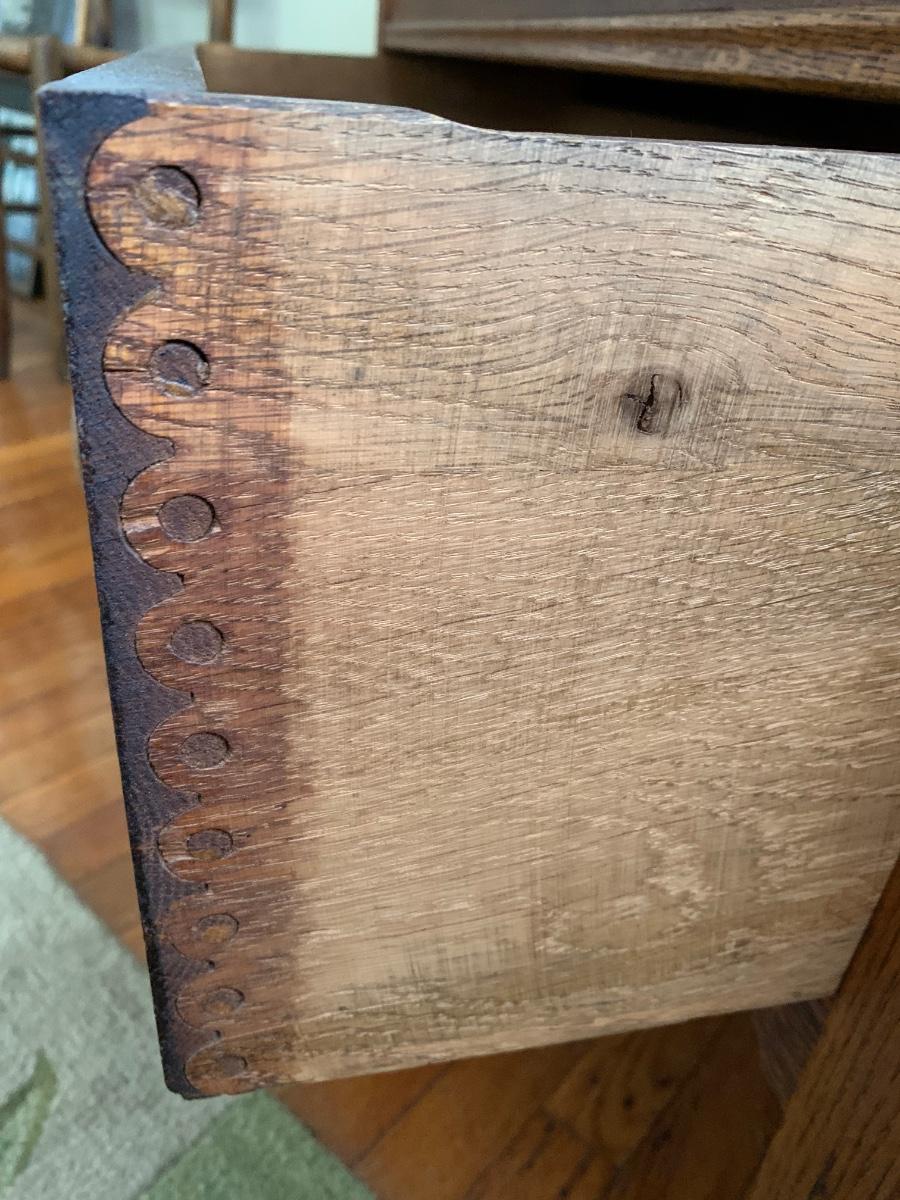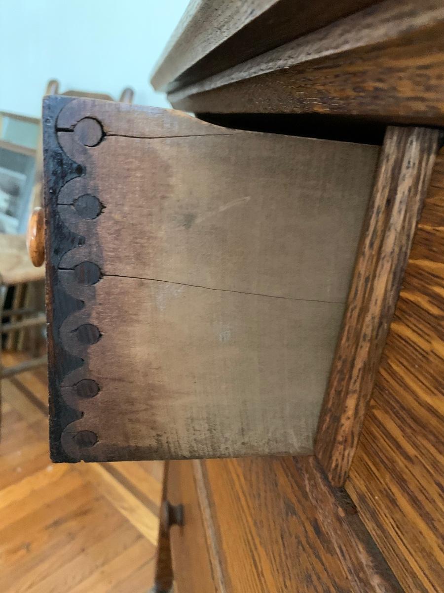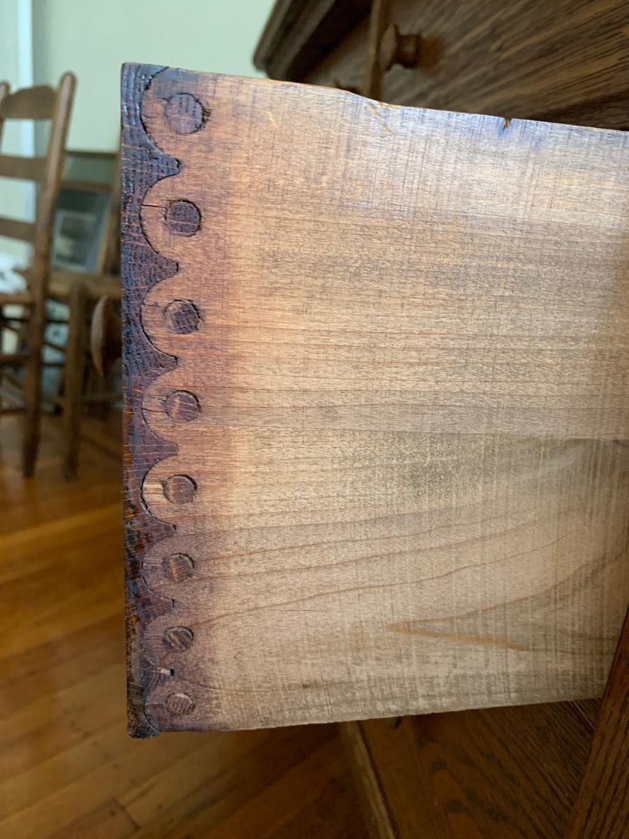This is a beautiful piece that needs a little TLC. The drawers are jointed together us The Knapp Joint also known as the pin & cove joint. It was only used for about 30 years. Its an interesting read if you have time too research...