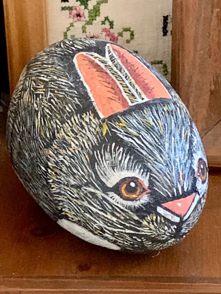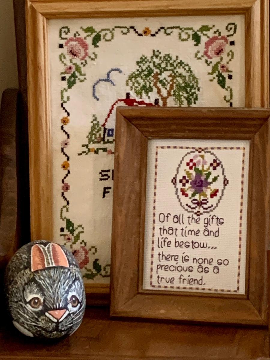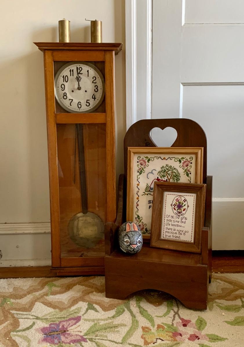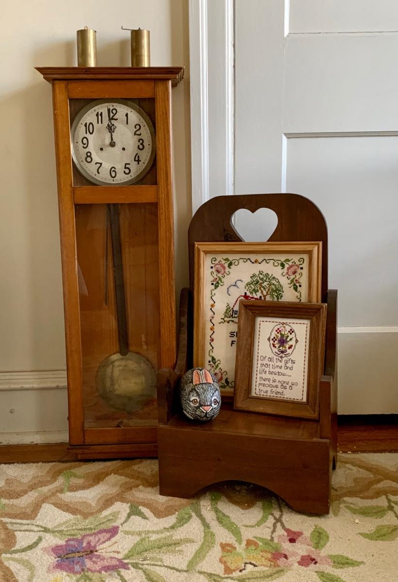 LOT 108R: Vintage Clock, Framed Cross Stich & Hand Painted Rabbit Stone & More