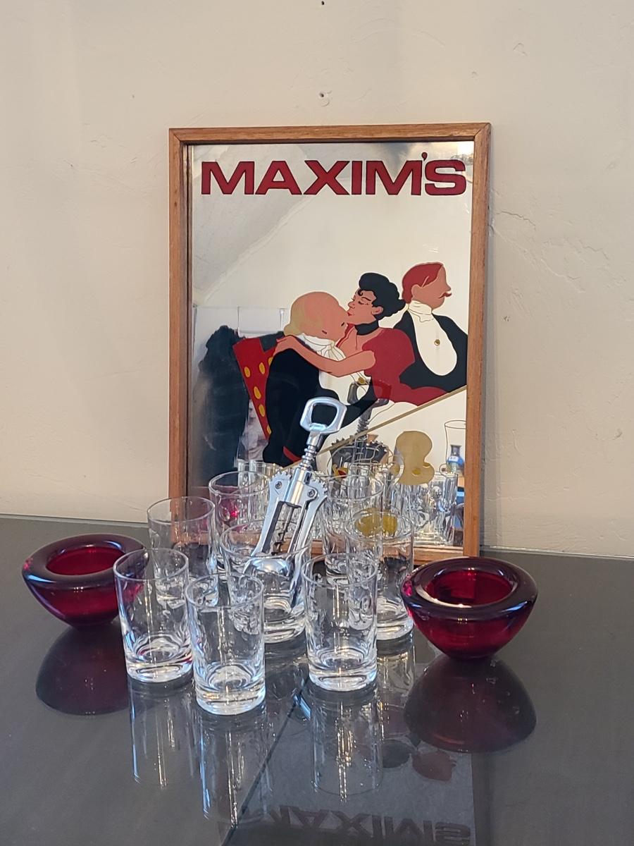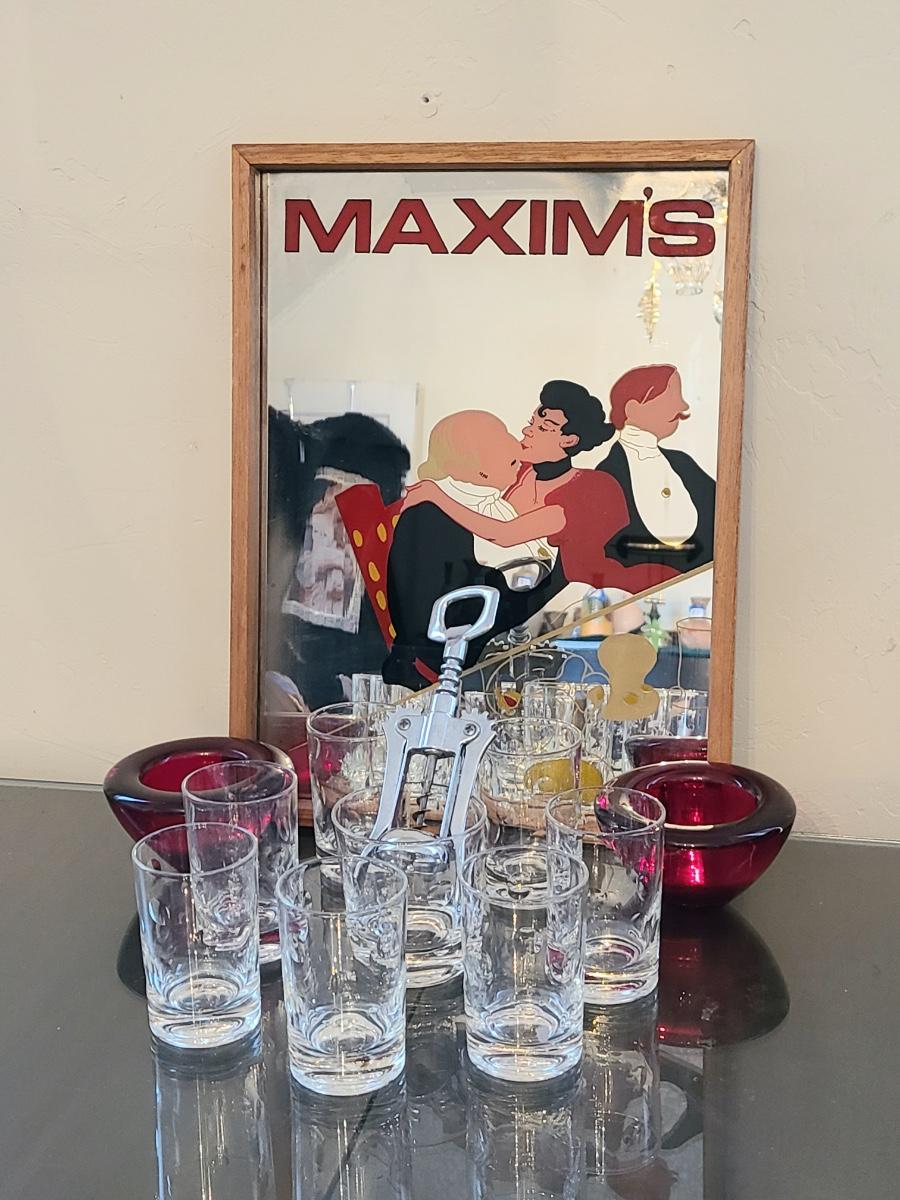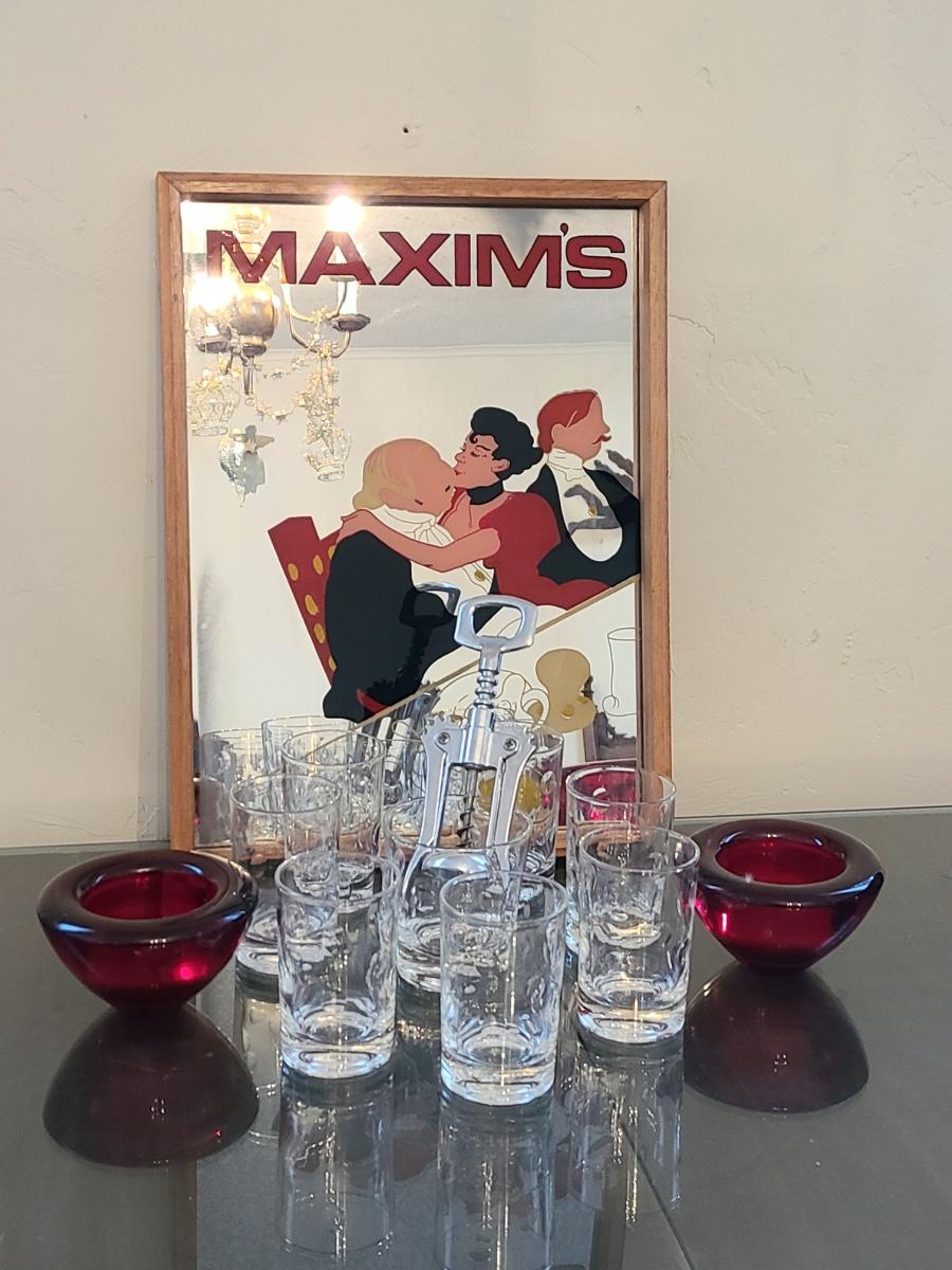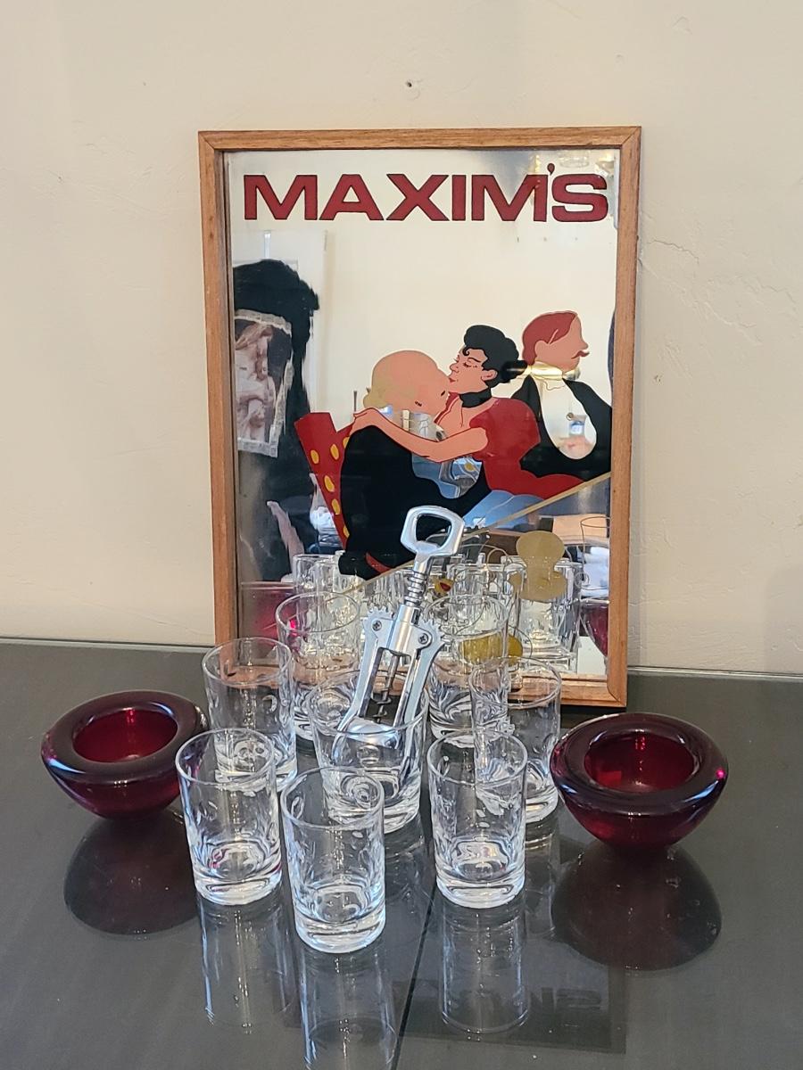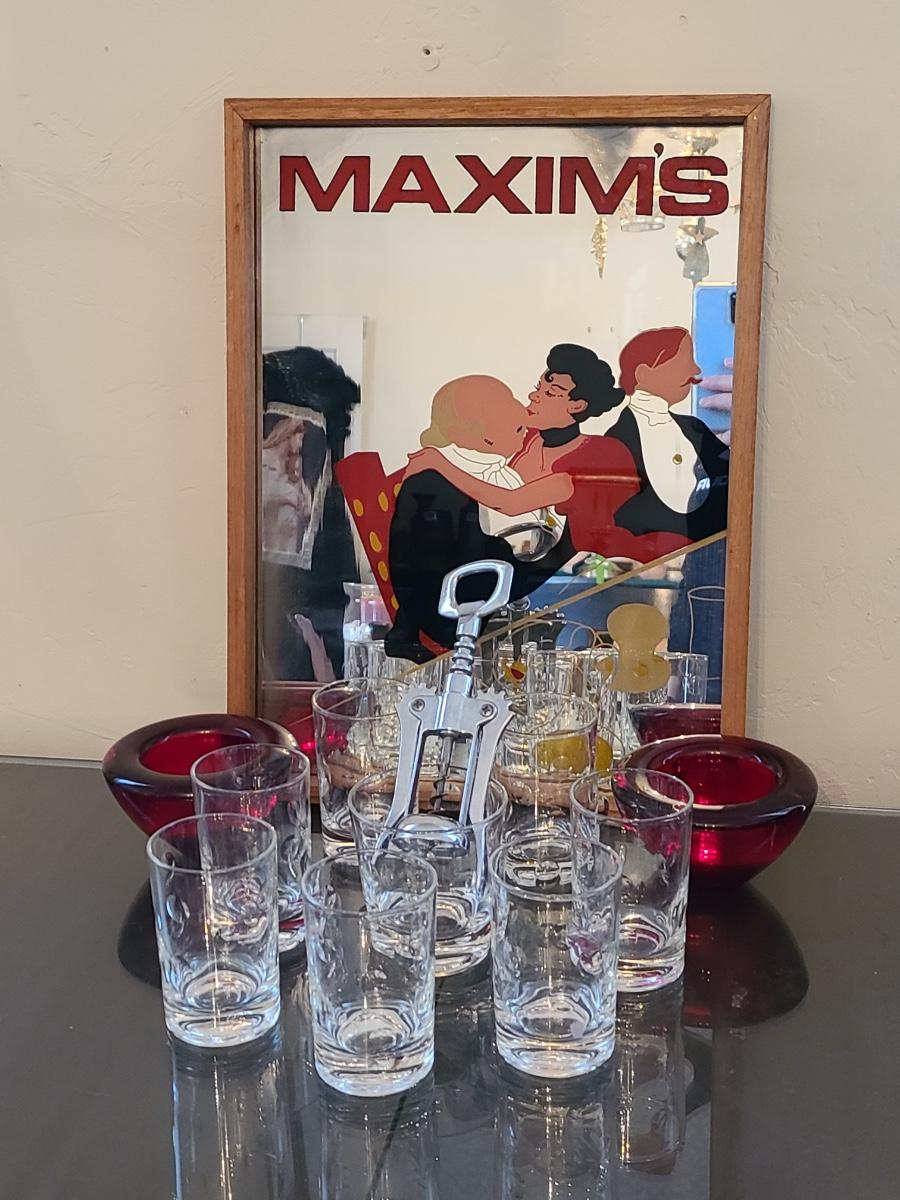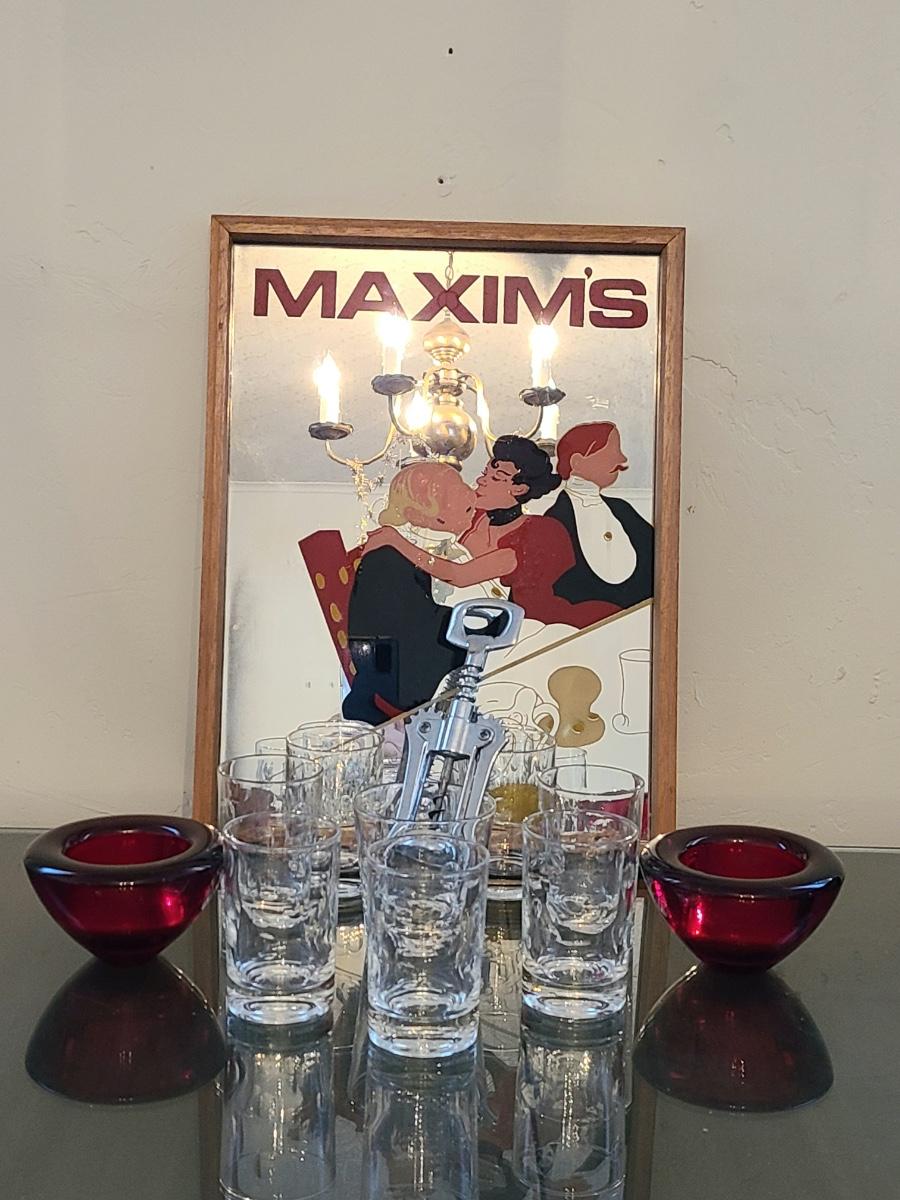 LOT 123S: Vintage "Maxims" Mirror Art, Cocktail Glasses, and Ruby Red Candle Holders