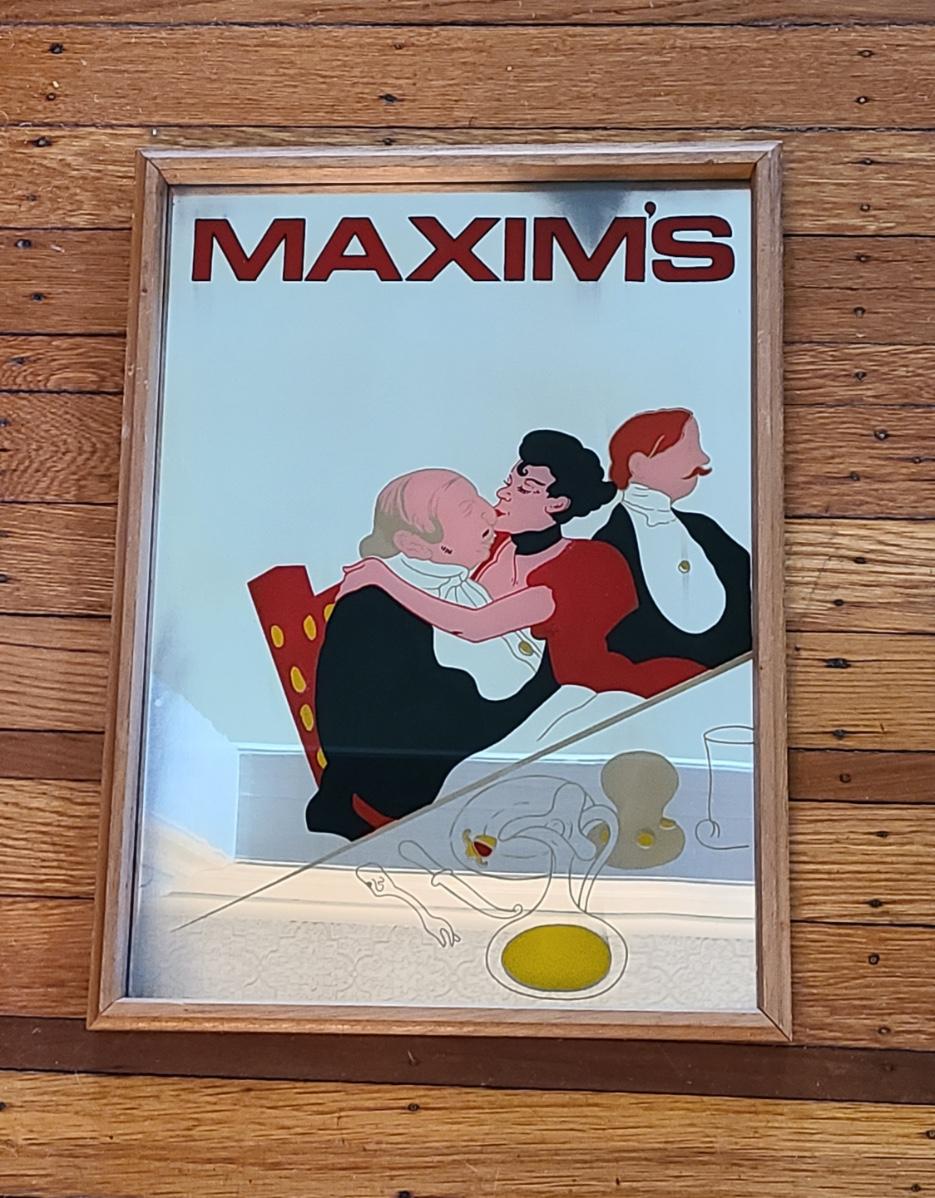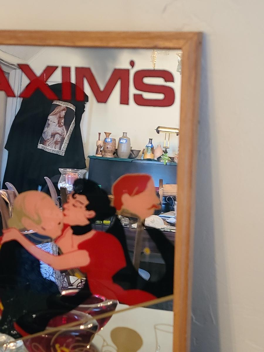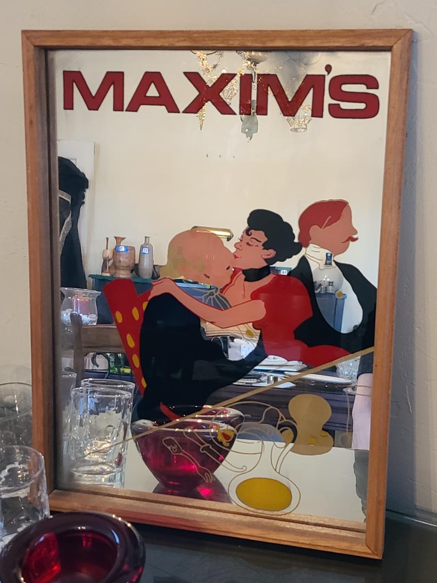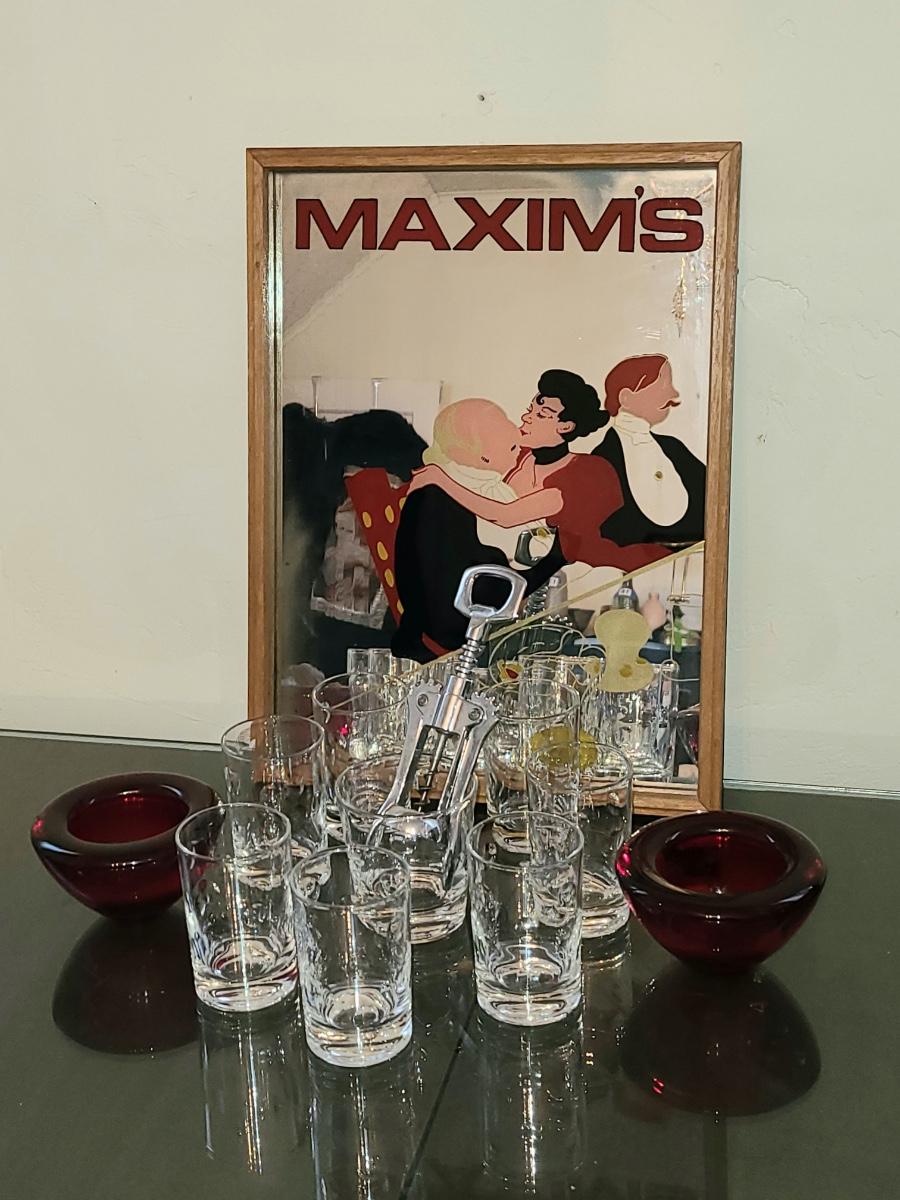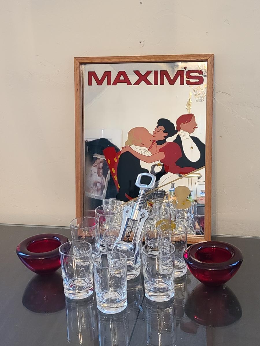 LOT 123S: Vintage "Maxims" Mirror Art, Cocktail Glasses, and Ruby Red Candle Holders