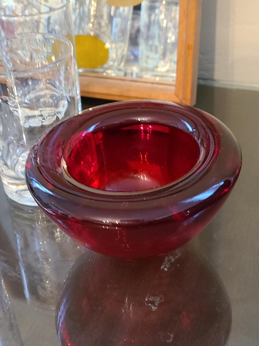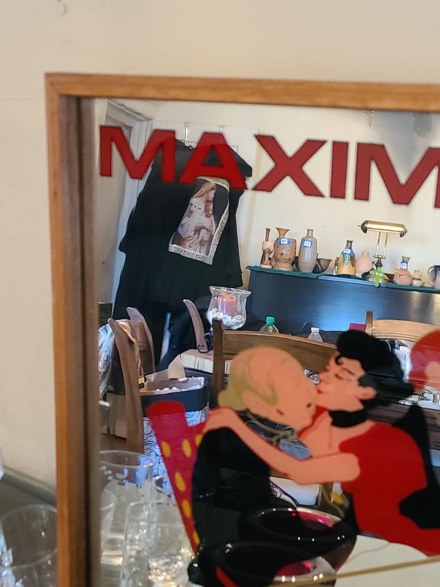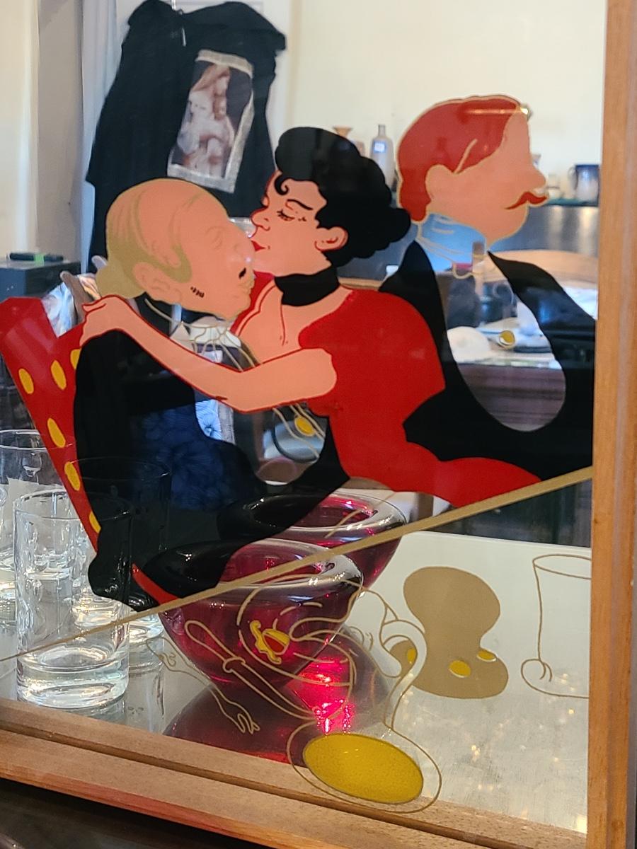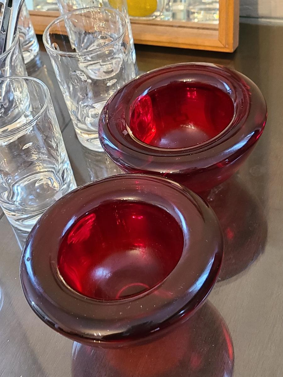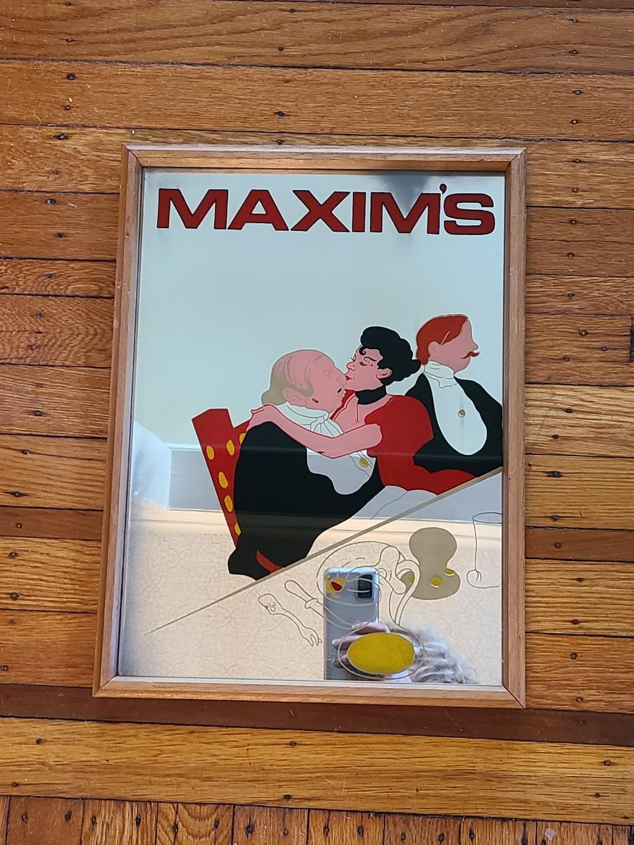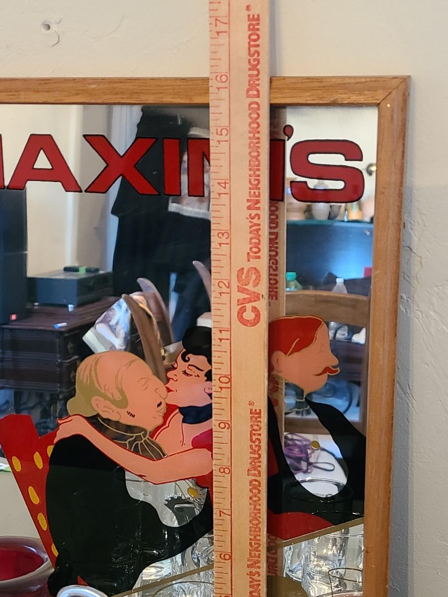 LOT 123S: Vintage "Maxims" Mirror Art, Cocktail Glasses, and Ruby Red Candle Holders