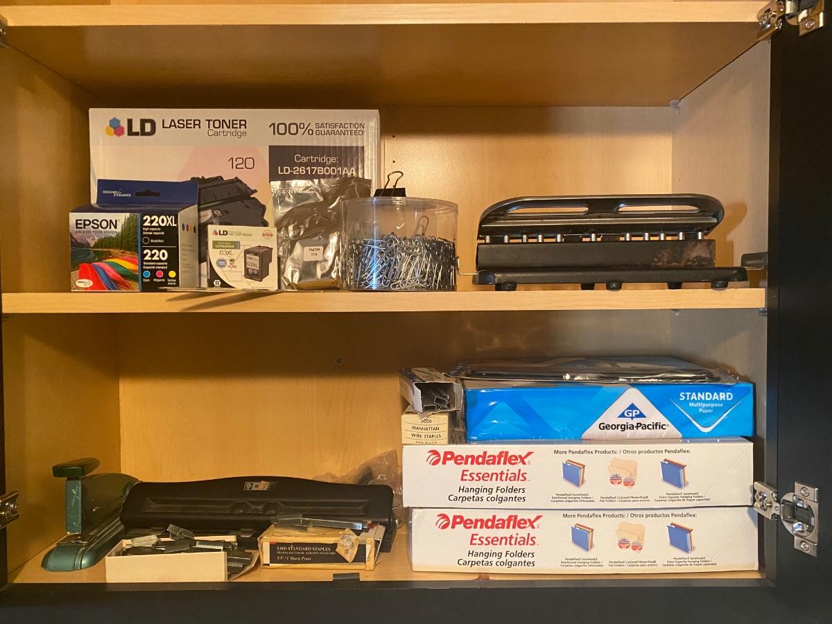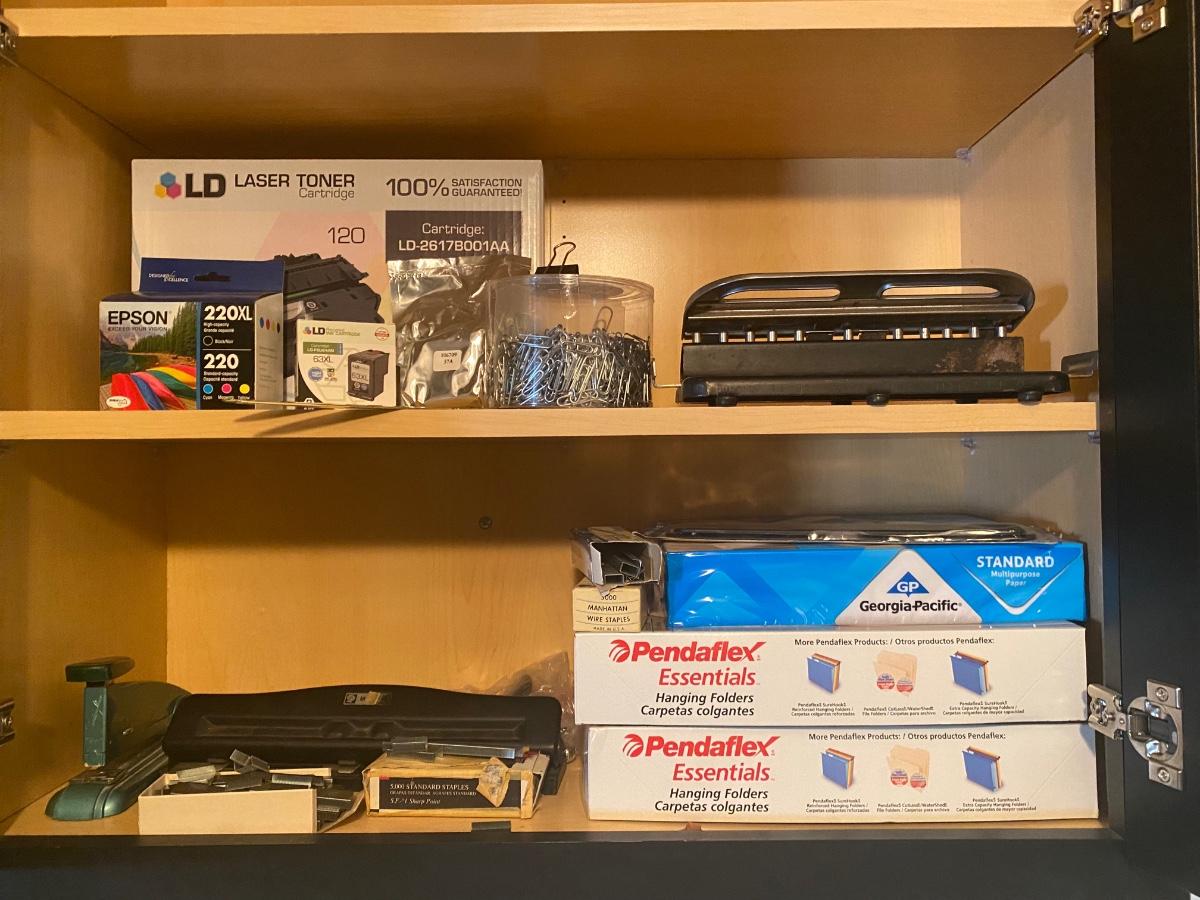 Paper shredder, Ink, Paper, hole puncher and more. Please see all pictures as they are the best representation of the items. The pictures show condition, measurements if taken, and what is included in the lot. Due to the large amount that we photograph and the time frame, we are not always able to take measurements. All items unless noted, are pre-owned and have been used. If you purchased furniture, you must bring help. We do not allow one person to carry large furniture out on their own. Bring help, tools and a truck for the safety of our client’s homes, and your personal safety. Any damages that result to the property including walls, and floors due to moving of the furniture will be charged to the buyer. Company policy. Thank you.