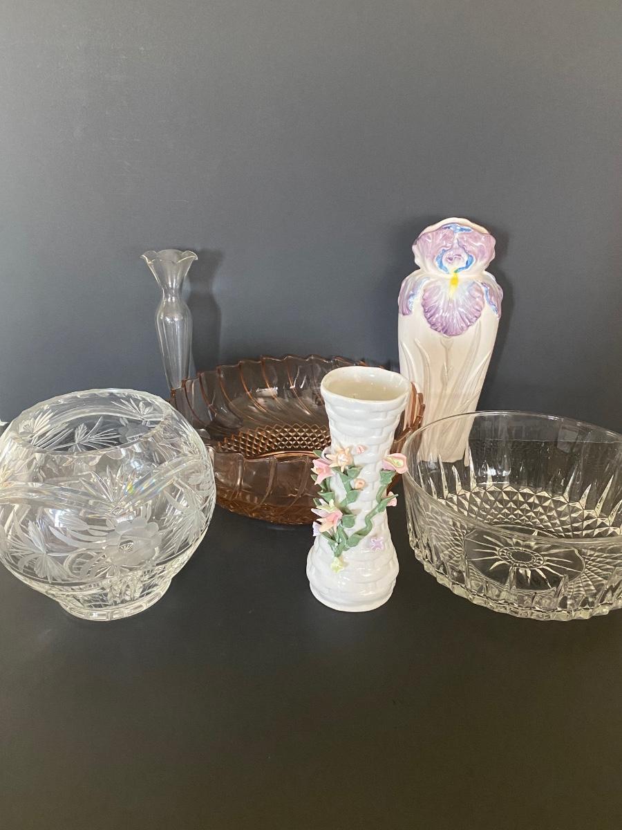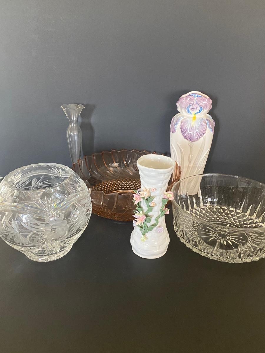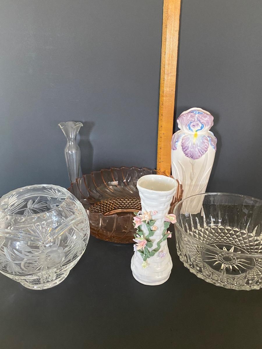 Two clear cut glass bowls. Pink glass bowl. Glass vase and two floral design vases. Please see all pictures as they are the best representation of the items. The pictures show condition, measurements if taken, and what is included in the lot. Due to the large amount that we photograph and the time frame, we are not always able to take measurements. All items unless noted, are pre-owned and have been used. If you purchased furniture, you must bring help. We do not allow one person to carry large furniture out on their own. Bring help, tools and a truck for the safety of our client’s homes, and your personal safety. Any damages that result to the property including walls, and floors due to moving of the furniture will be charged to the buyer. Company policy. Thank you.