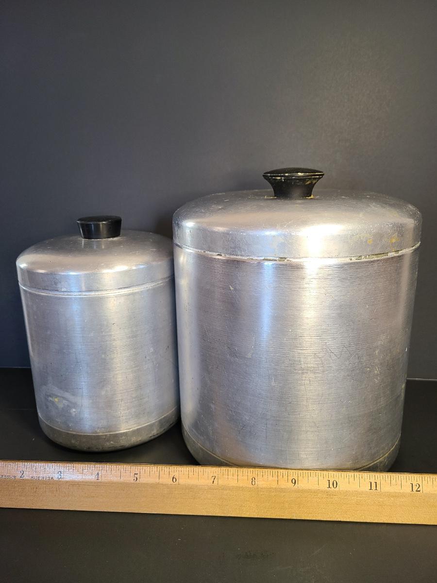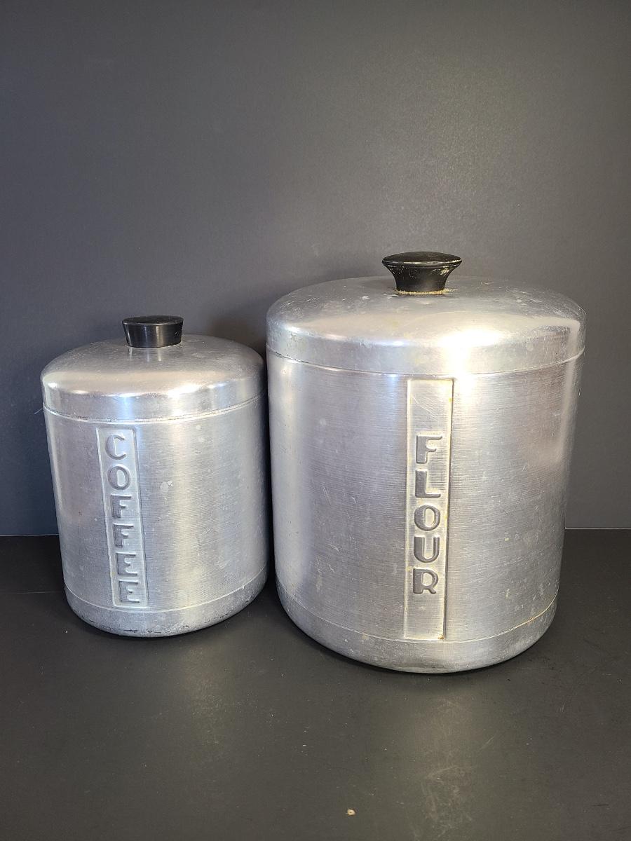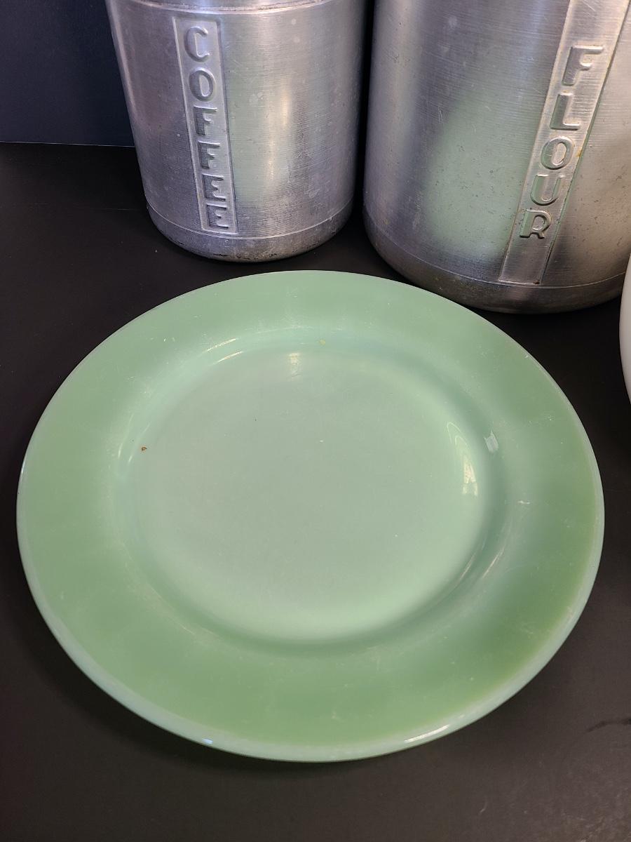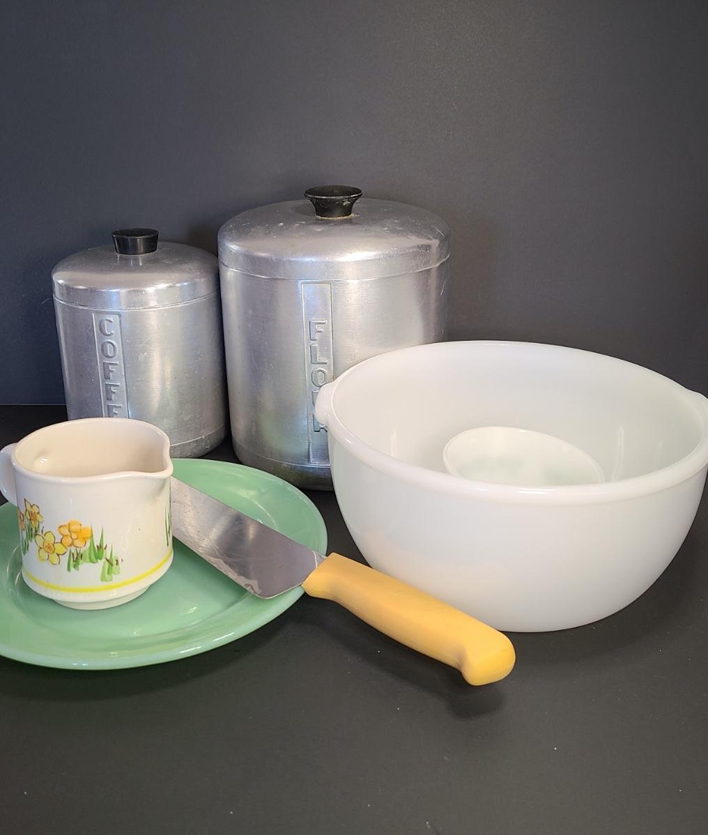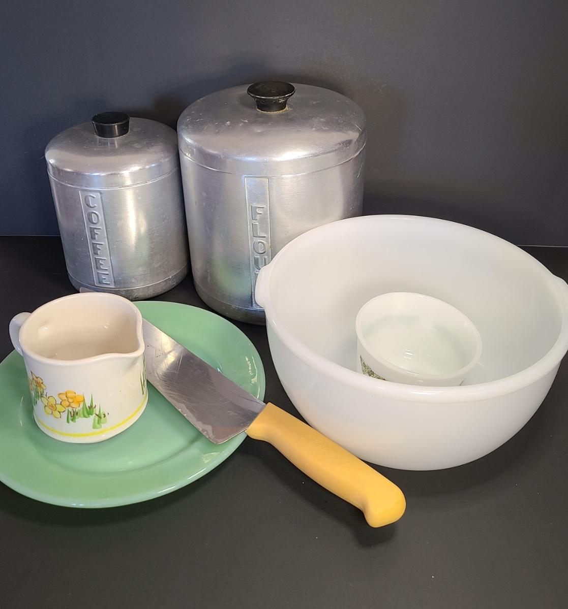 LOT 77S: Vintage Kitchen: Aluminum Canisters, Sunbeam Mixing Bowl, Jadeite Plate and More