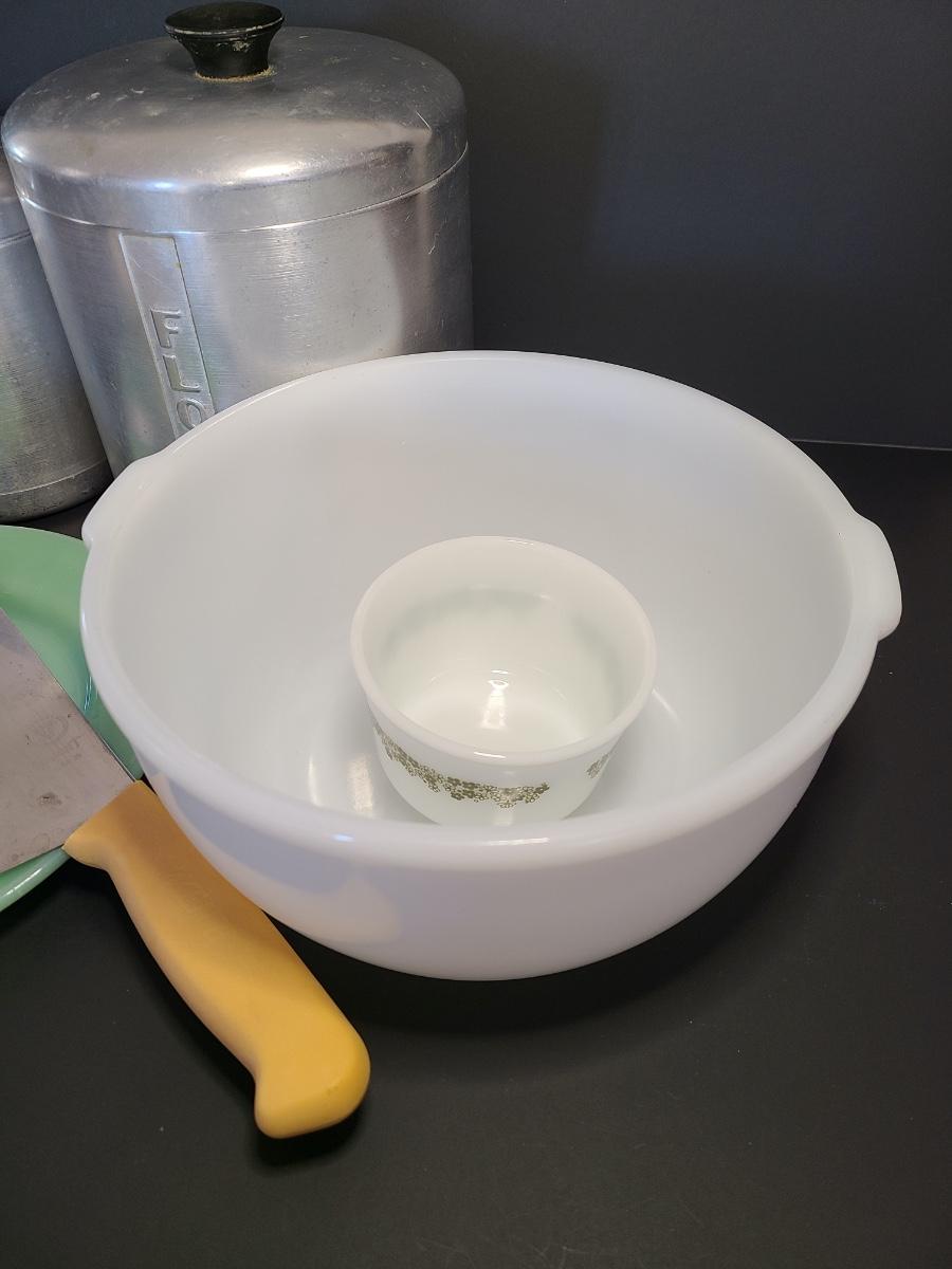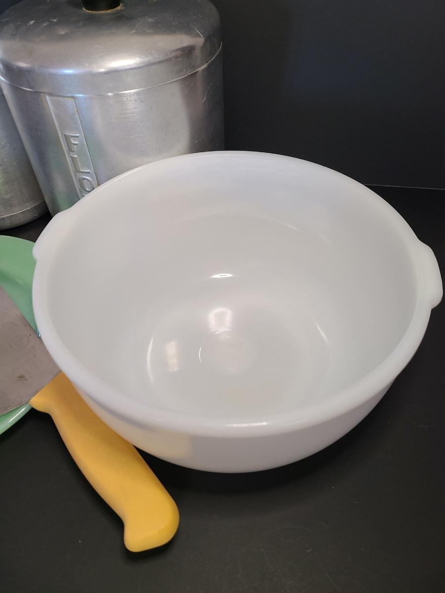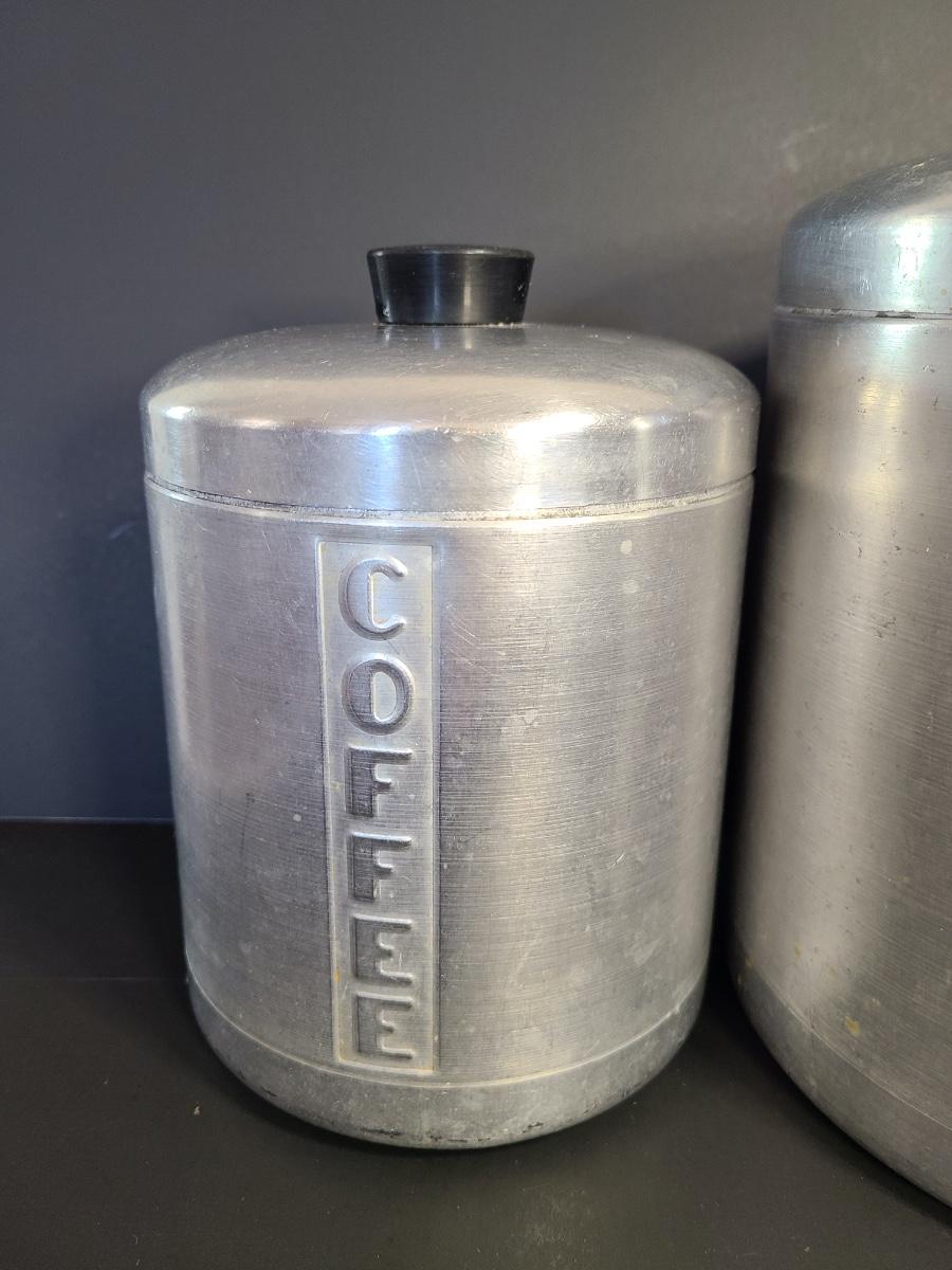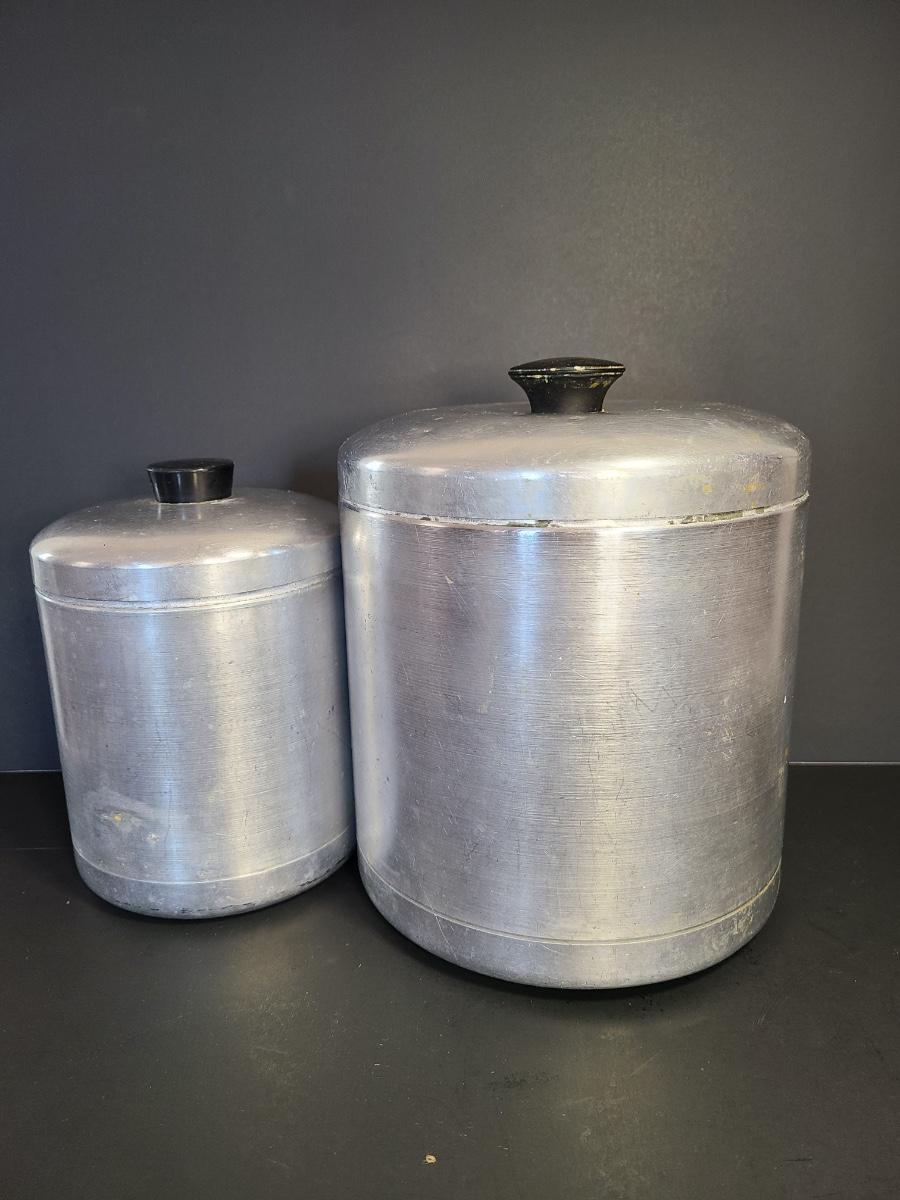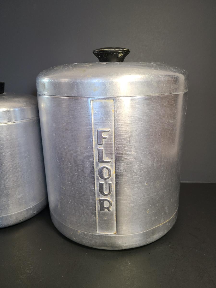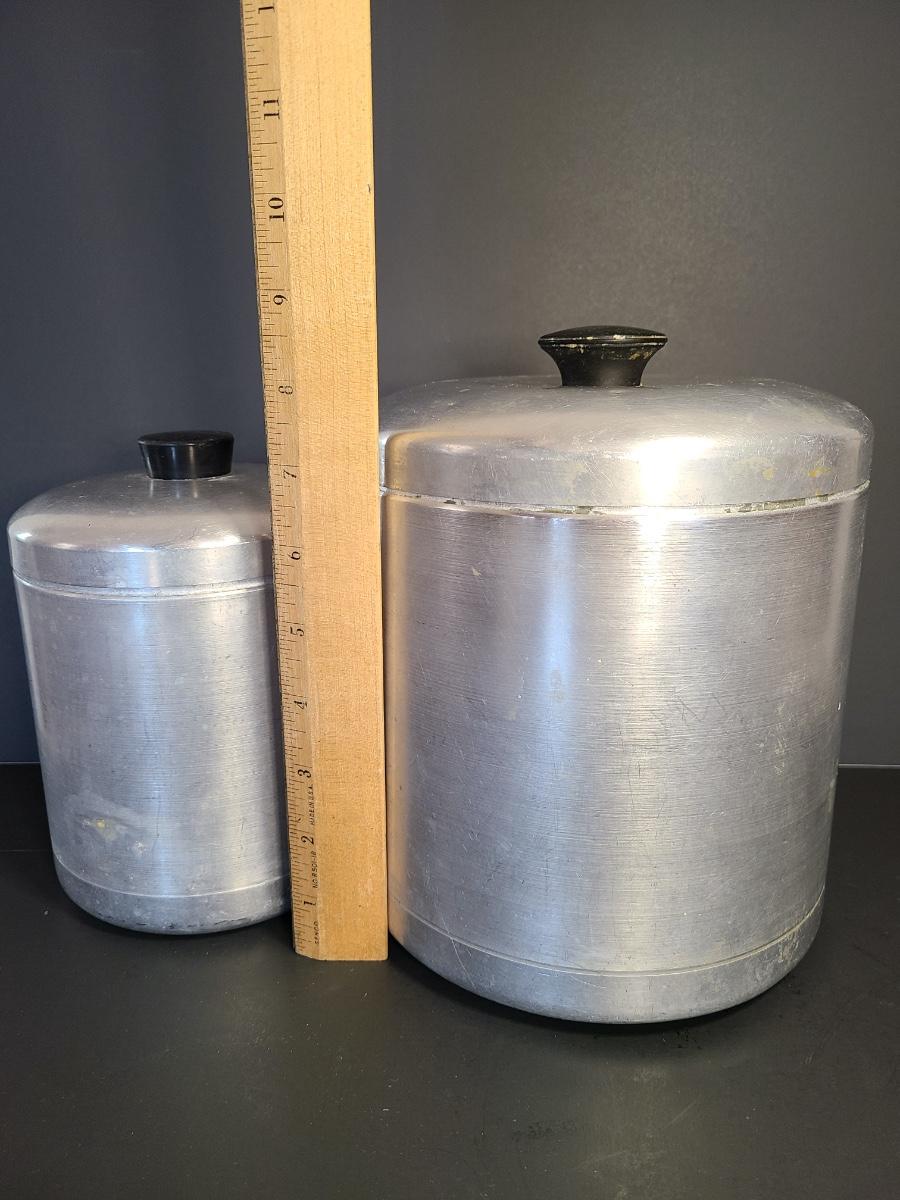 LOT 77S: Vintage Kitchen: Aluminum Canisters, Sunbeam Mixing Bowl, Jadeite Plate and More
