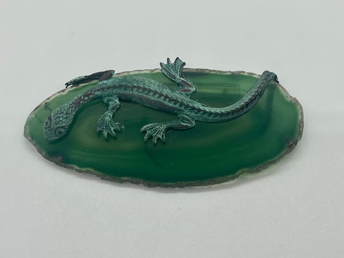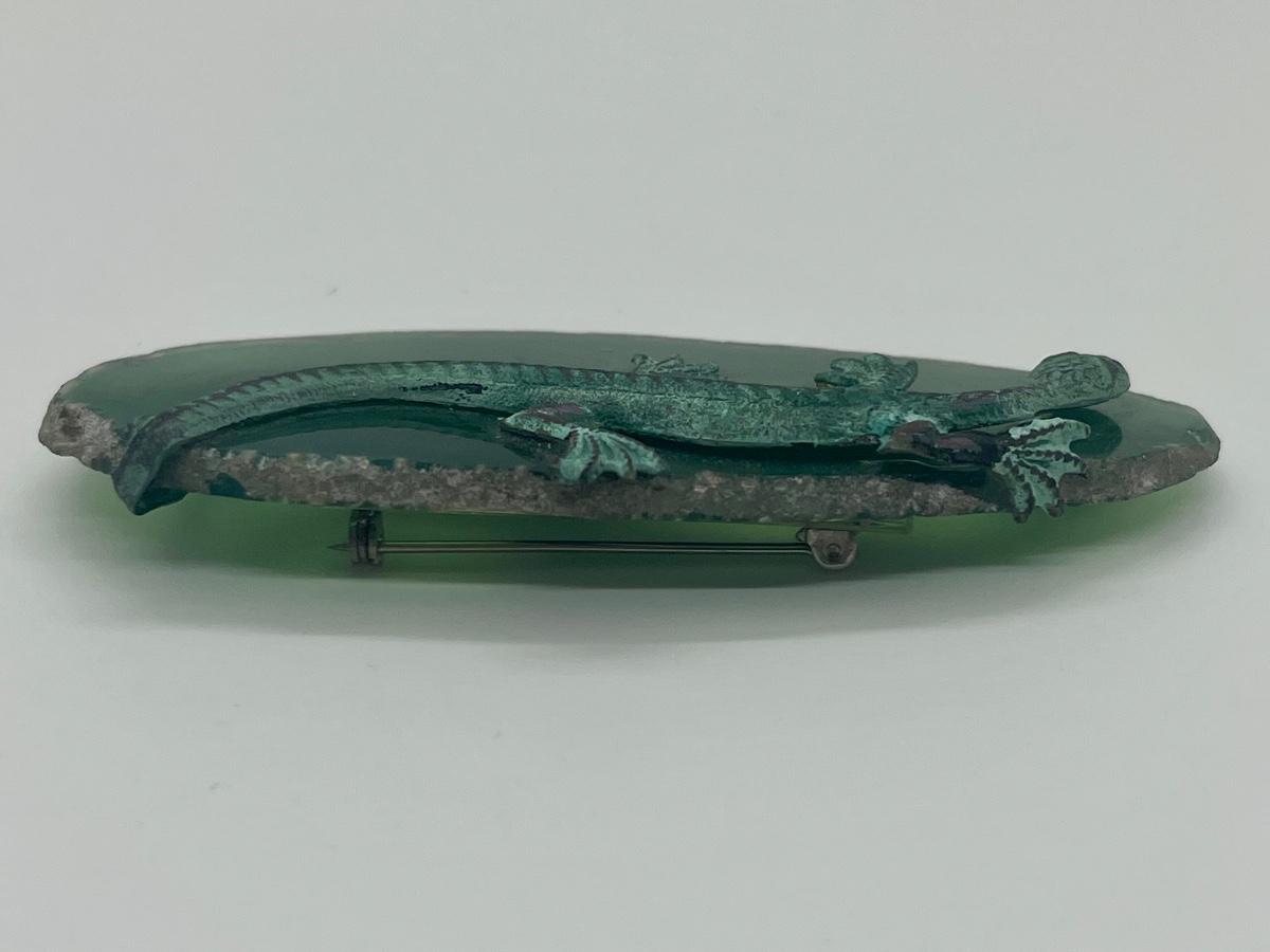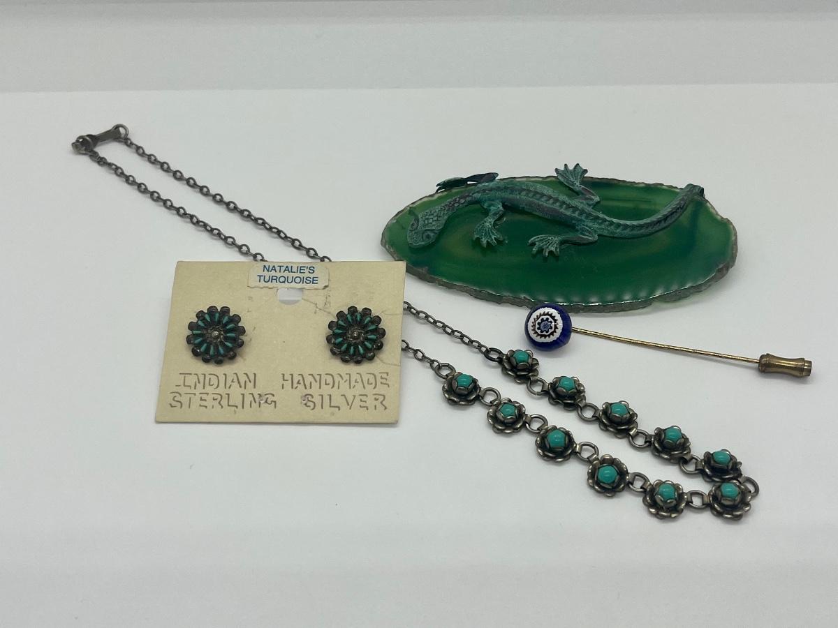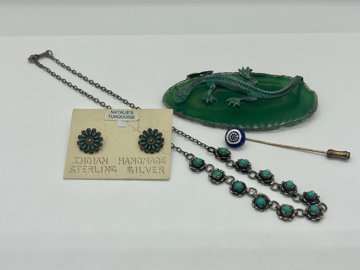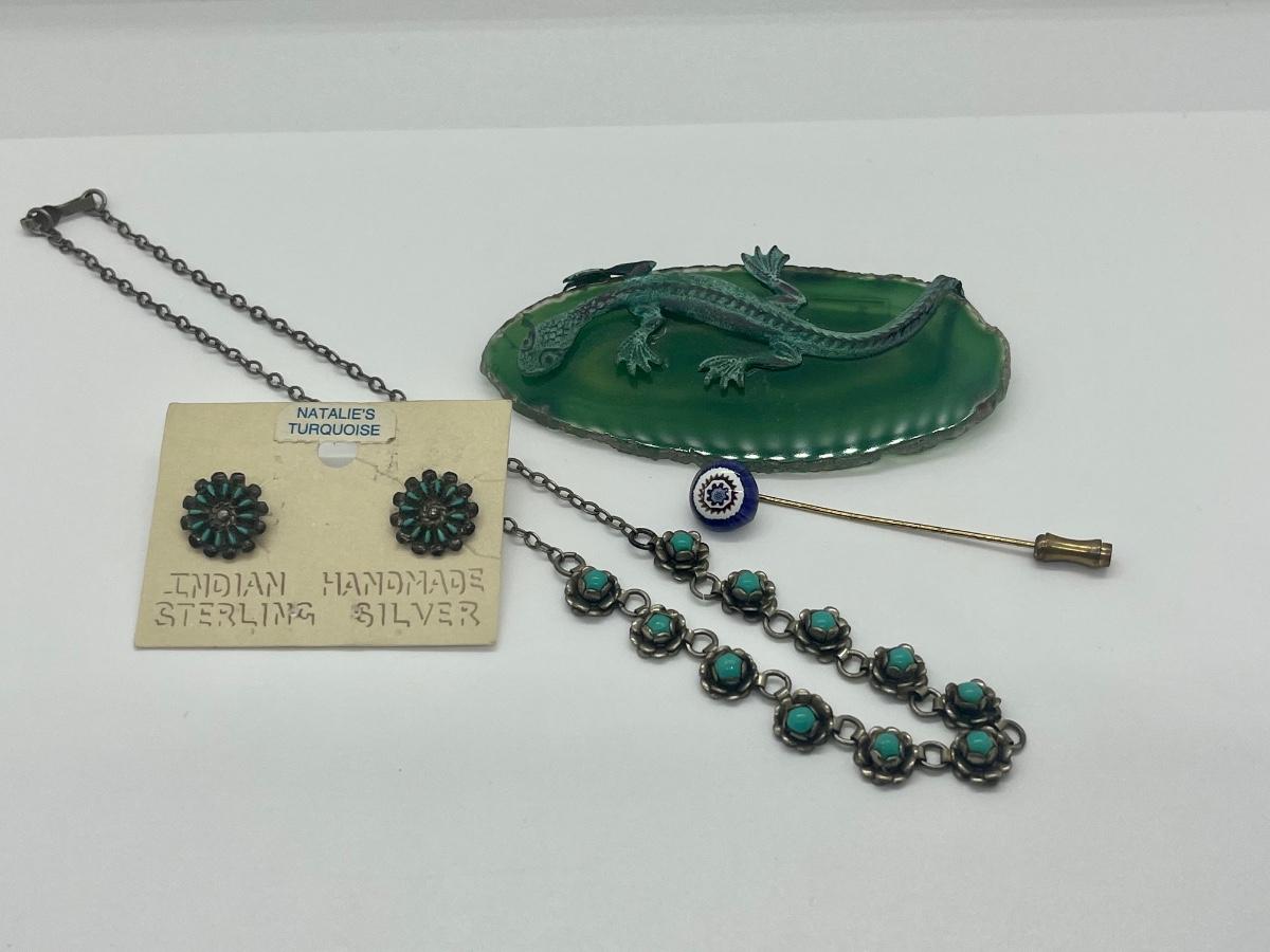 LOT 160C: Unique Lizard on Geode Brooch ,Vintage Turquoise Earrings & Necklace and Stick Pin