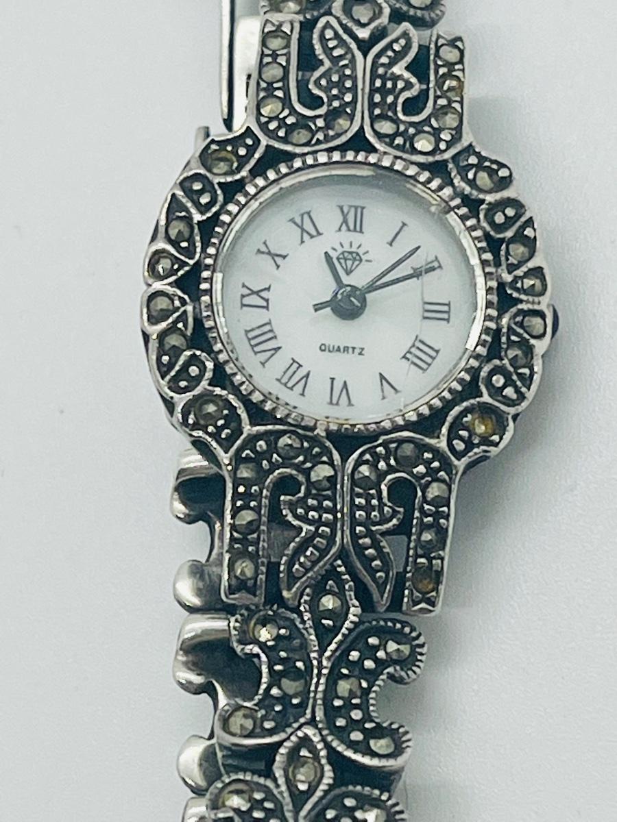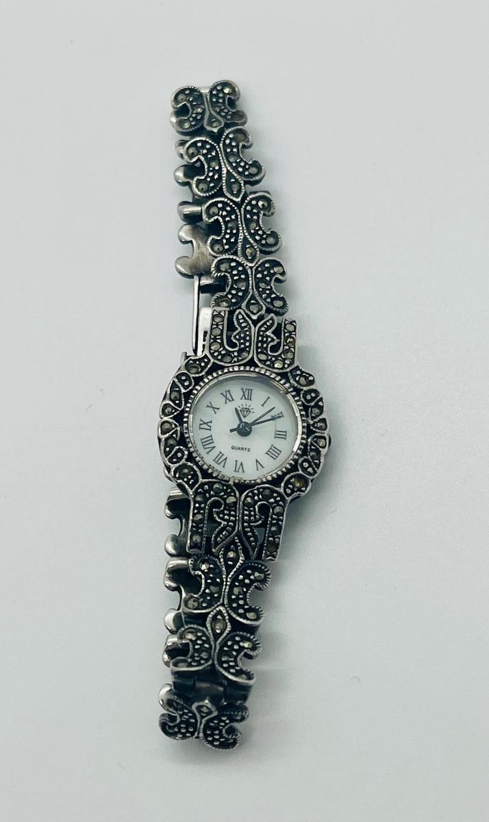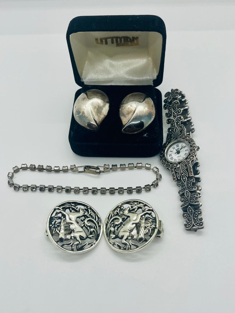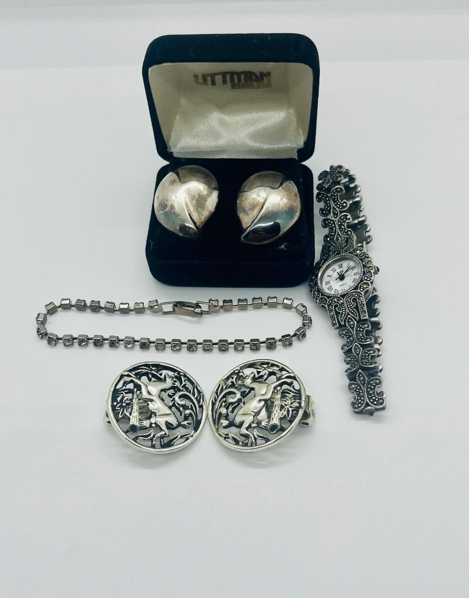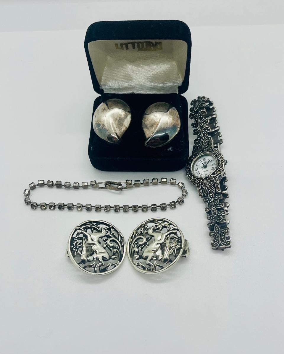 Vintage Marcasite watch that is marked 925, rhinestone bracelet, clip on earrings, and sterling earrings in box. Please see all pictures as they are the best representation of the items. The pictures show condition, measurements if taken, and what is included in the lot. Due to the large amount that we photograph and the time frame, we are not always able to take measurements. All items unless noted, are pre-owned and have been used. If you purchased furniture, you must bring help. We do not allow one person to carry large furniture out on their own. Bring help, tools and a truck for the safety of our client’s homes, and your personal safety. Any damages that result to the property including walls, and floors due to moving of the furniture will be charged to the buyer. Company policy. Thank you.