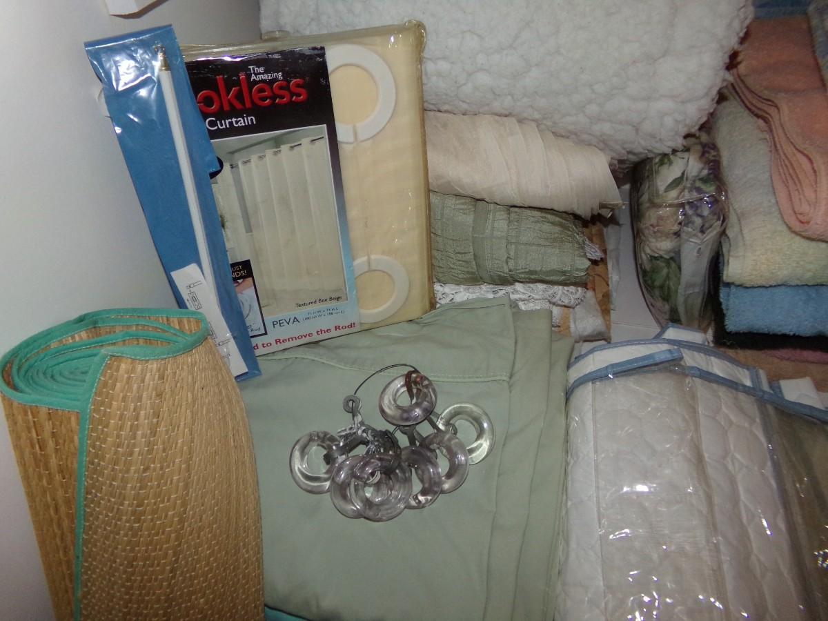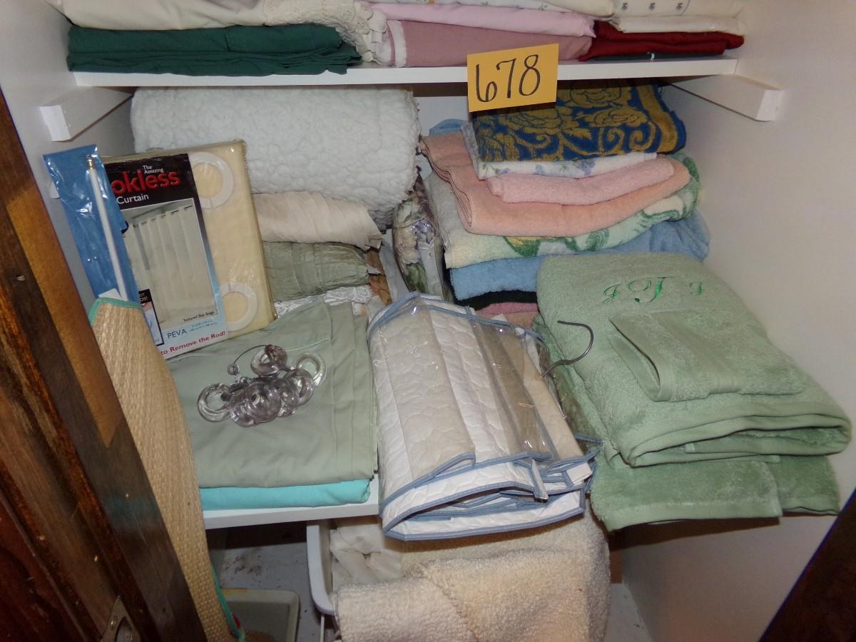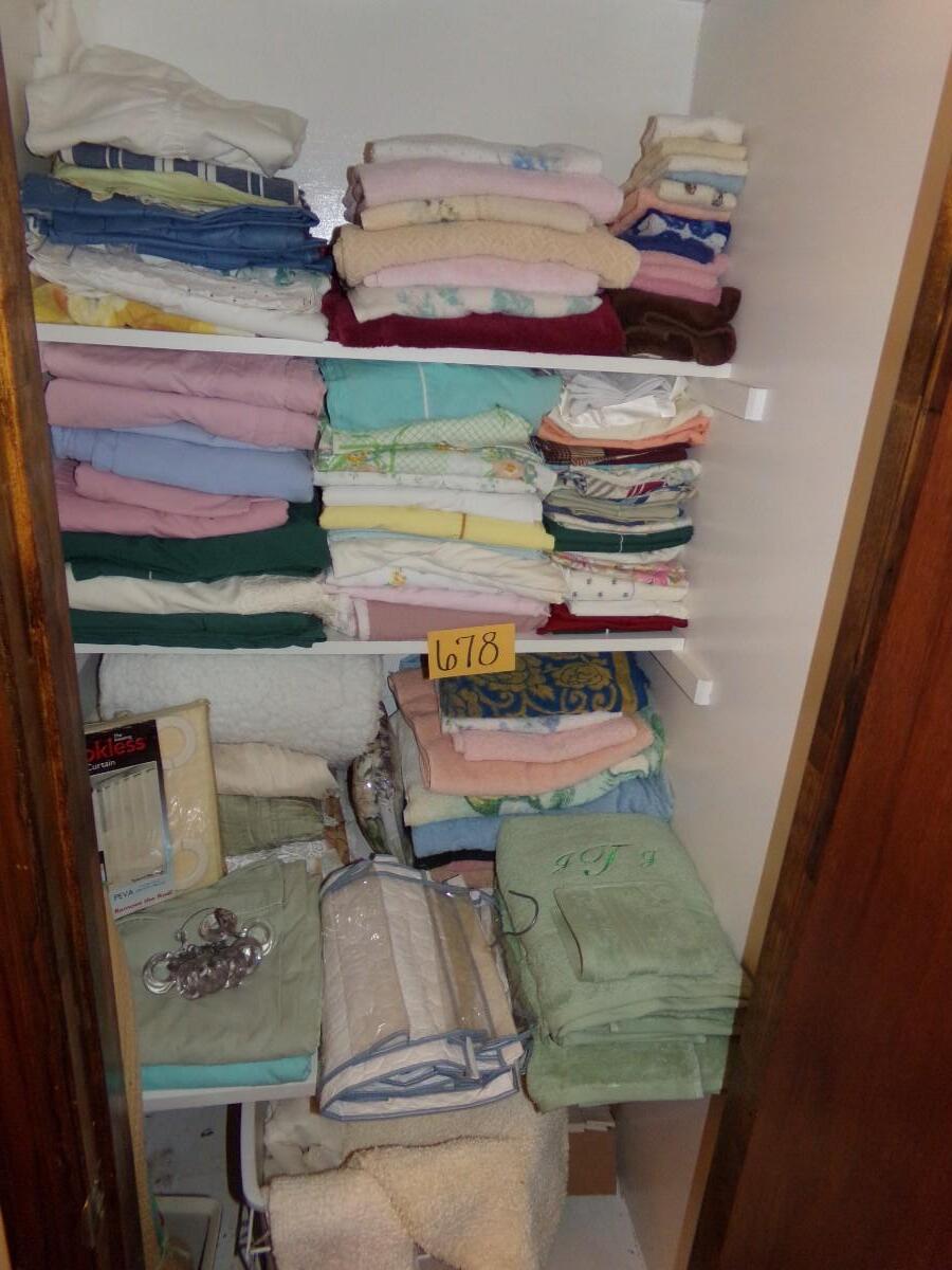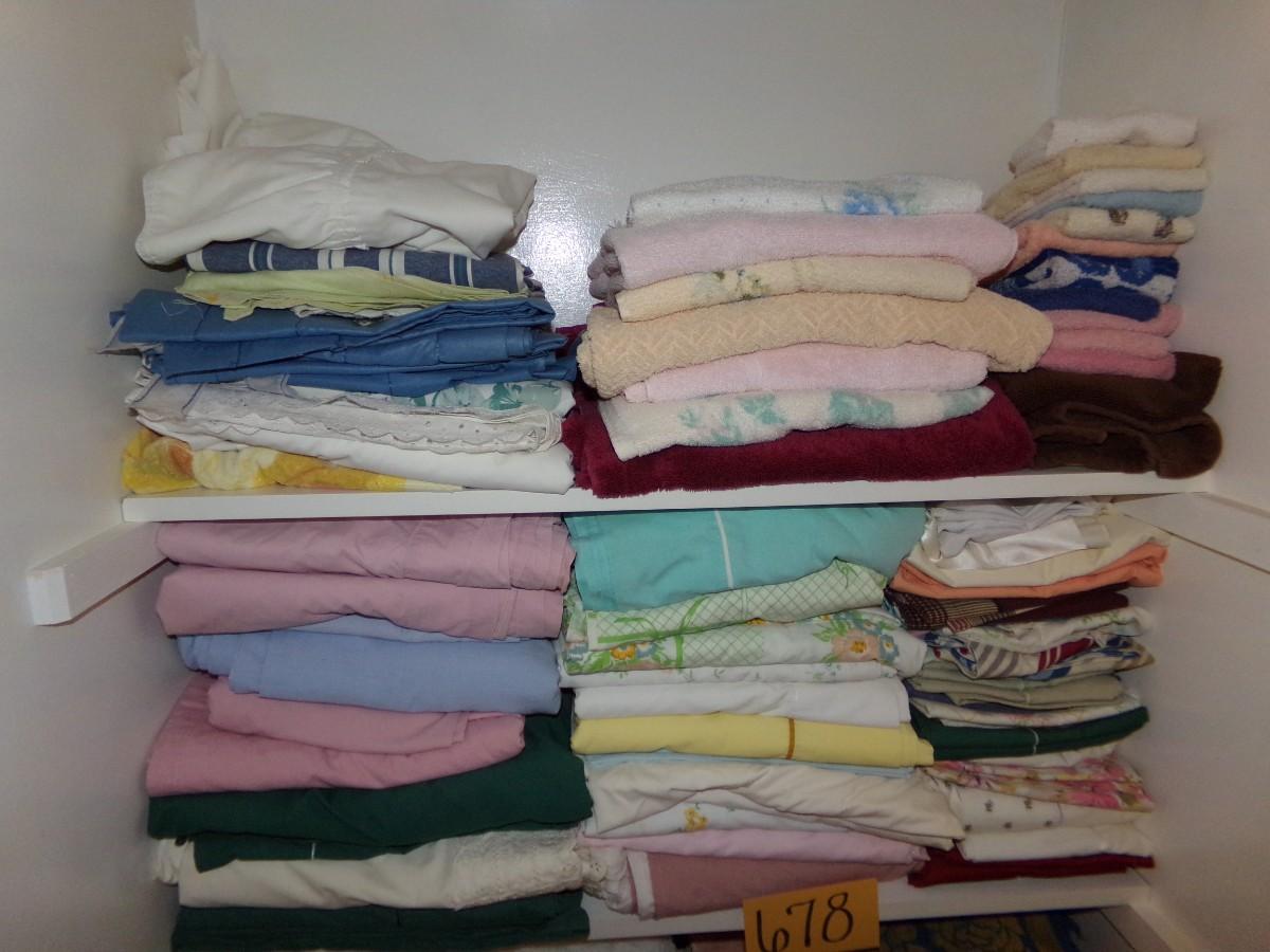 LARGE LOT OF LINENS. SHEETS (QUEEN AND KING SIZE), PILLOWCASES, TOWELS. SHOWER CURTAIN NEW IN BAG, WASH CLOTHES AND MORE.