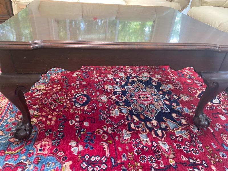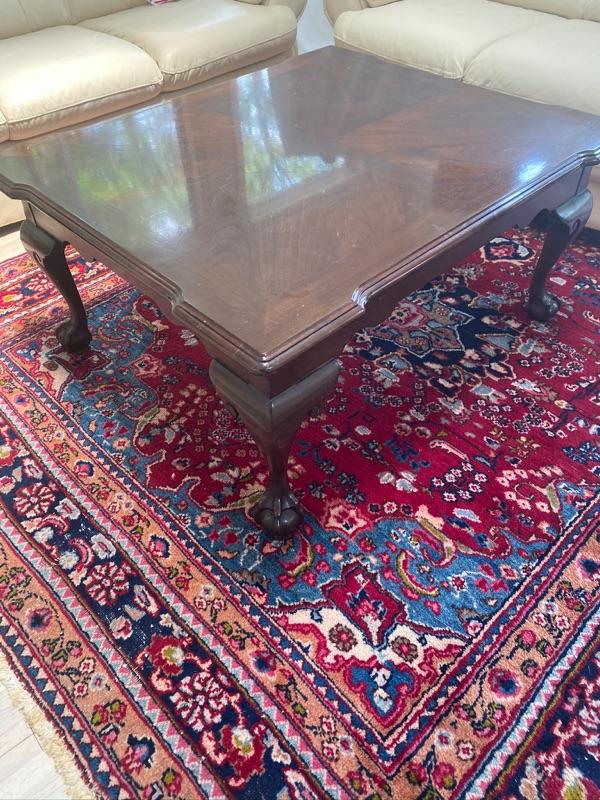 Large mahogany coffee table measuring 40” x 34” x 18.5” tall