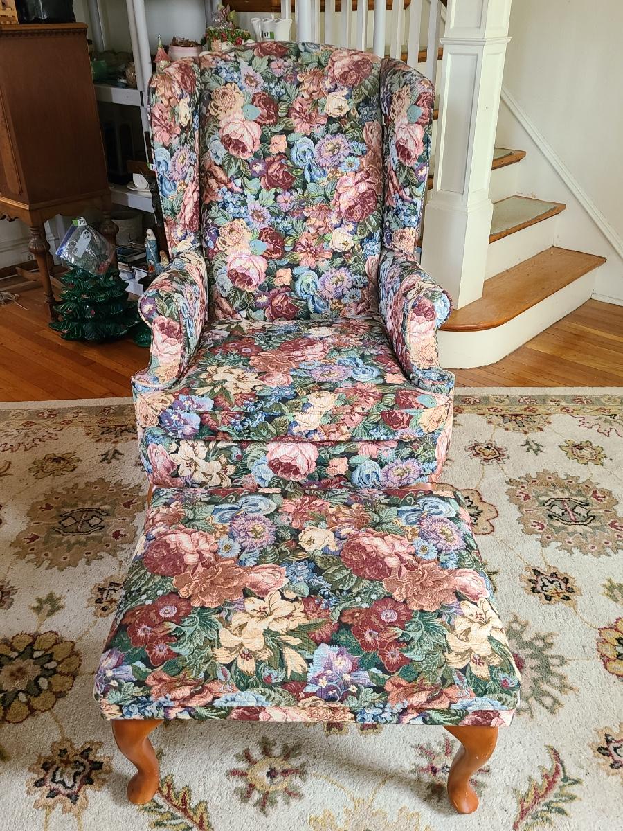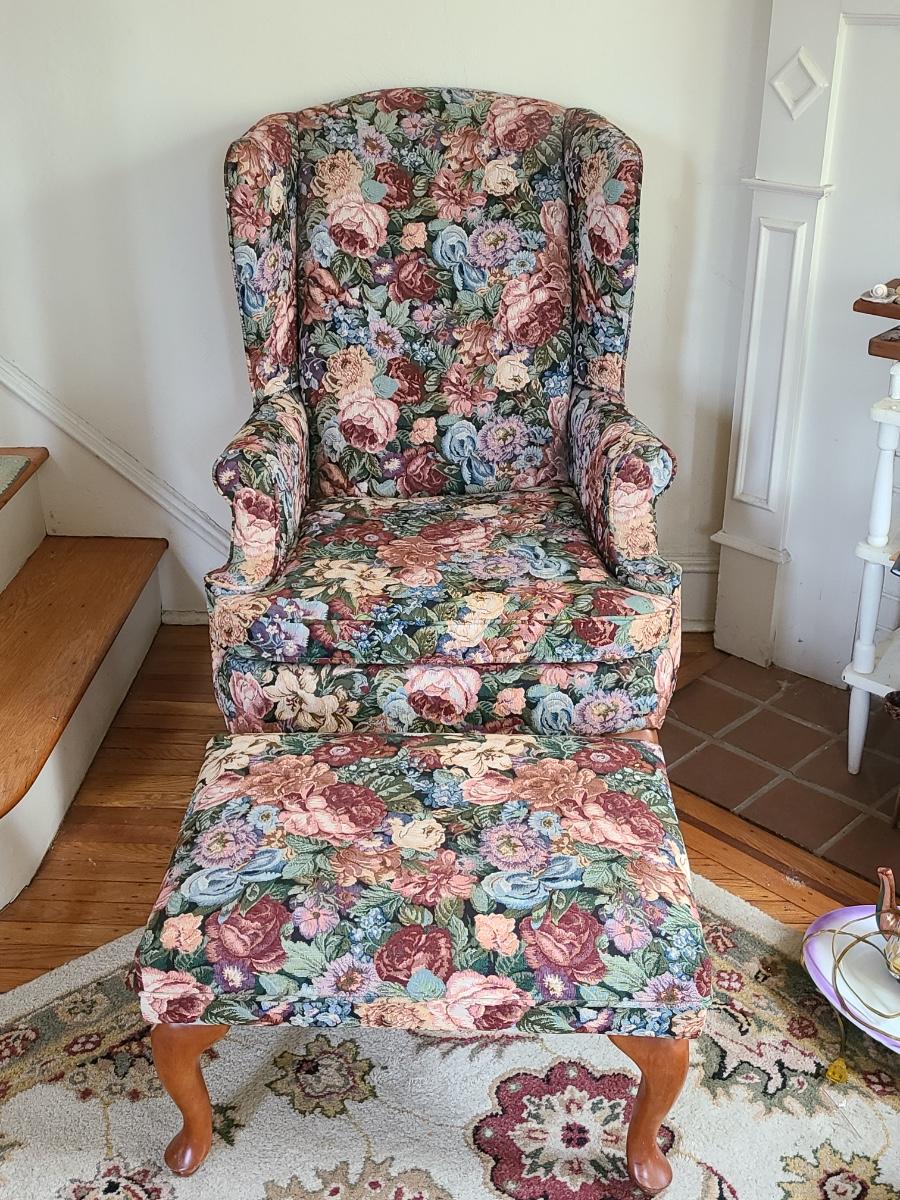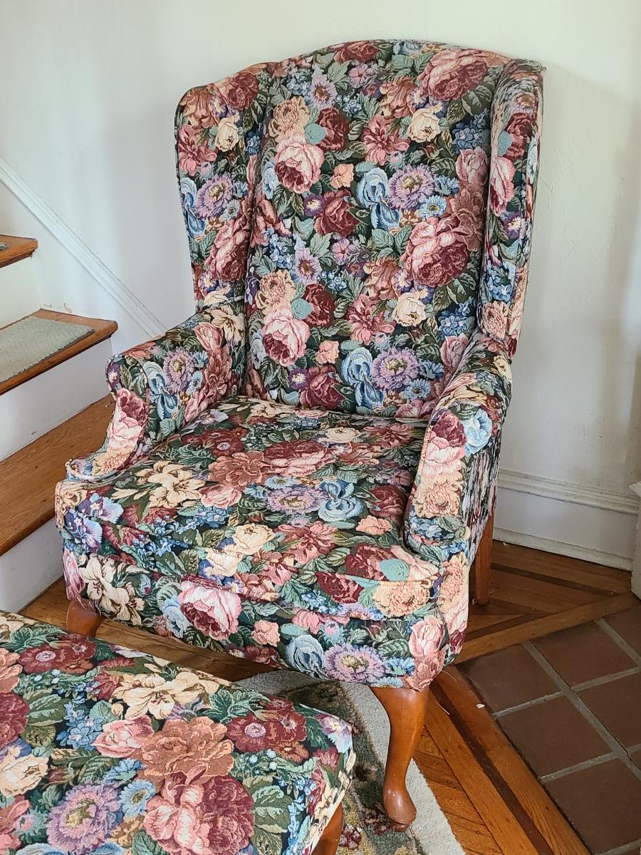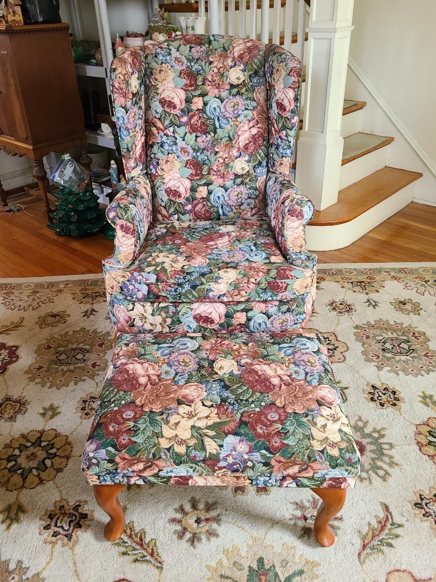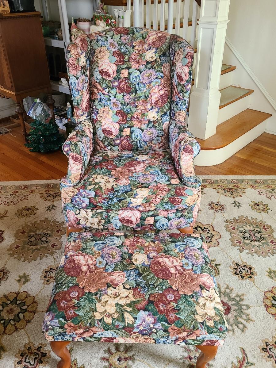 This is a lovely clean, comfortable chair with ottoman, but the chair had a back leg replaced. Hard to notice. Please see all pictures as they are the best representation of the items. The pictures show condition, measurements if taken, and what is included in the lot. Due to the large amount that we photograph and the time frame, we are not always able to take measurements. All items unless noted, are pre-owned and have been used. If you purchased furniture, you must bring help. We do not allow one person to carry large furniture out on their own. Bring help, tools and a truck for the safety of our client’s homes, and your personal safety. Any damages that result to the property including walls, and floors due to moving of the furniture will be charged to the buyer. Company policy. Thank you.