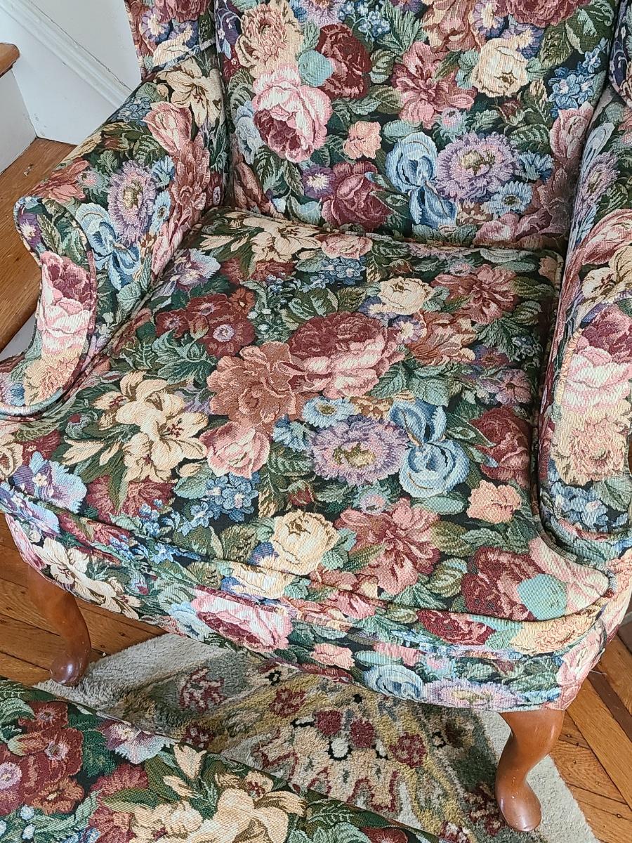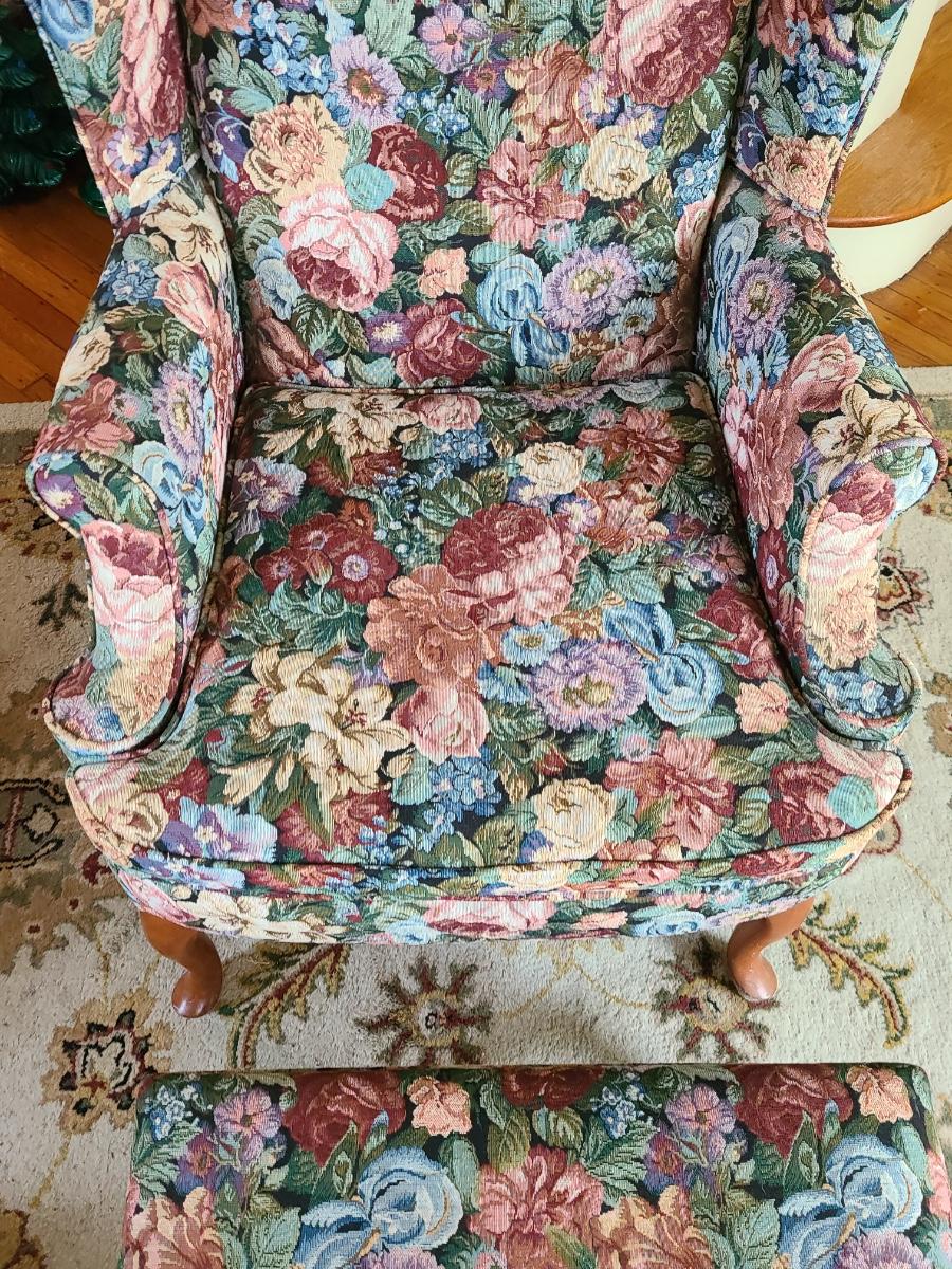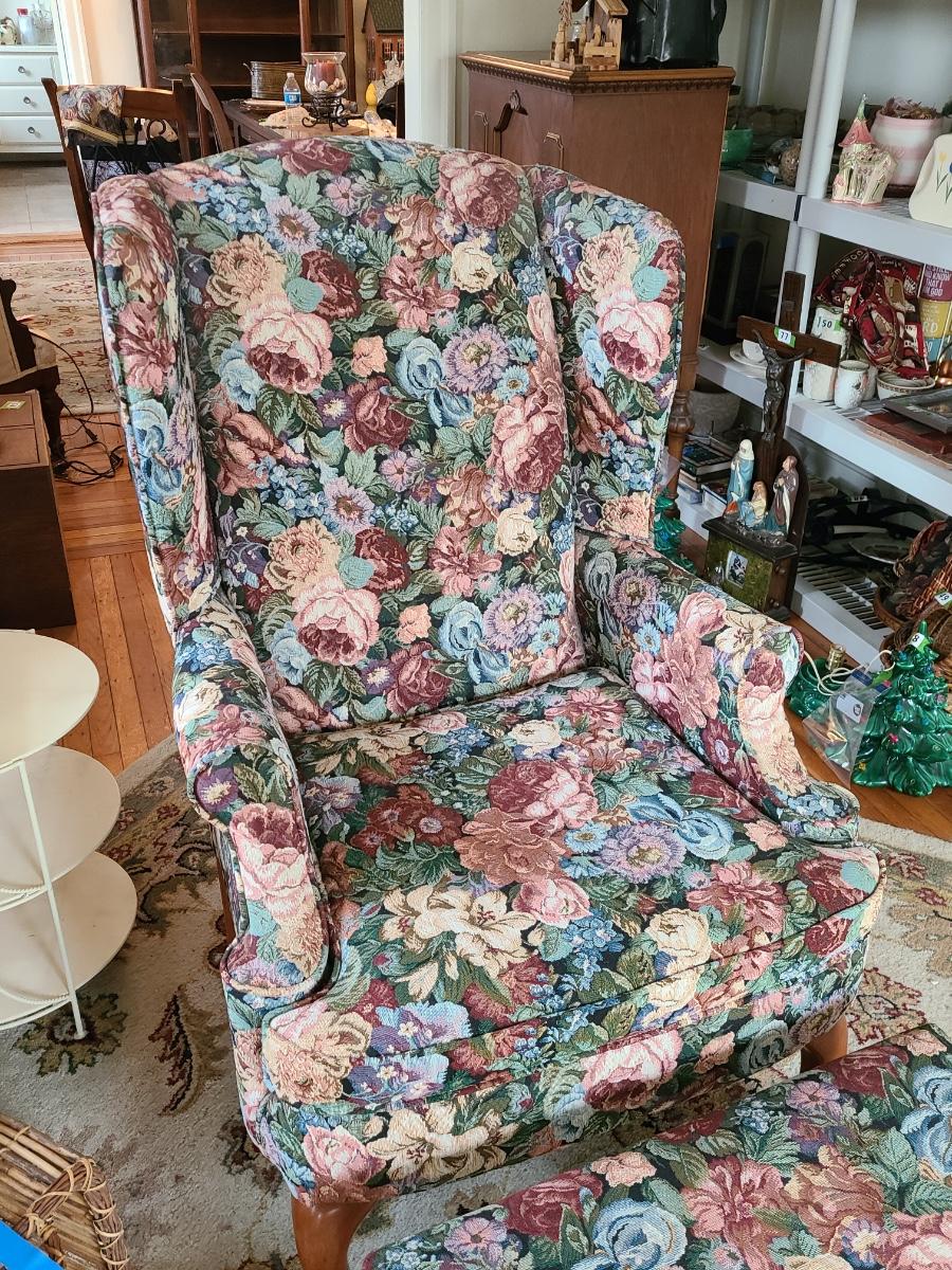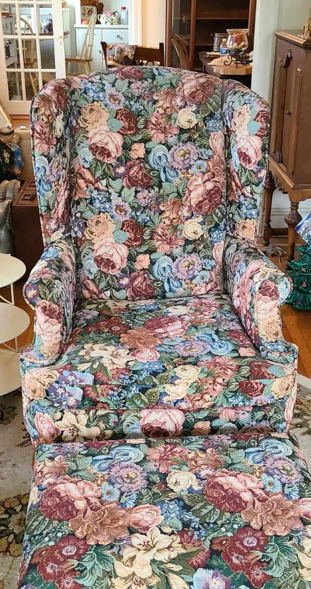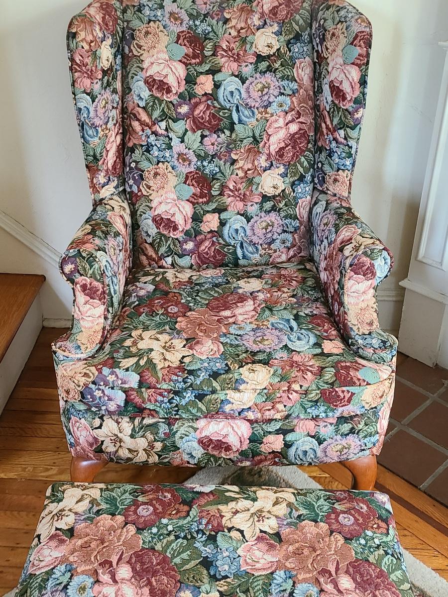 This is a lovely clean, comfortable chair with ottoman, but the chair had a back leg replaced. Hard to notice. Please see all pictures as they are the best representation of the items. The pictures show condition, measurements if taken, and what is included in the lot. Due to the large amount that we photograph and the time frame, we are not always able to take measurements. All items unless noted, are pre-owned and have been used. If you purchased furniture, you must bring help. We do not allow one person to carry large furniture out on their own. Bring help, tools and a truck for the safety of our client’s homes, and your personal safety. Any damages that result to the property including walls, and floors due to moving of the furniture will be charged to the buyer. Company policy. Thank you.