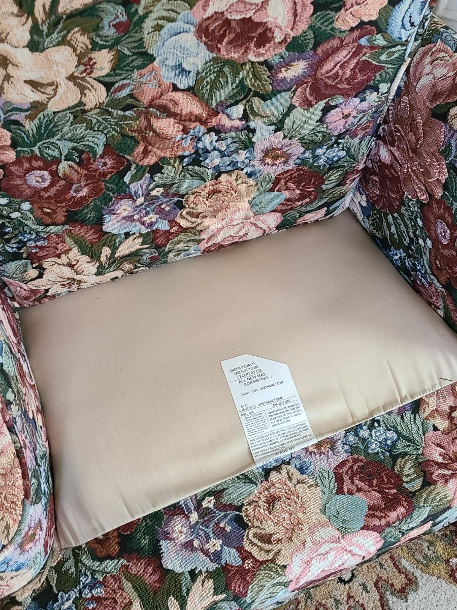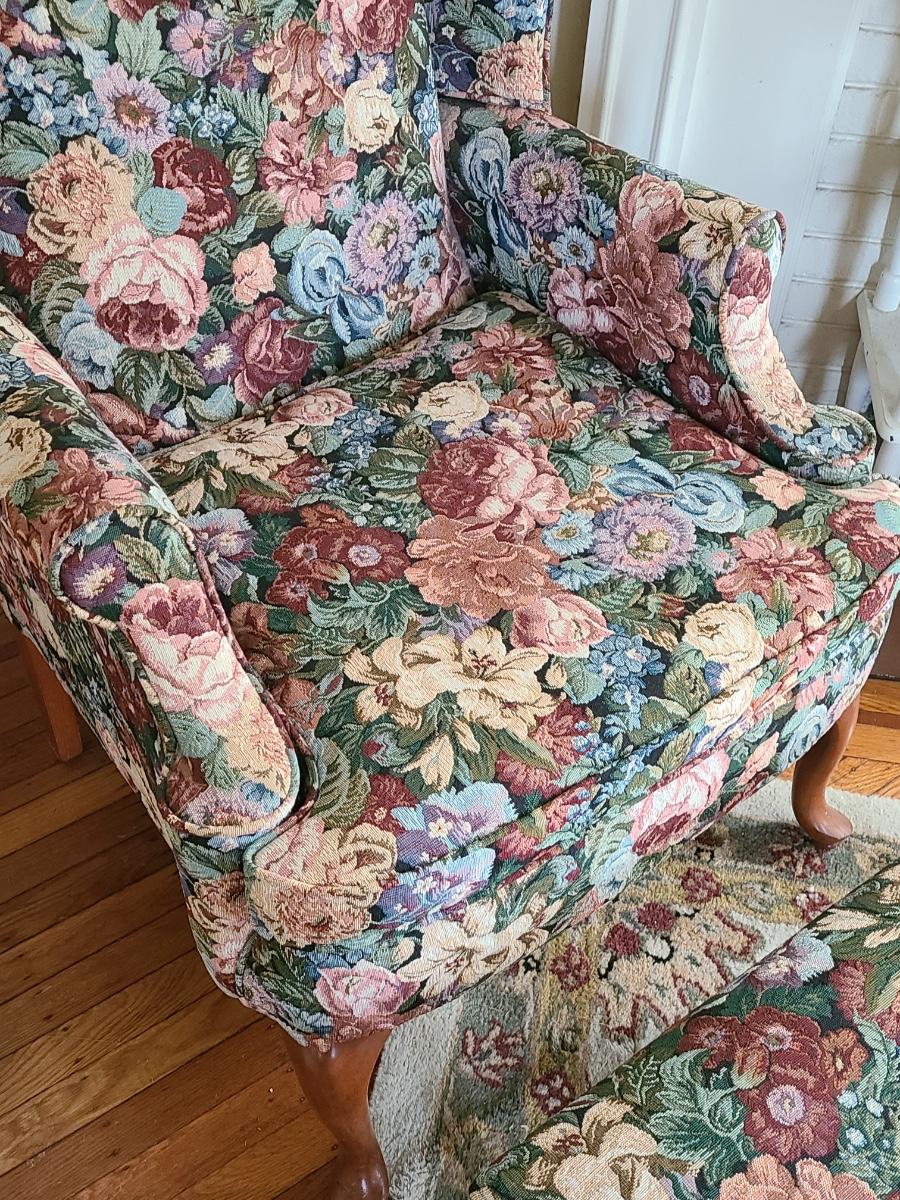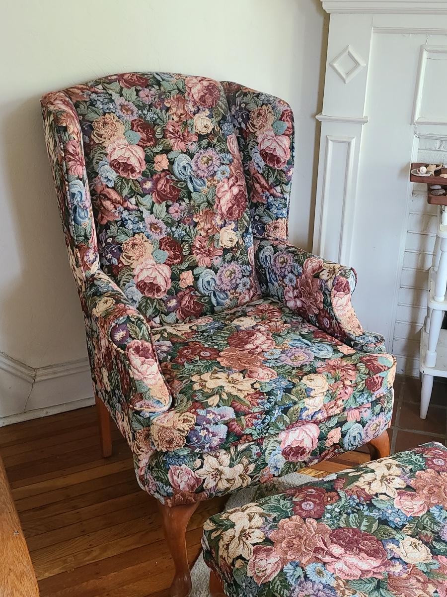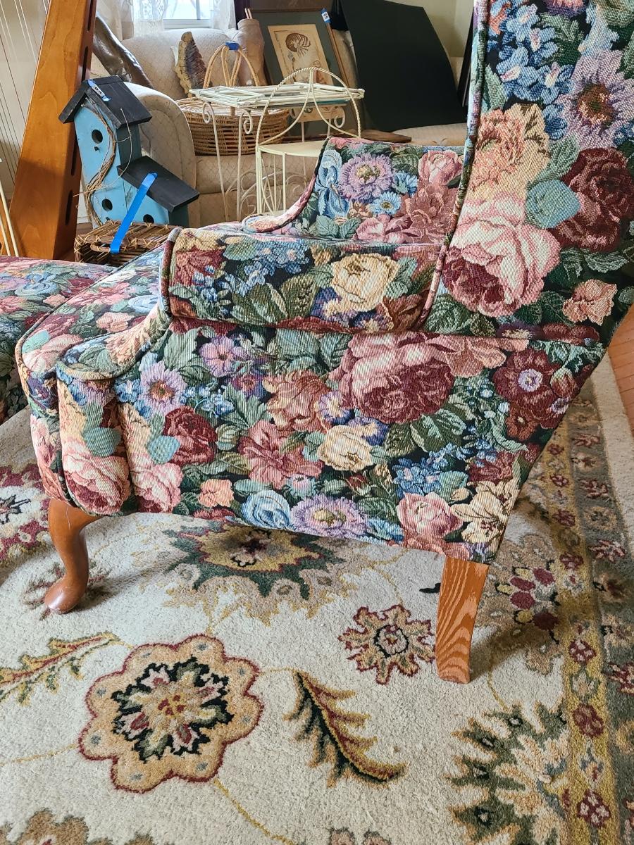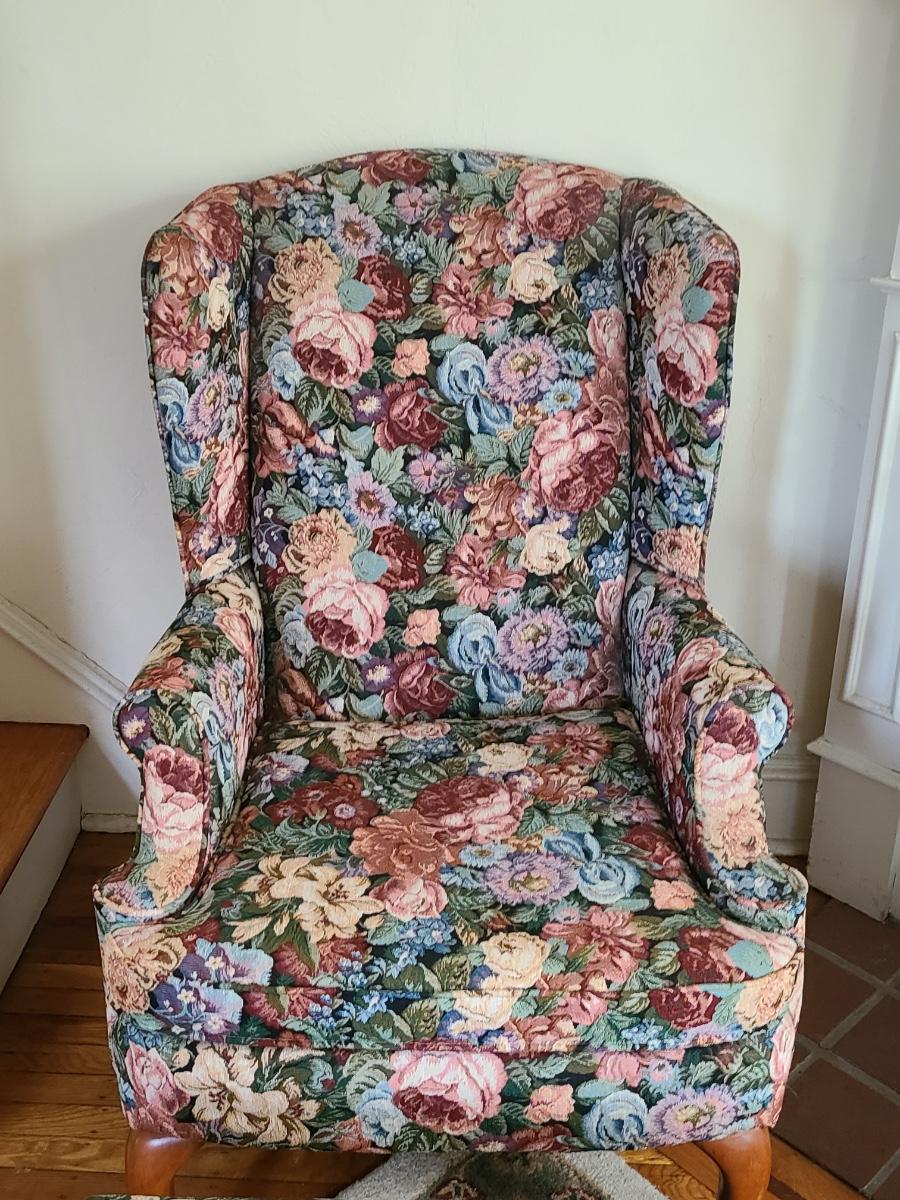 This is a lovely clean, comfortable chair with ottoman, but the chair had a back leg replaced. Hard to notice. Please see all pictures as they are the best representation of the items. The pictures show condition, measurements if taken, and what is included in the lot. Due to the large amount that we photograph and the time frame, we are not always able to take measurements. All items unless noted, are pre-owned and have been used. If you purchased furniture, you must bring help. We do not allow one person to carry large furniture out on their own. Bring help, tools and a truck for the safety of our client’s homes, and your personal safety. Any damages that result to the property including walls, and floors due to moving of the furniture will be charged to the buyer. Company policy. Thank you.