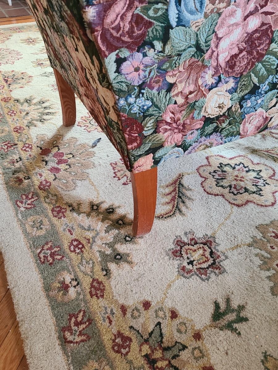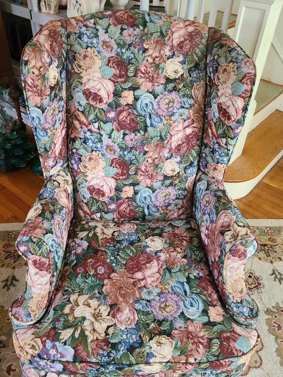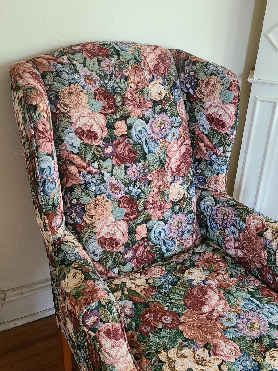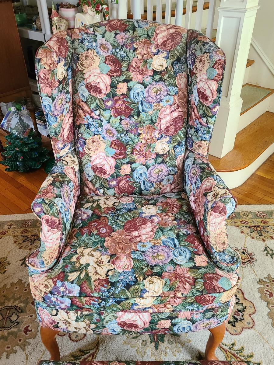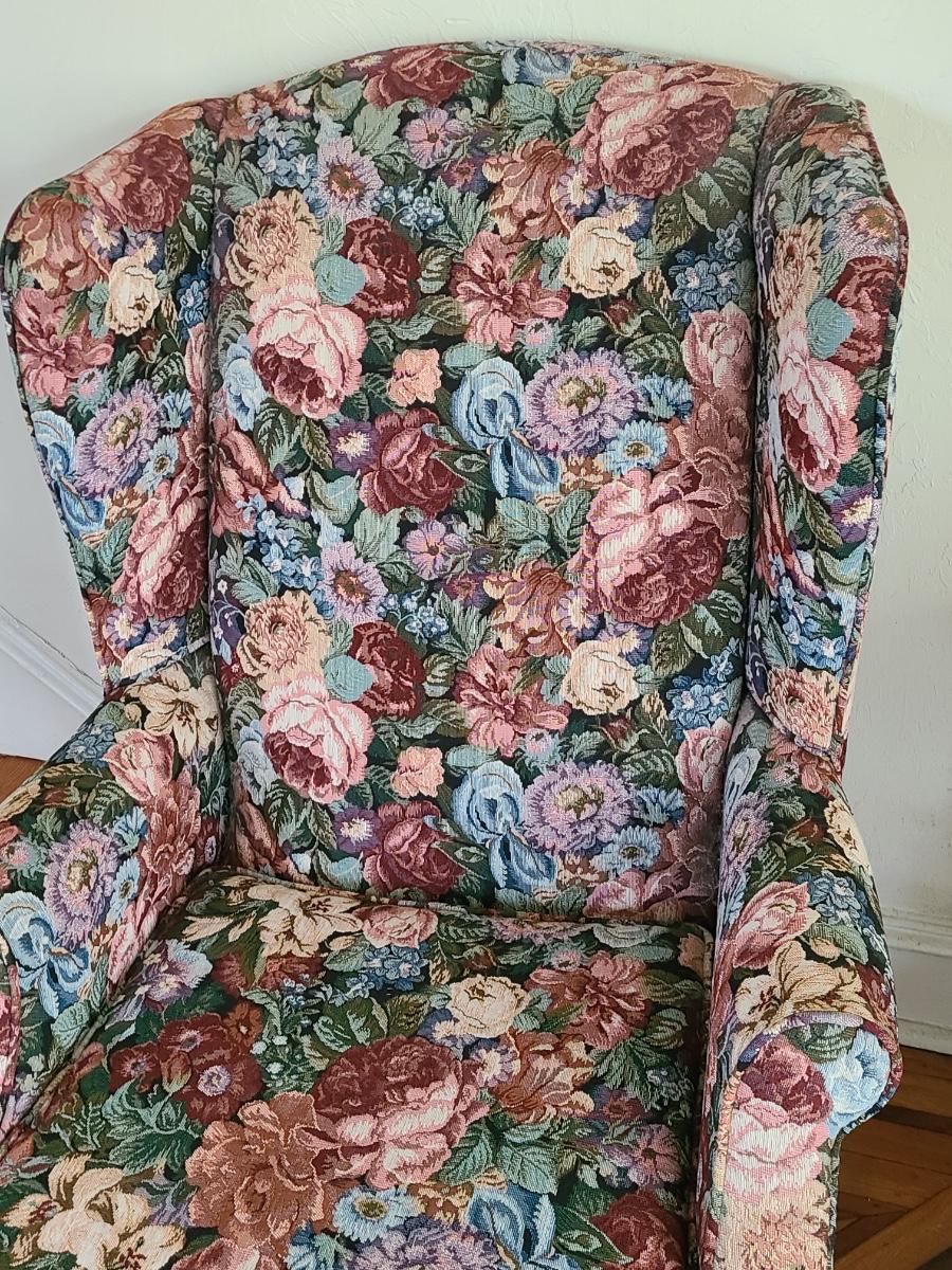 This is a lovely clean, comfortable chair with ottoman, but the chair had a back leg replaced. Hard to notice. Please see all pictures as they are the best representation of the items. The pictures show condition, measurements if taken, and what is included in the lot. Due to the large amount that we photograph and the time frame, we are not always able to take measurements. All items unless noted, are pre-owned and have been used. If you purchased furniture, you must bring help. We do not allow one person to carry large furniture out on their own. Bring help, tools and a truck for the safety of our client’s homes, and your personal safety. Any damages that result to the property including walls, and floors due to moving of the furniture will be charged to the buyer. Company policy. Thank you.