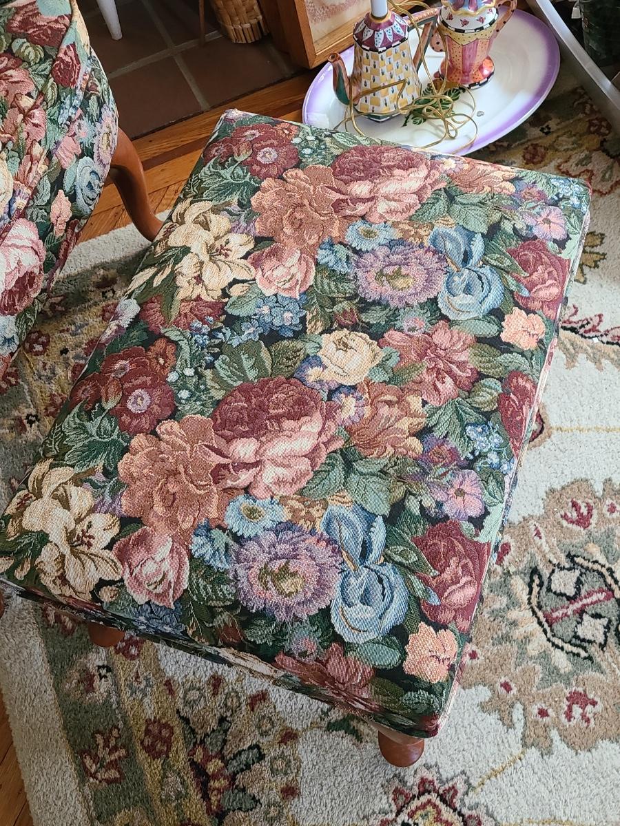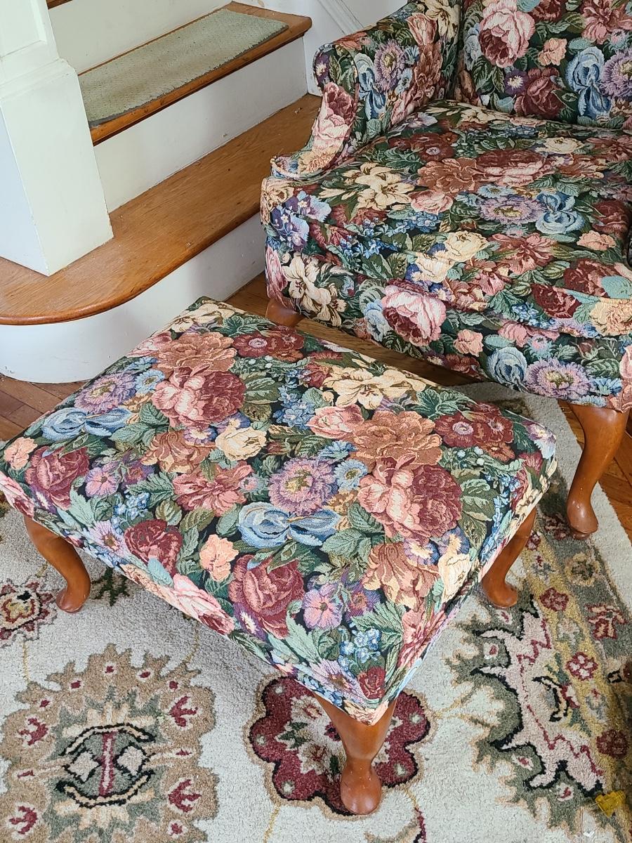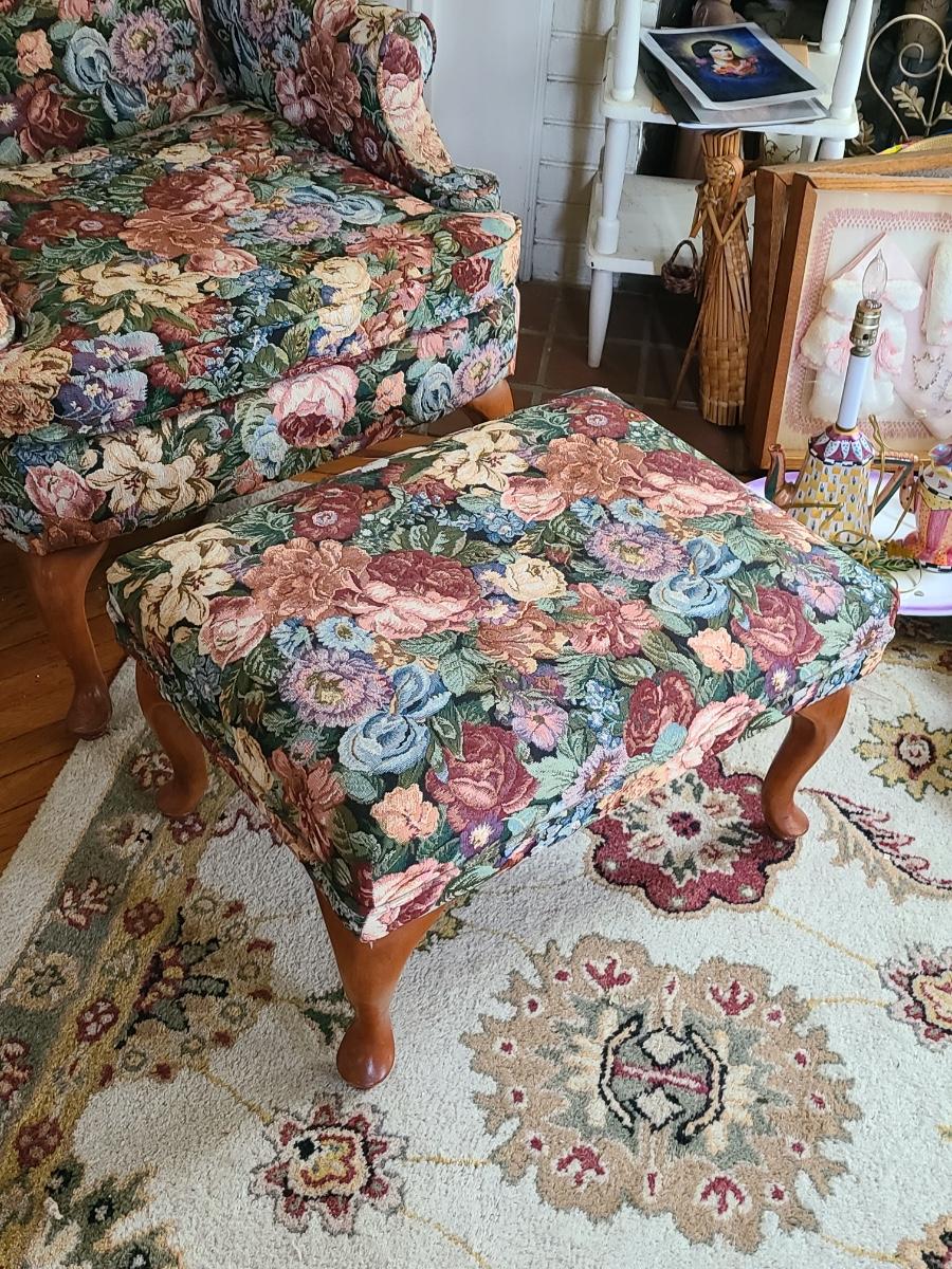 Lot 600: Floral Tapestry Chair w/Ottoman