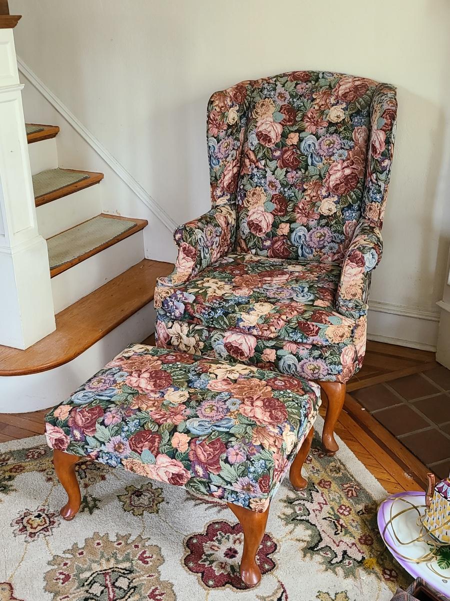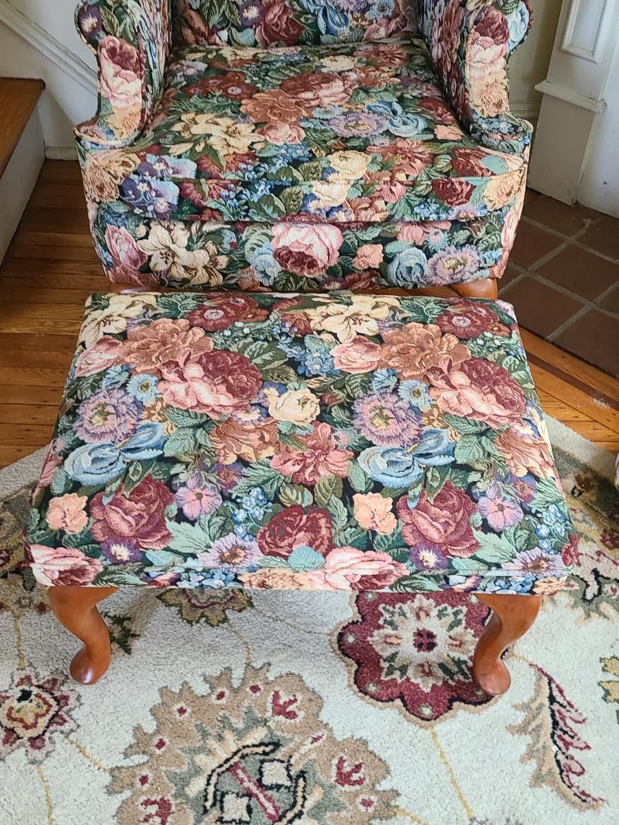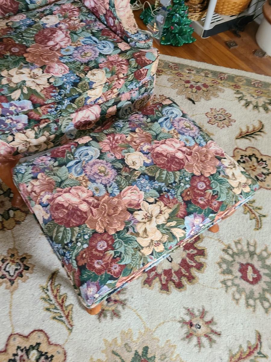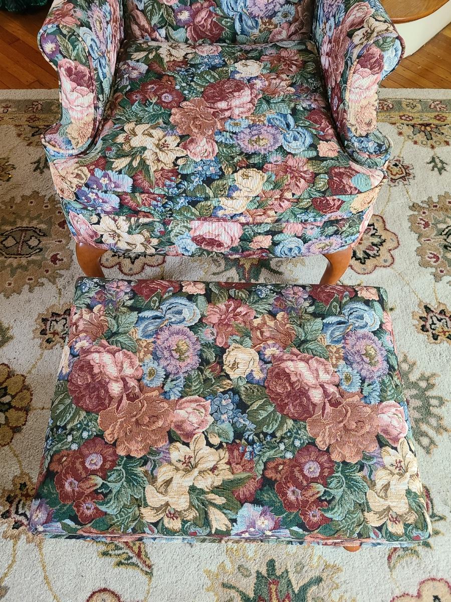 Lot 600: Floral Tapestry Chair w/Ottoman
