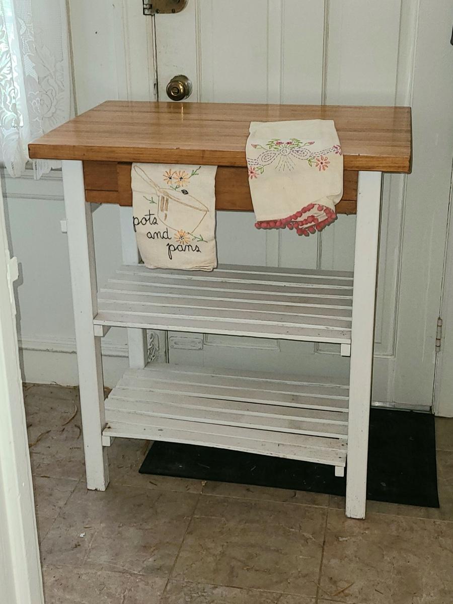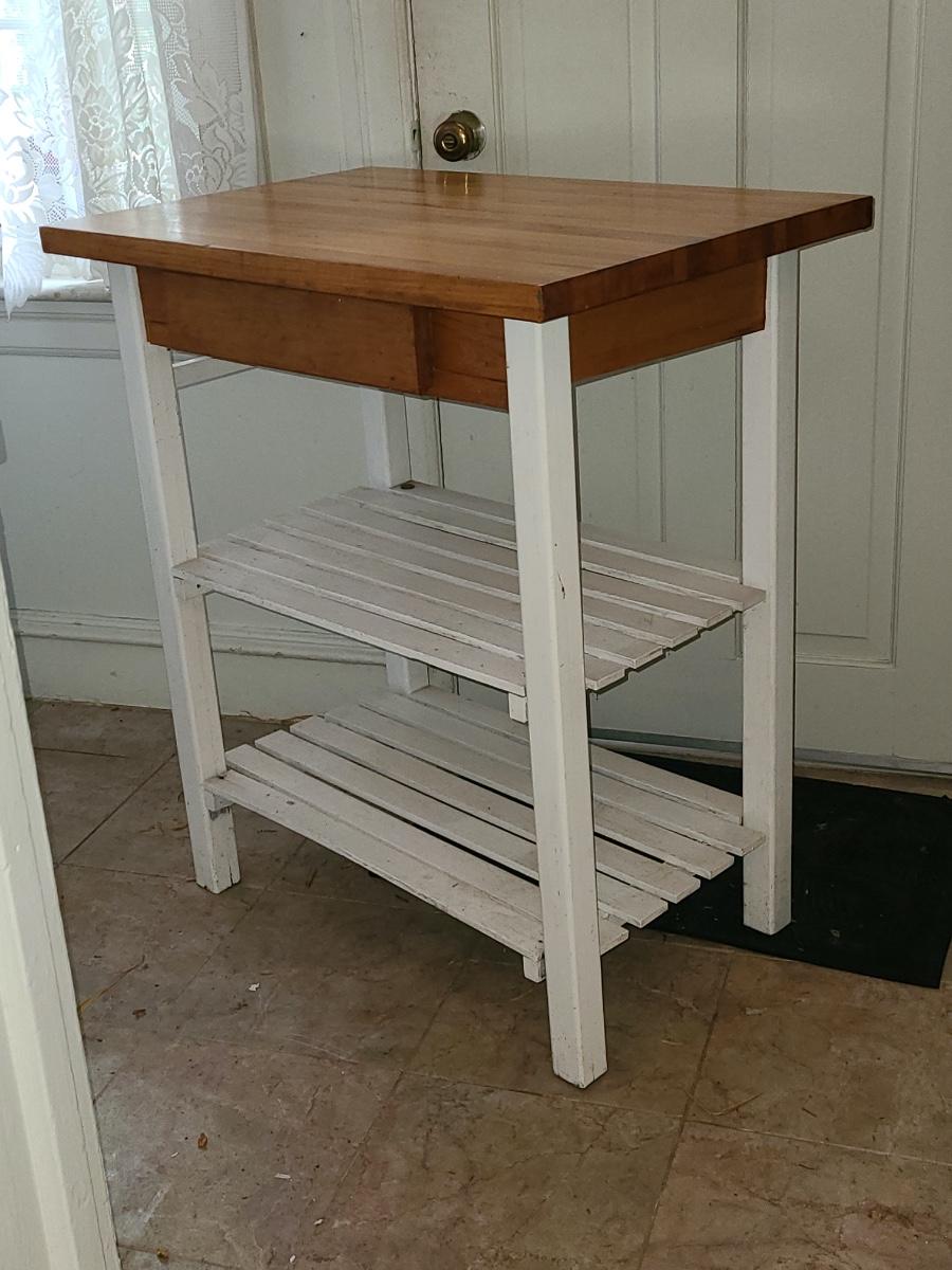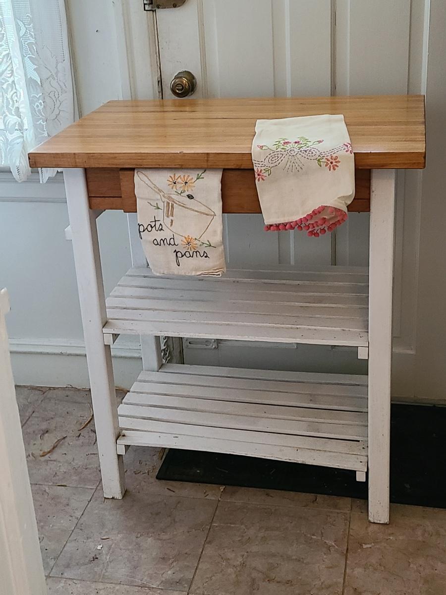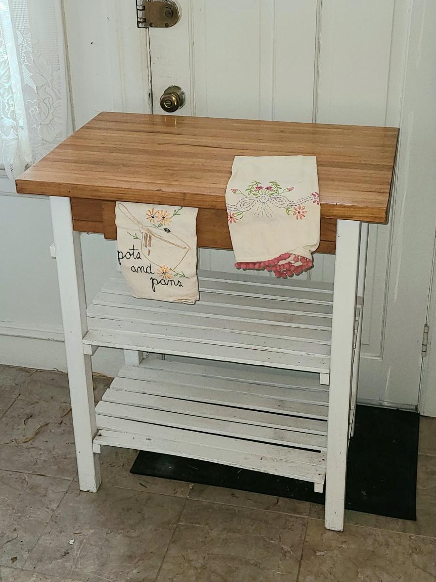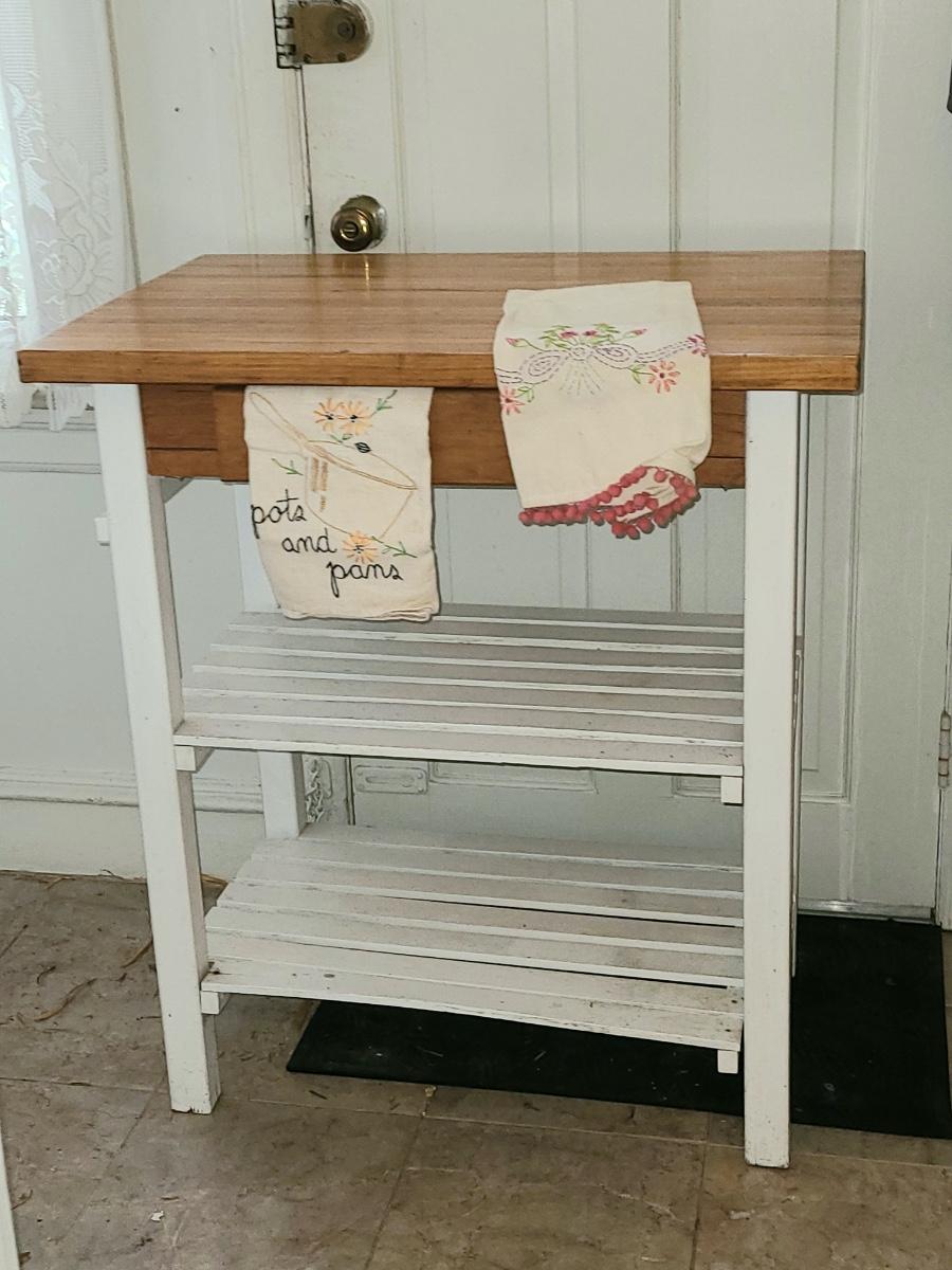 This is older, and shows wear. Comes with tea/kitchen towels in pictures. Could use a fresh paint of coat if you want to up-cycle. The butcher block top is gorgeous! Please see all pictures as they are the best representation of the items. The pictures show condition, measurements if taken, and what is included in the lot. Due to the large amount that we photograph and the time frame, we are not always able to take measurements. All items unless noted, are pre-owned and have been used. If you purchased furniture, you must bring help. We do not allow one person to carry large furniture out on their own. Bring help, tools and a truck for the safety of our client’s homes, and your personal safety. Any damages that result to the property including walls, and floors due to moving of the furniture will be charged to the buyer. Company policy. Thank you.