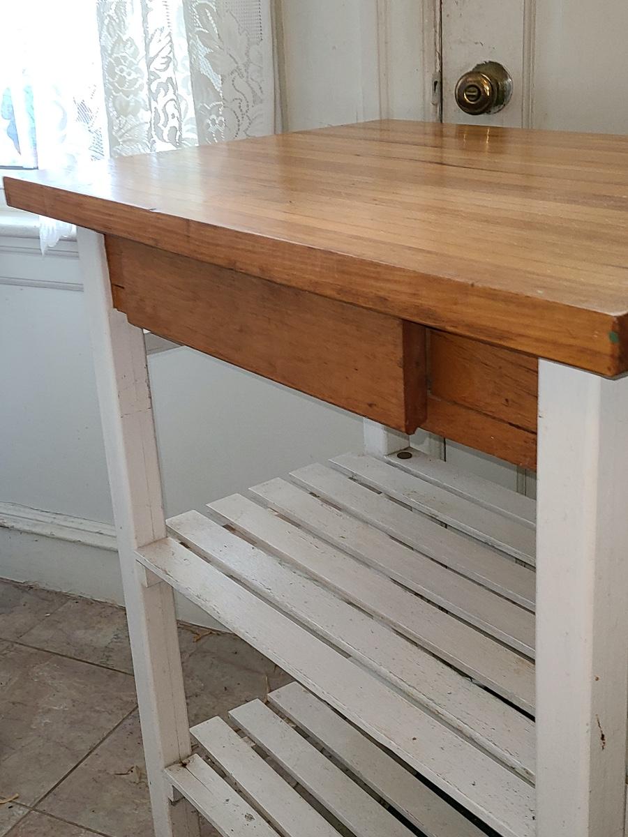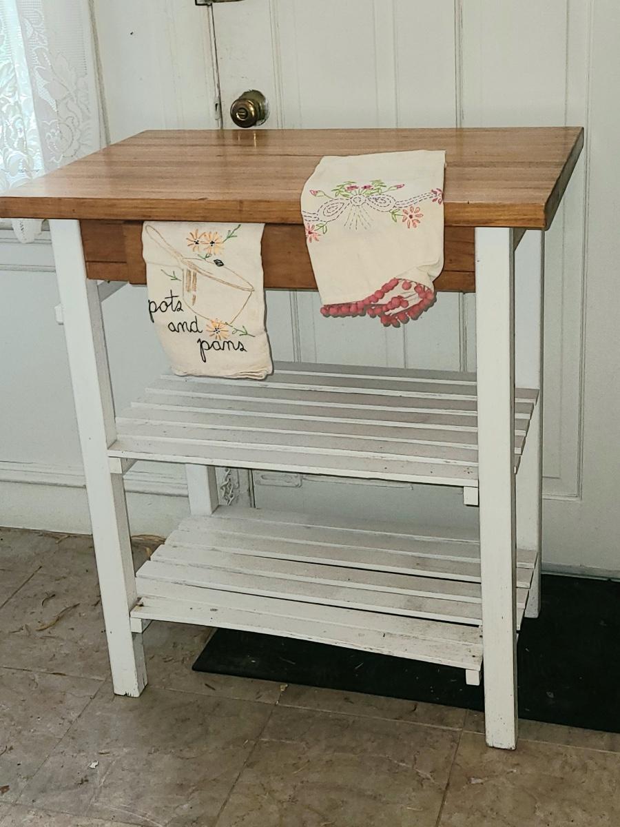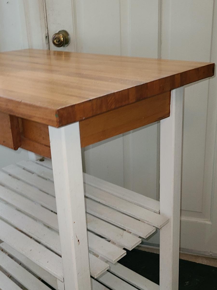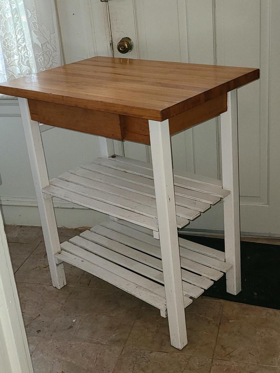 This is older, and shows wear. Comes with tea/kitchen towels in pictures. Could use a fresh paint of coat if you want to up-cycle. The butcher block top is gorgeous! Please see all pictures as they are the best representation of the items. The pictures show condition, measurements if taken, and what is included in the lot. Due to the large amount that we photograph and the time frame, we are not always able to take measurements. All items unless noted, are pre-owned and have been used. If you purchased furniture, you must bring help. We do not allow one person to carry large furniture out on their own. Bring help, tools and a truck for the safety of our client’s homes, and your personal safety. Any damages that result to the property including walls, and floors due to moving of the furniture will be charged to the buyer. Company policy. Thank you.