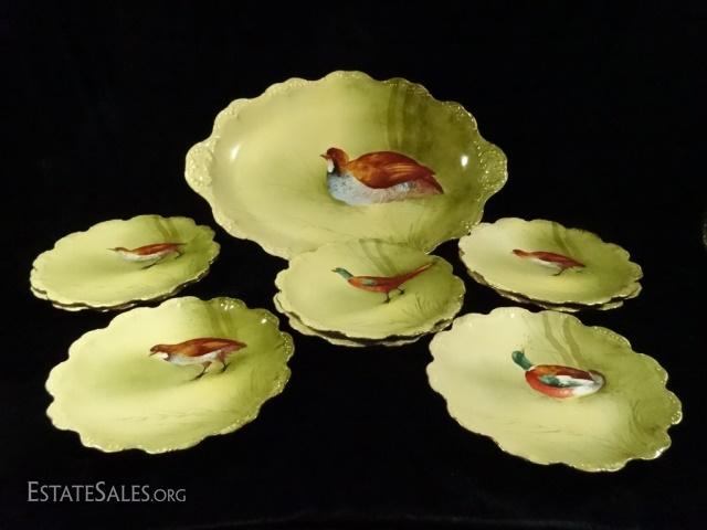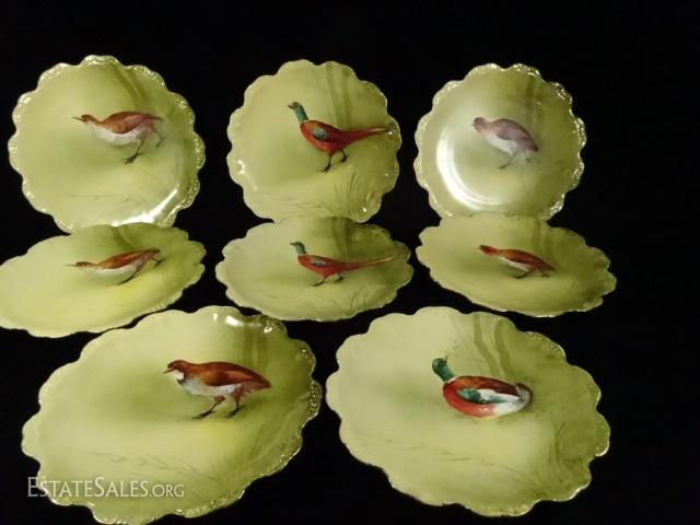 LOT 67C: 9 PIECE ANTIQUE KLINGENBERG DWENGER LIMOGES BIRD PLATES AND PLATTER