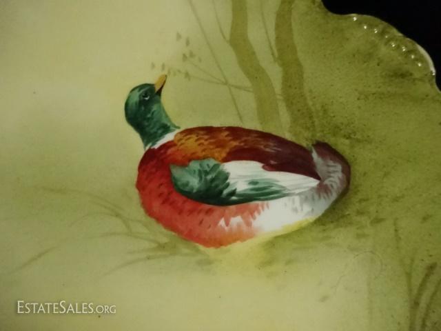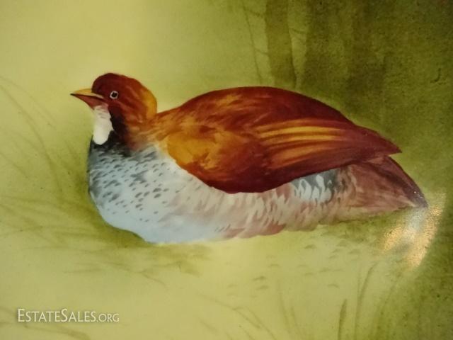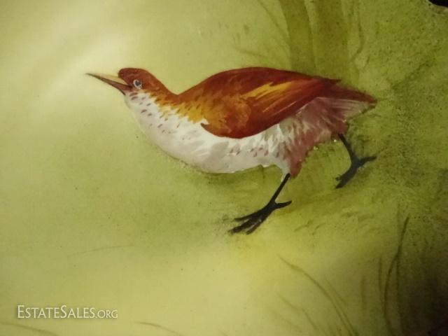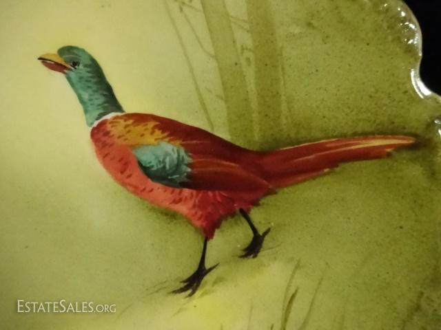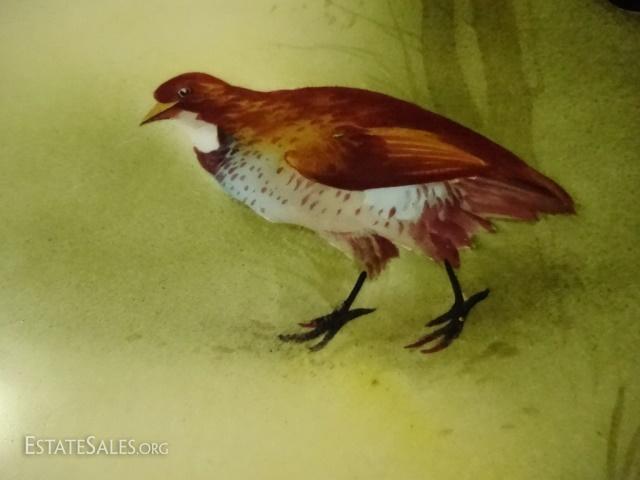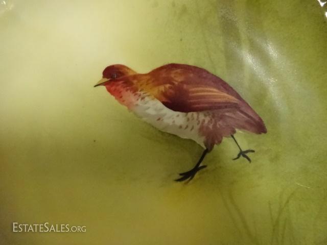 LOT 67C: 9 PC ANTIQUE KLINGENBERG DWENGER LIMOGES BIRD PLATES AND PLATTER, CIRCA 1900-1910, HANDPAINTED BIRD DESIGNS ON EACH, INCLUDES EIGHT 12" PLATES AND ONE 18" X 12" PLATTER). MARKED AKCD LIMOGES FRANCE, VERY GOOD CONDITION, SKU9002.22