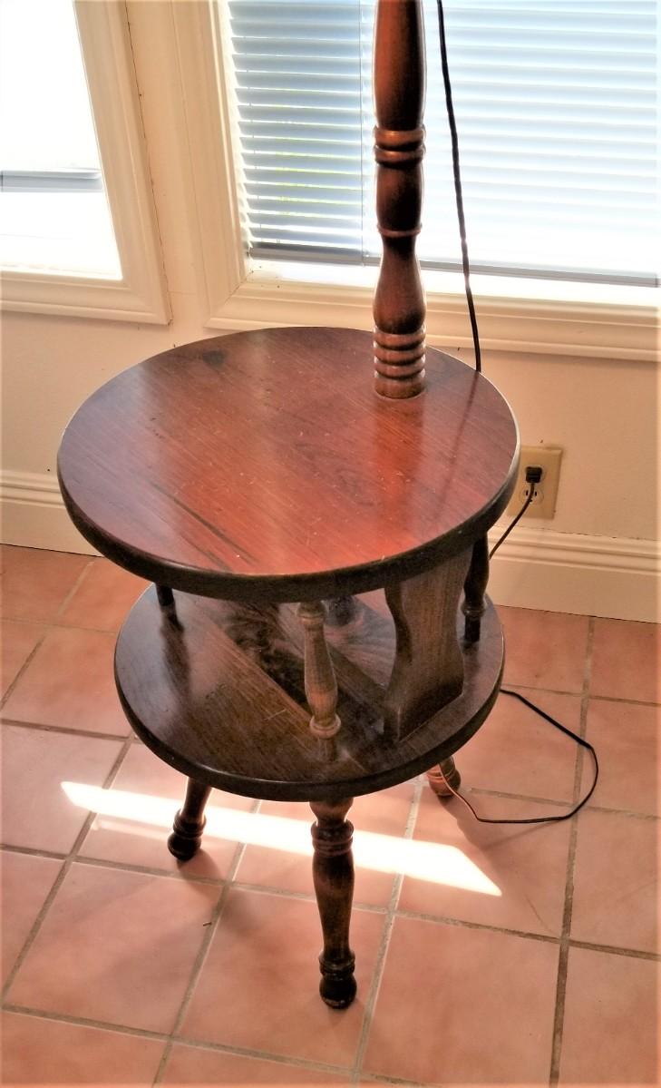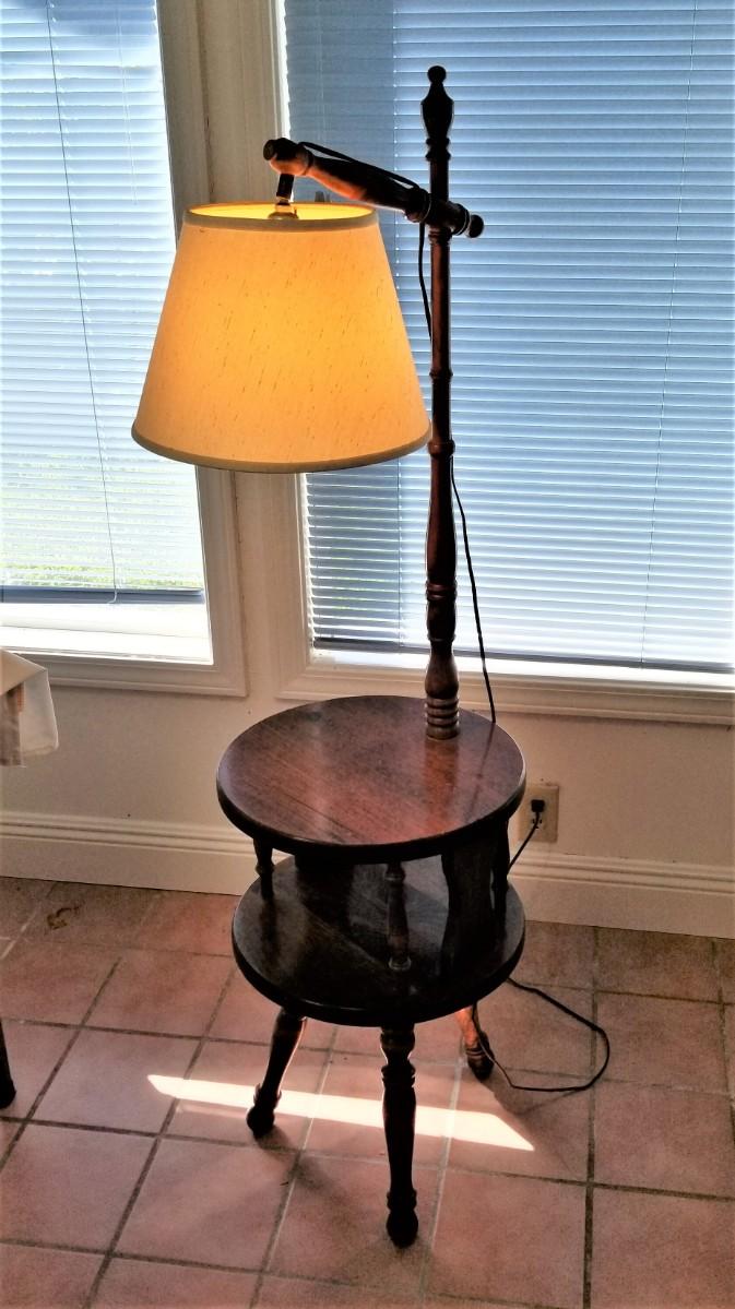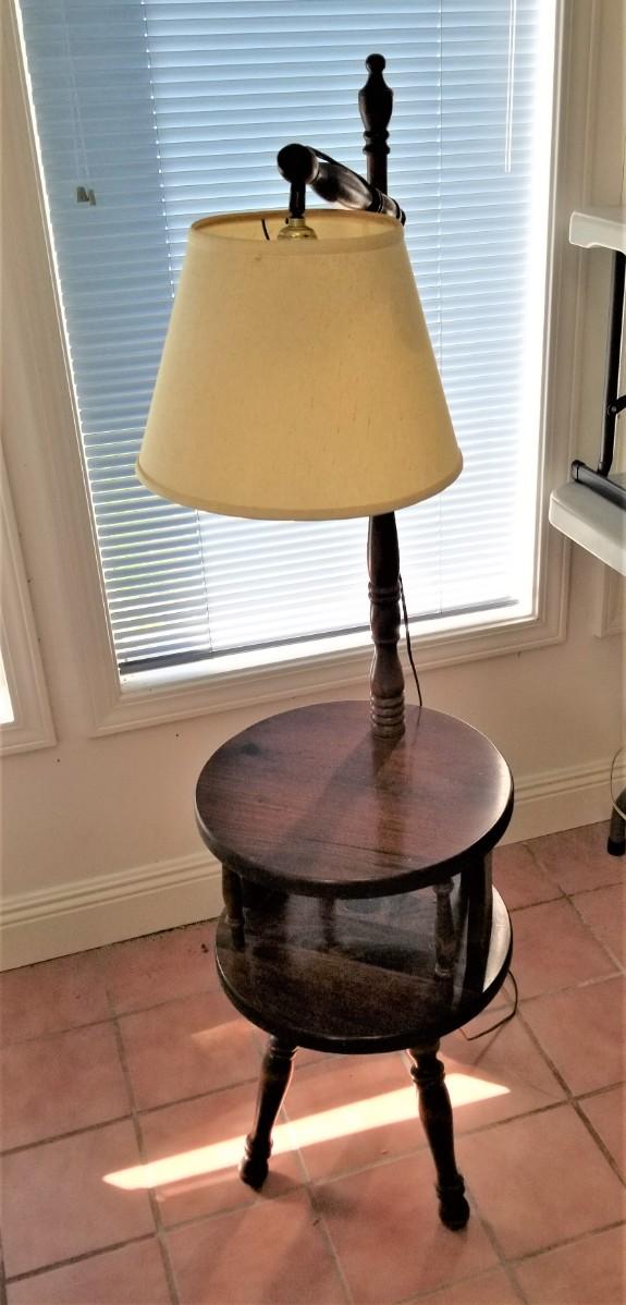 A typical piece of "Coloniawful" furniture made in the early 1970's - lamp/table combo. Lamp works - table has maple finish. 54" tall overall, 15" across, table is 23.5" tall. Vintage condition.