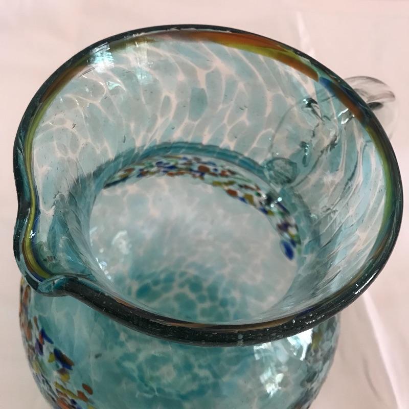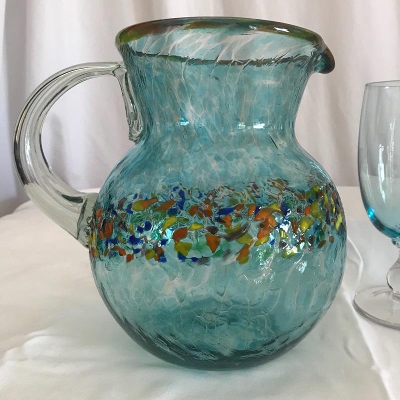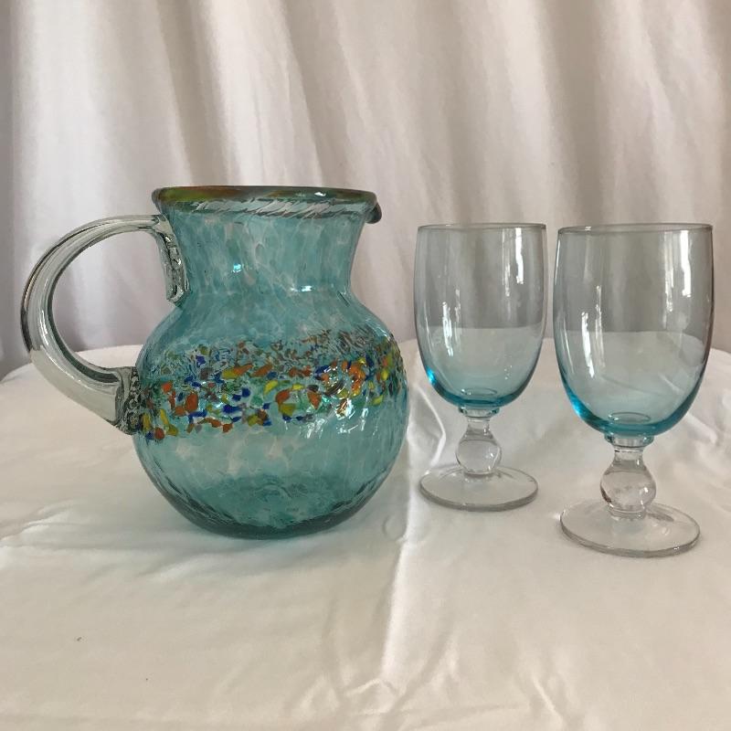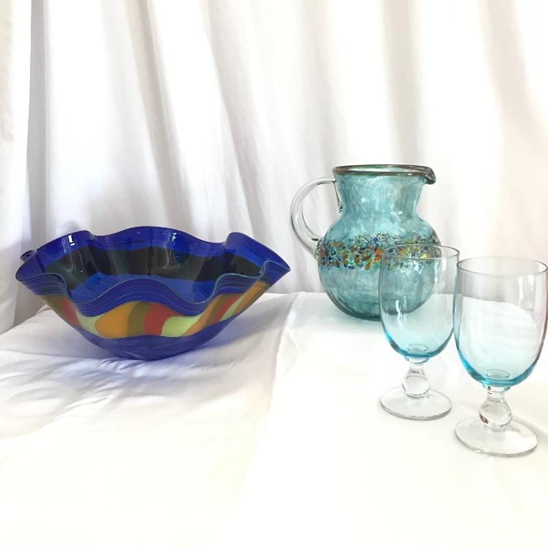 Four gorgeous blue blown glass pieces. A large deep blue swirl bowl with its largest rim diameter at 15.25”. Its warm colored banner matches the bright speckled rim in the 8.5” tall bulb pitcher. To complement them both, a pair of light blue hued stemmed glasses. The bowl has a blemish on the bottom that appears to have occurred during the creation process. See photos. Shipping available.