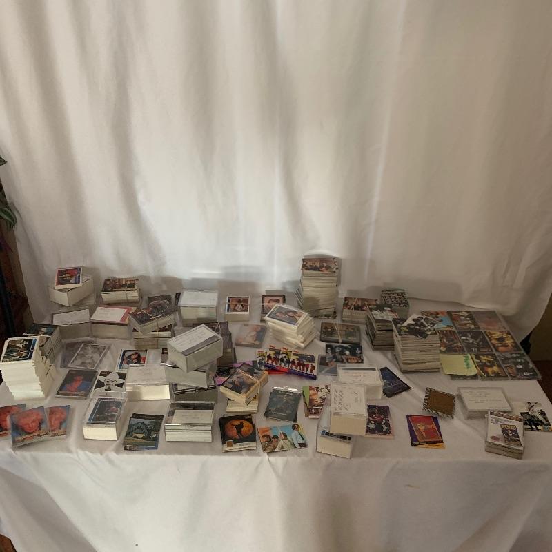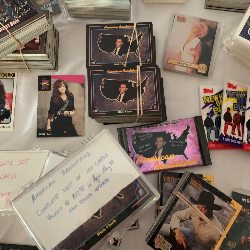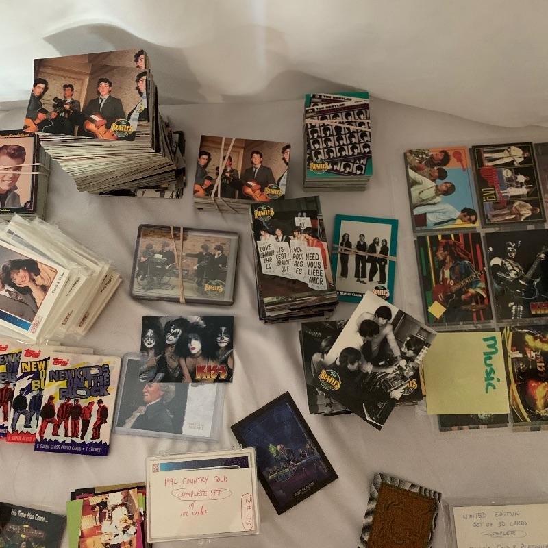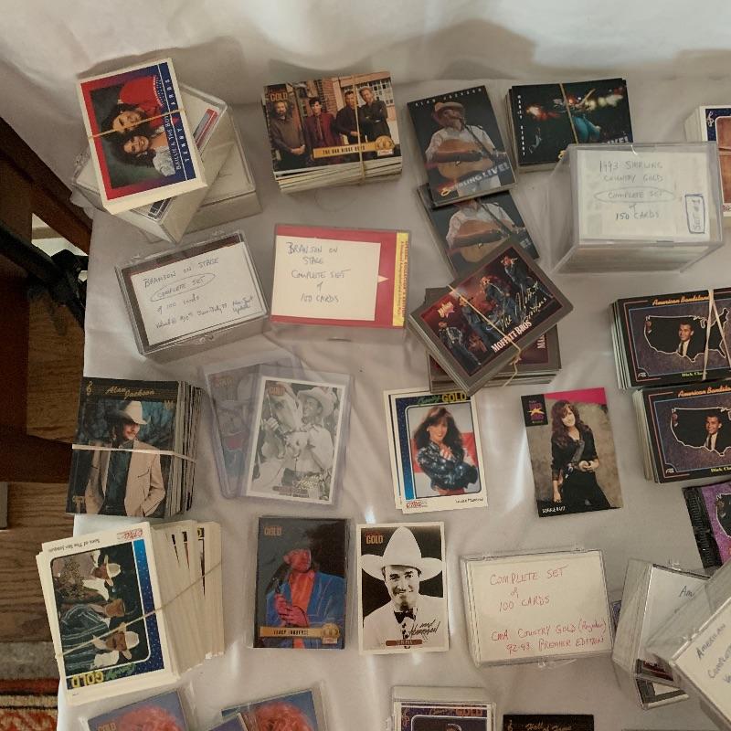 Lot includes a large selection of Country Music artist collector cards. Country Gold Hot picks from 1992, Country Classics, CMA Country Gold Premier Edition 1992/93, Tenny Cards 1992, Branson on Stage, Sterling Live, with sets and duplicates. Lot also includes several unverified sets of American Bandstand 1993 with one unopened pack. Four unopened packs of New Kids on the Block and a large selection of Beatles collector cards and finally a small selection of Elvis cards.