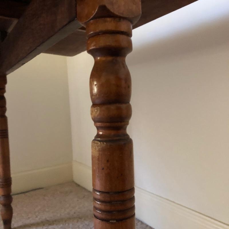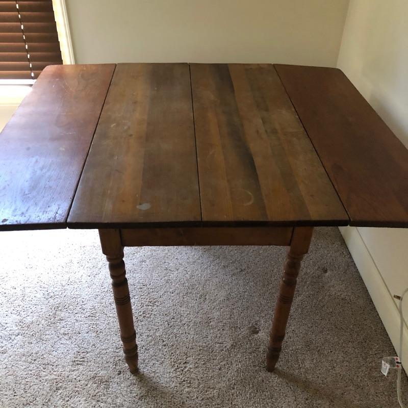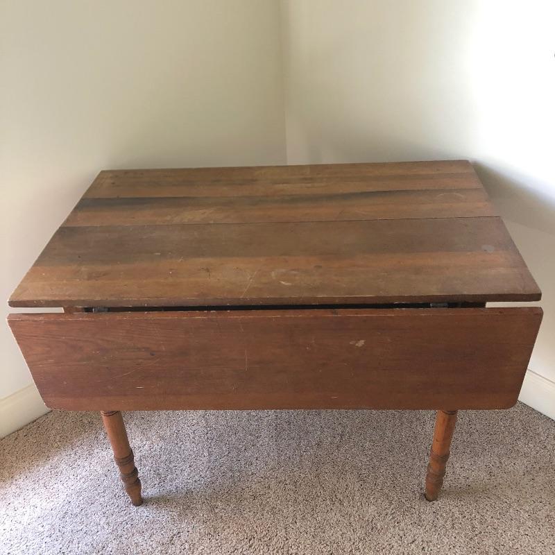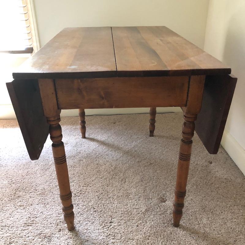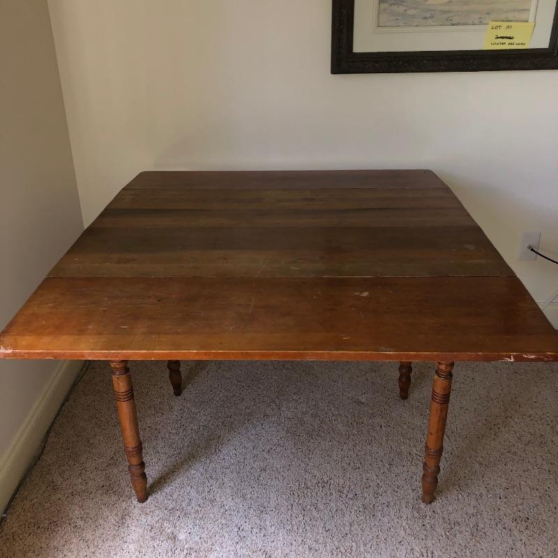 This lot includes an antique wooden drop-leaf table with beautifully detailed legs. This table has two leaves that fold up to increase the tabletop area or fold down to take up less space in your home when not using. The table shows some signs of use (pictured), but it has a lot of character. Measures 29”W x 42”D x 30”H with the sides down. The width is 49.5” with the leaves.
