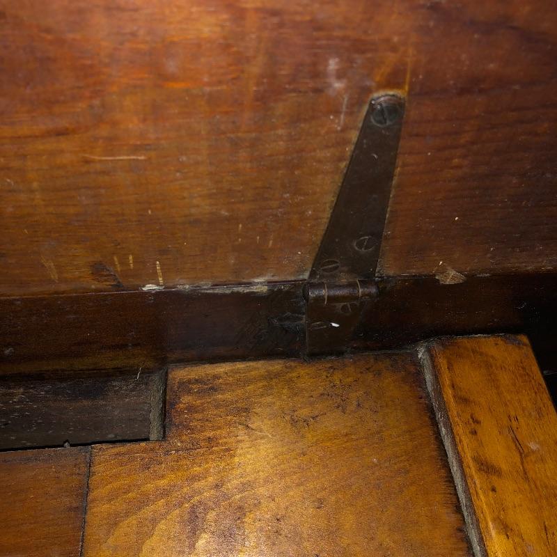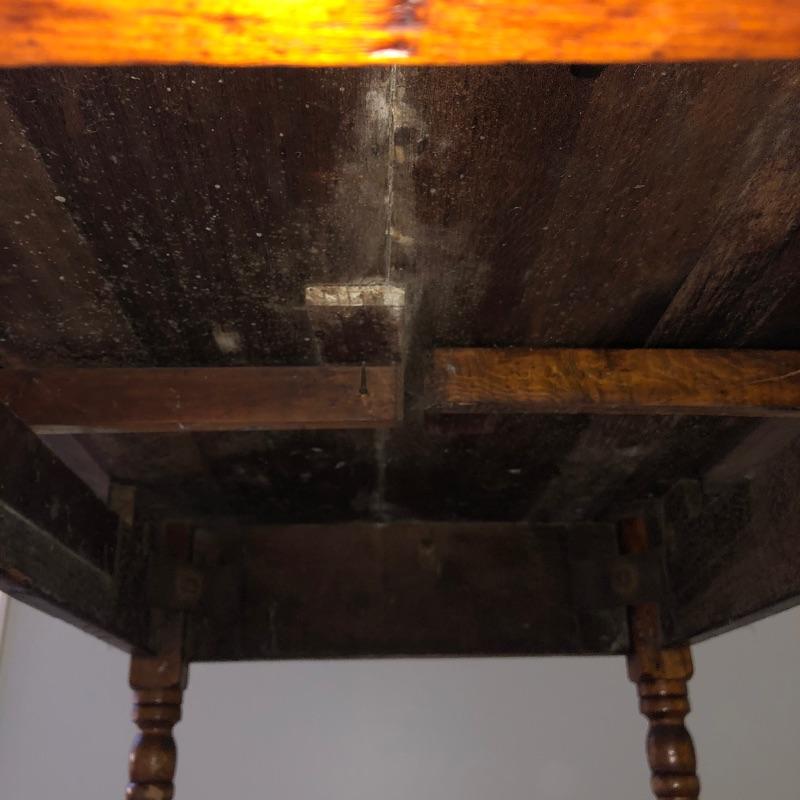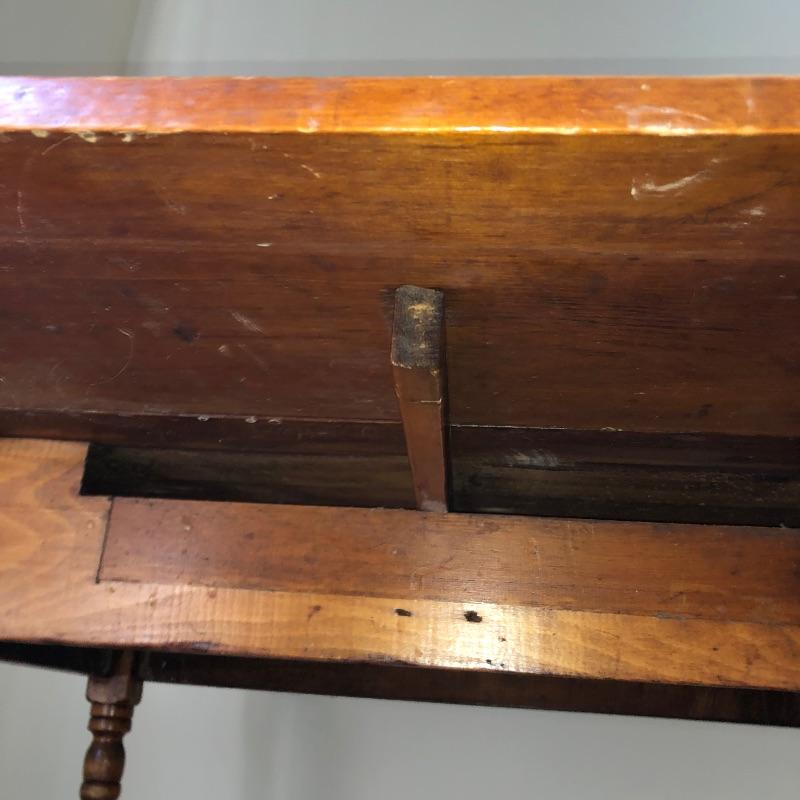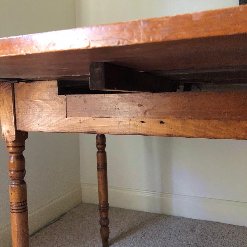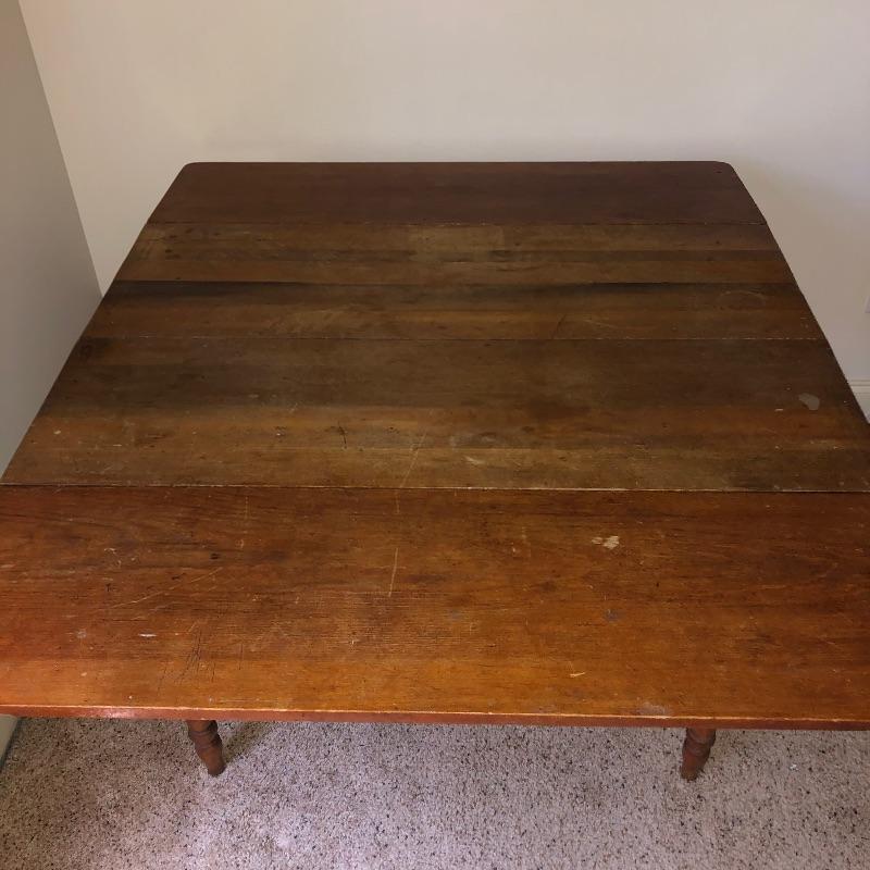 This lot includes an antique wooden drop-leaf table with beautifully detailed legs. This table has two leaves that fold up to increase the tabletop area or fold down to take up less space in your home when not using. The table shows some signs of use (pictured), but it has a lot of character. Measures 29”W x 42”D x 30”H with the sides down. The width is 49.5” with the leaves.
