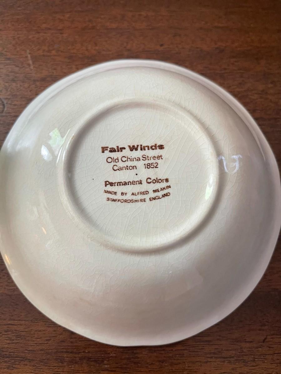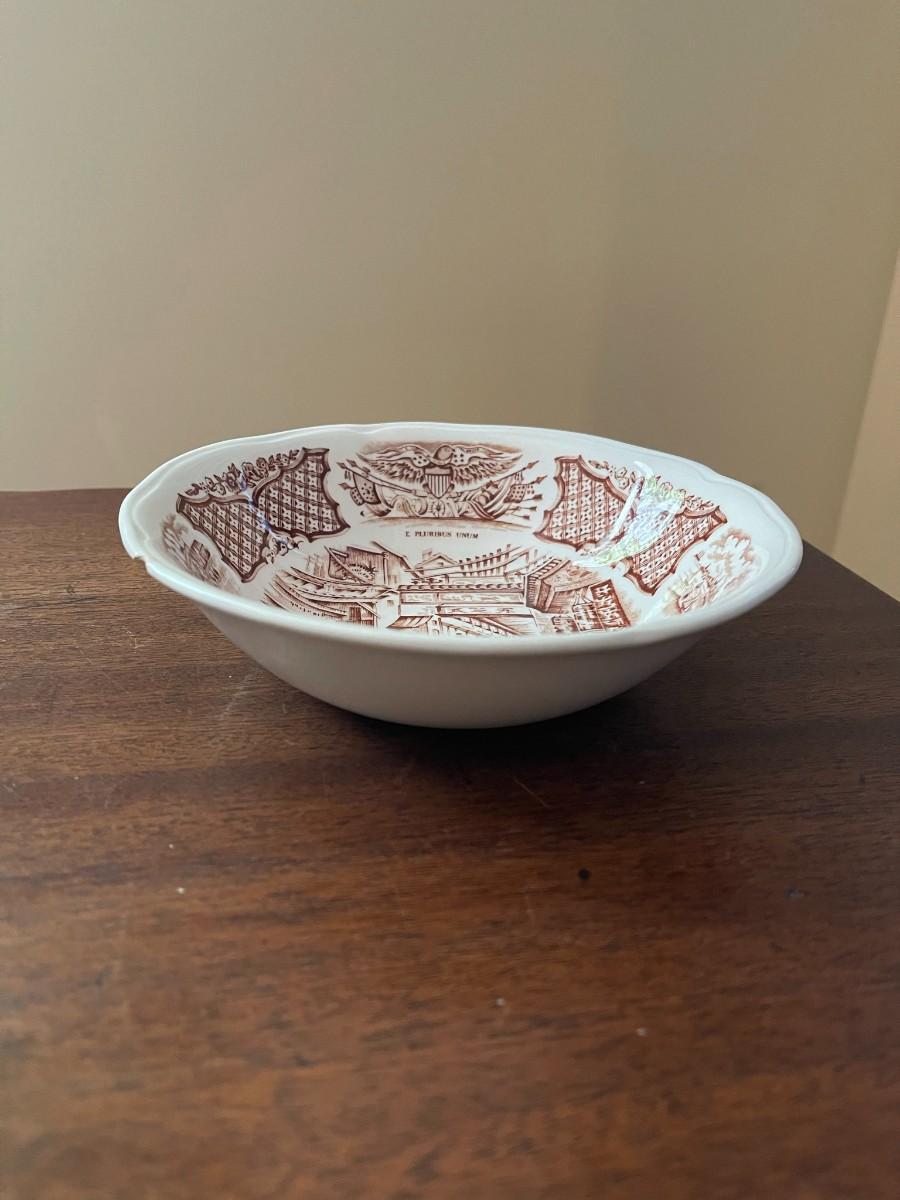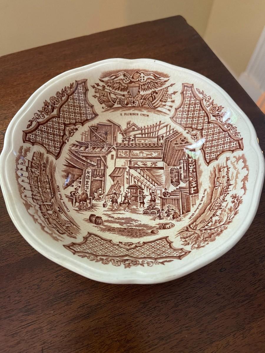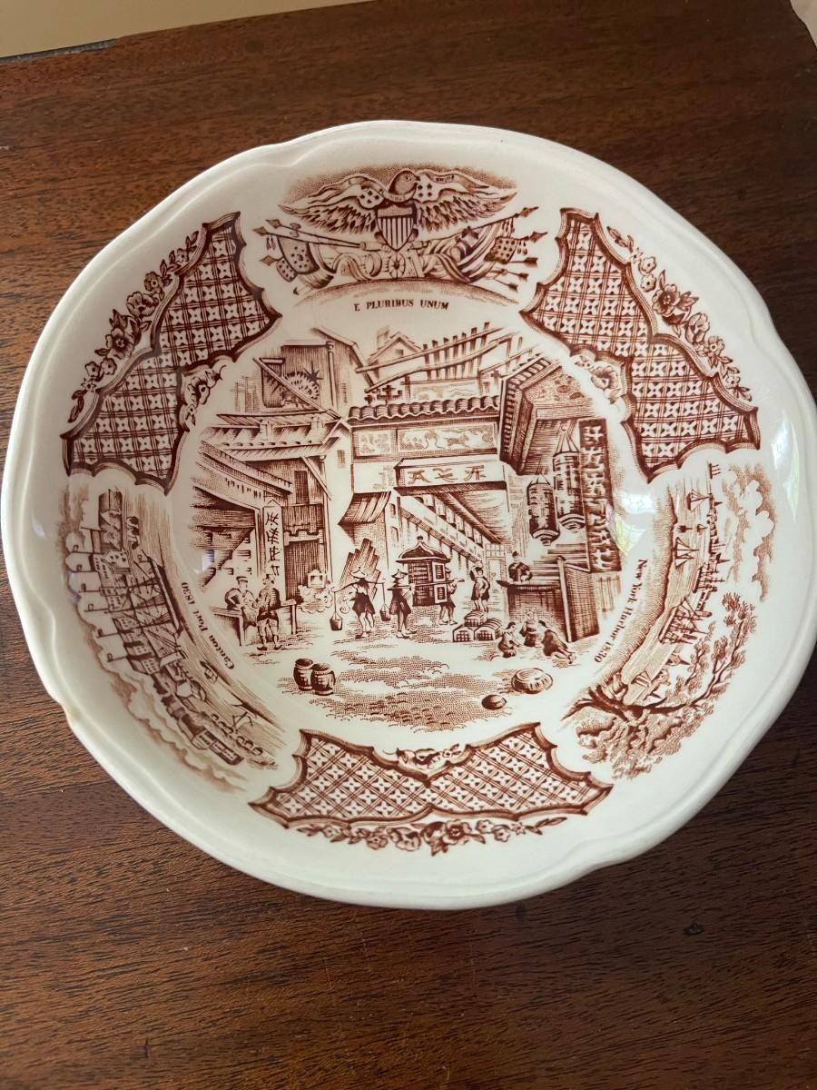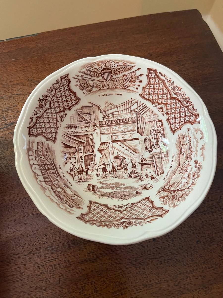 Alfred Meakin, Fair Winds, Brown, Staffordshire, England. Cereal Bowls, 11 bowls. Visuals include NY Harbor 1830, Canton Port 1830, E Pluribus Unum.