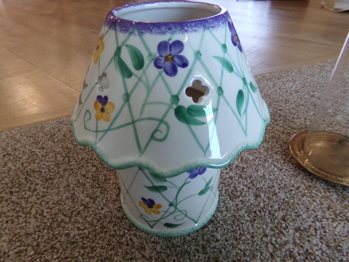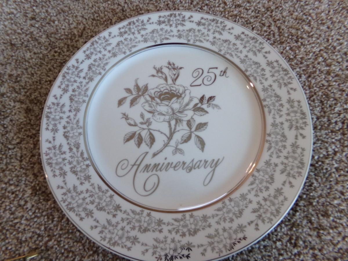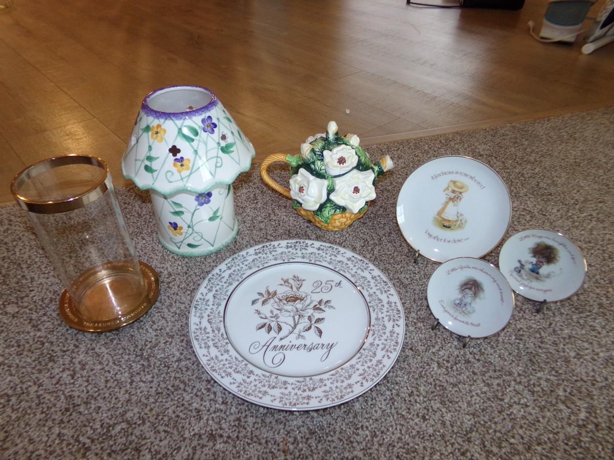 THREE SMALL DECORATIVE PLATES WITH STANDS, TEA POT, CANDLE LAMP, CANDLE HOLDER, AND A 25TH ANNIVERSARY PLATE.