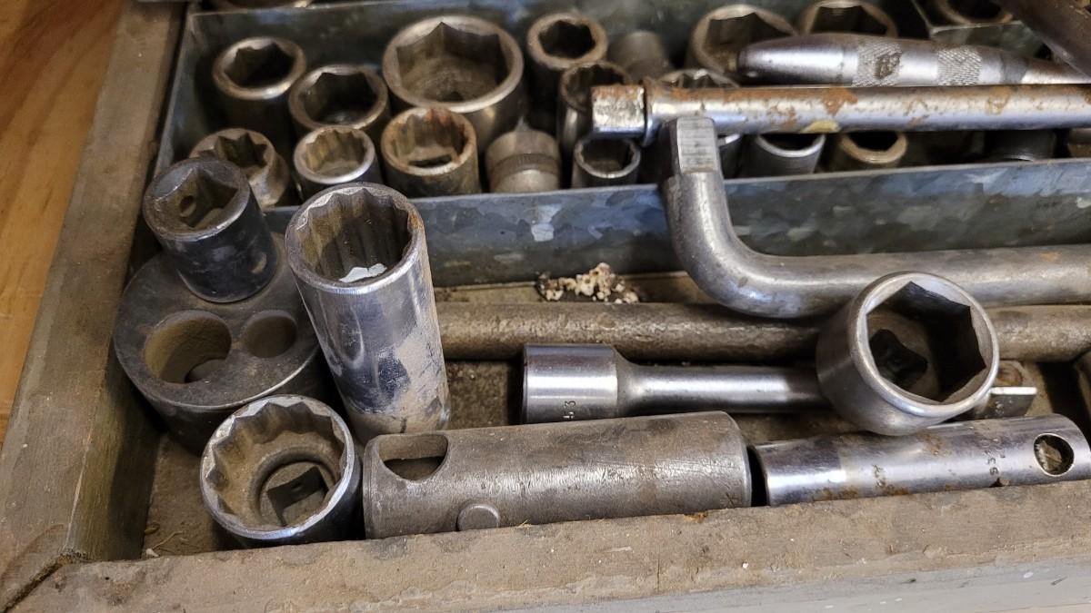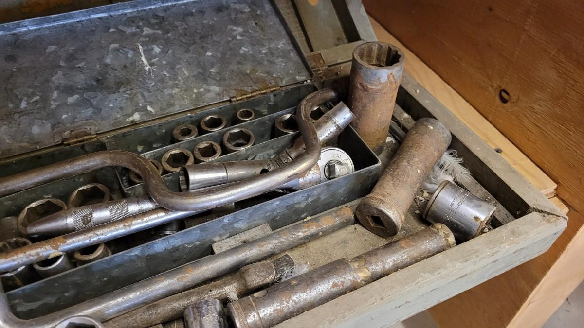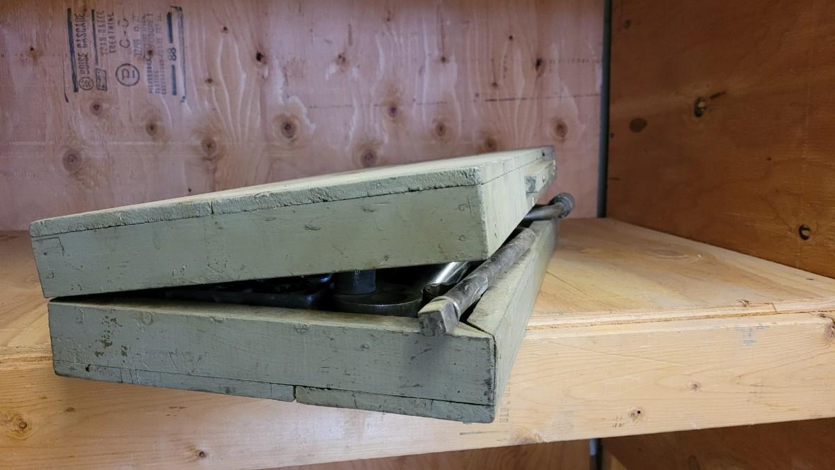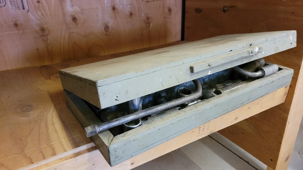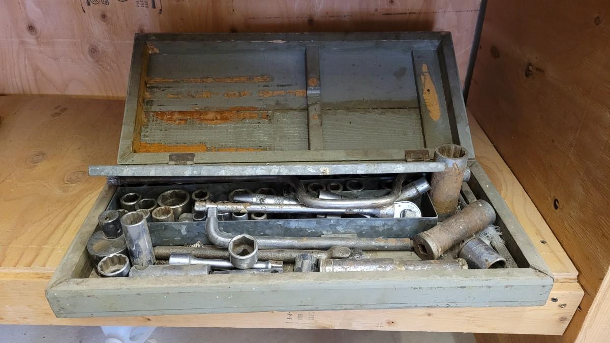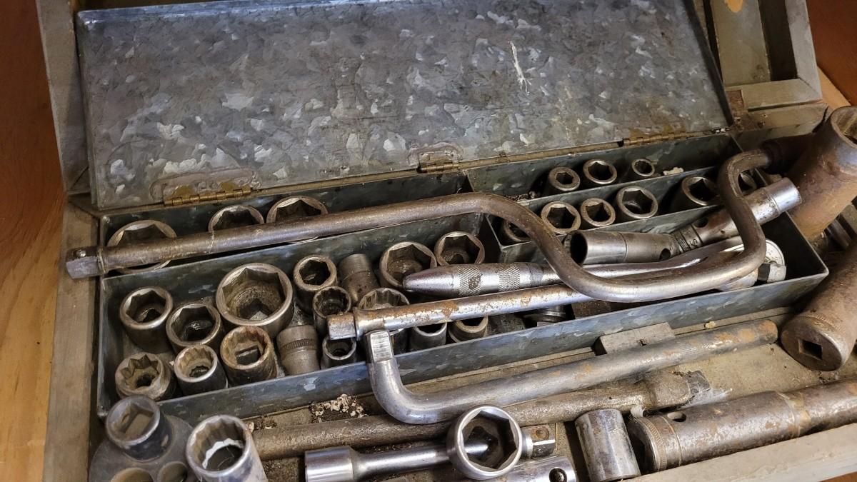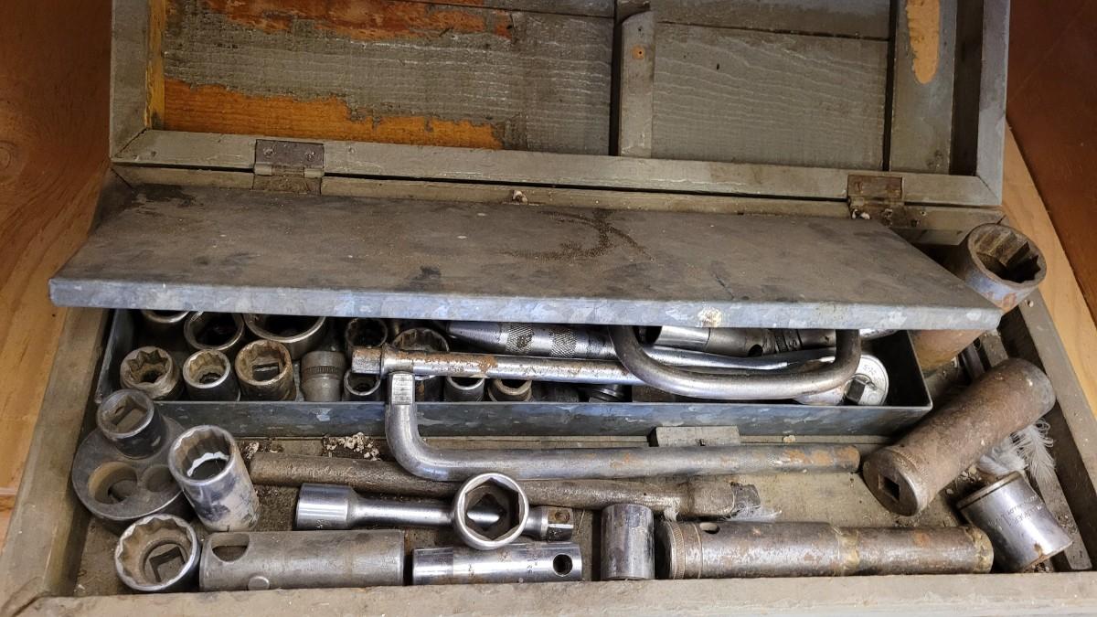 Lot 68: Assortment of Vintage Tools inside Handmade Outer FolkArt Handmade Farmhouse Wooden Case