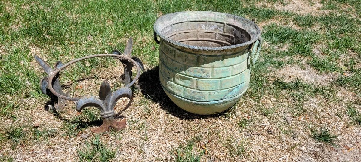 Lot 68: Vintage Metal Flower Pot Base w/ Fleur-de-lis Accents and Metal Flower Pot