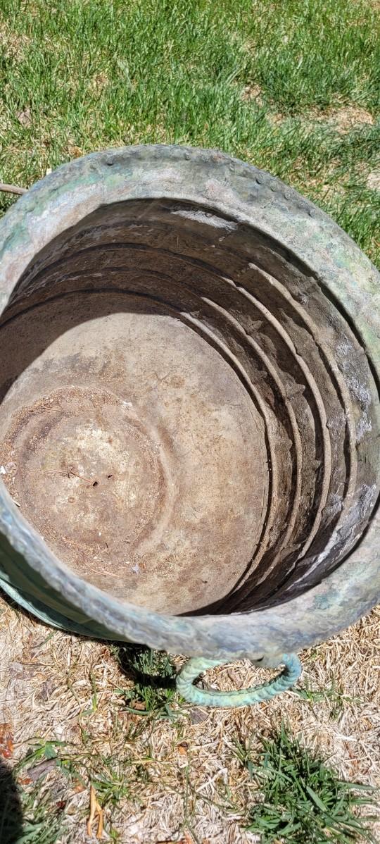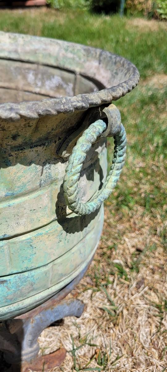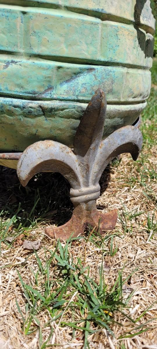 Both the pot and base show age but reveal tons of character. The flower pot has handles and the fleur-de-lis Accents look quite stylish along the outer edge of base.