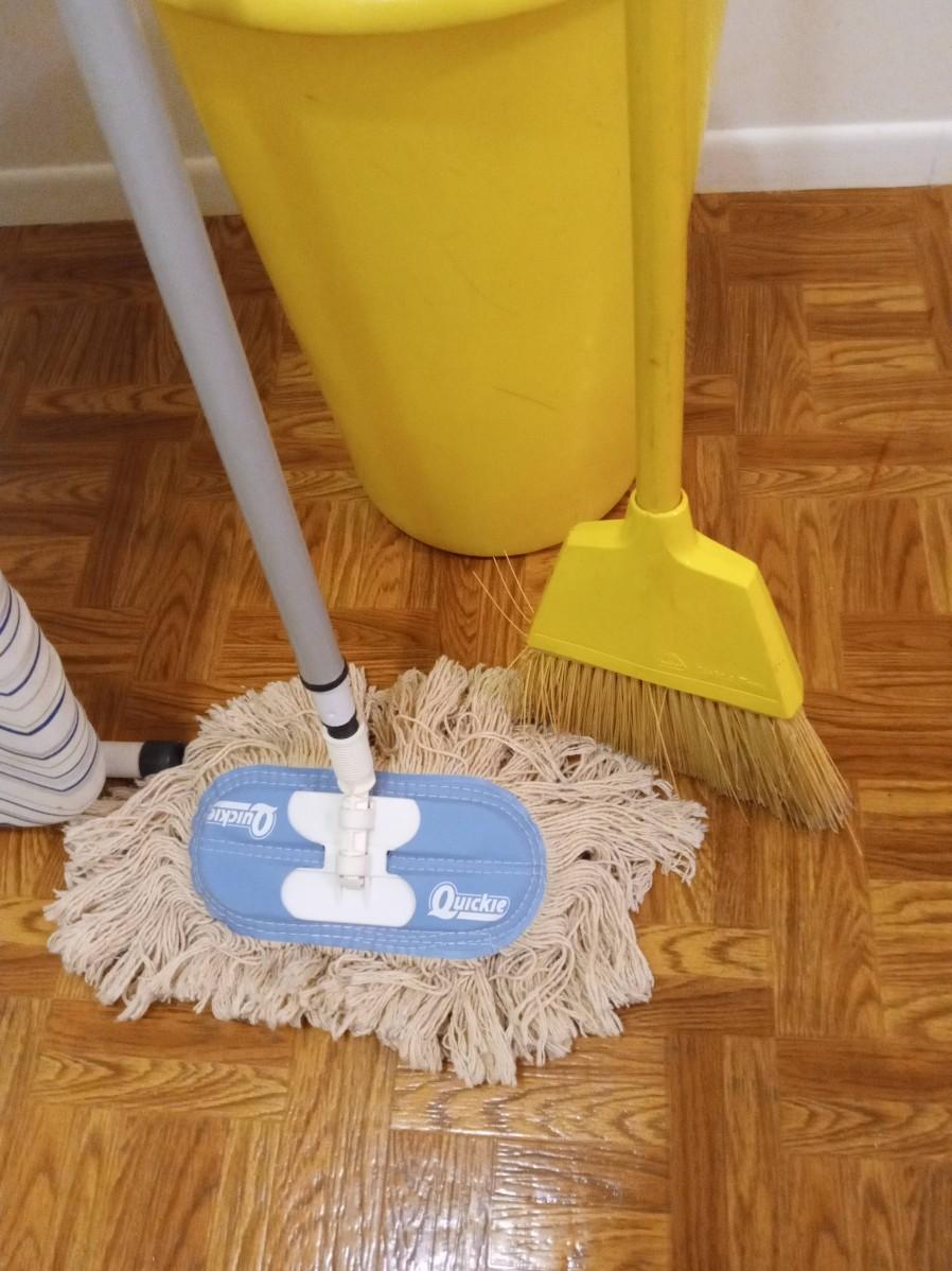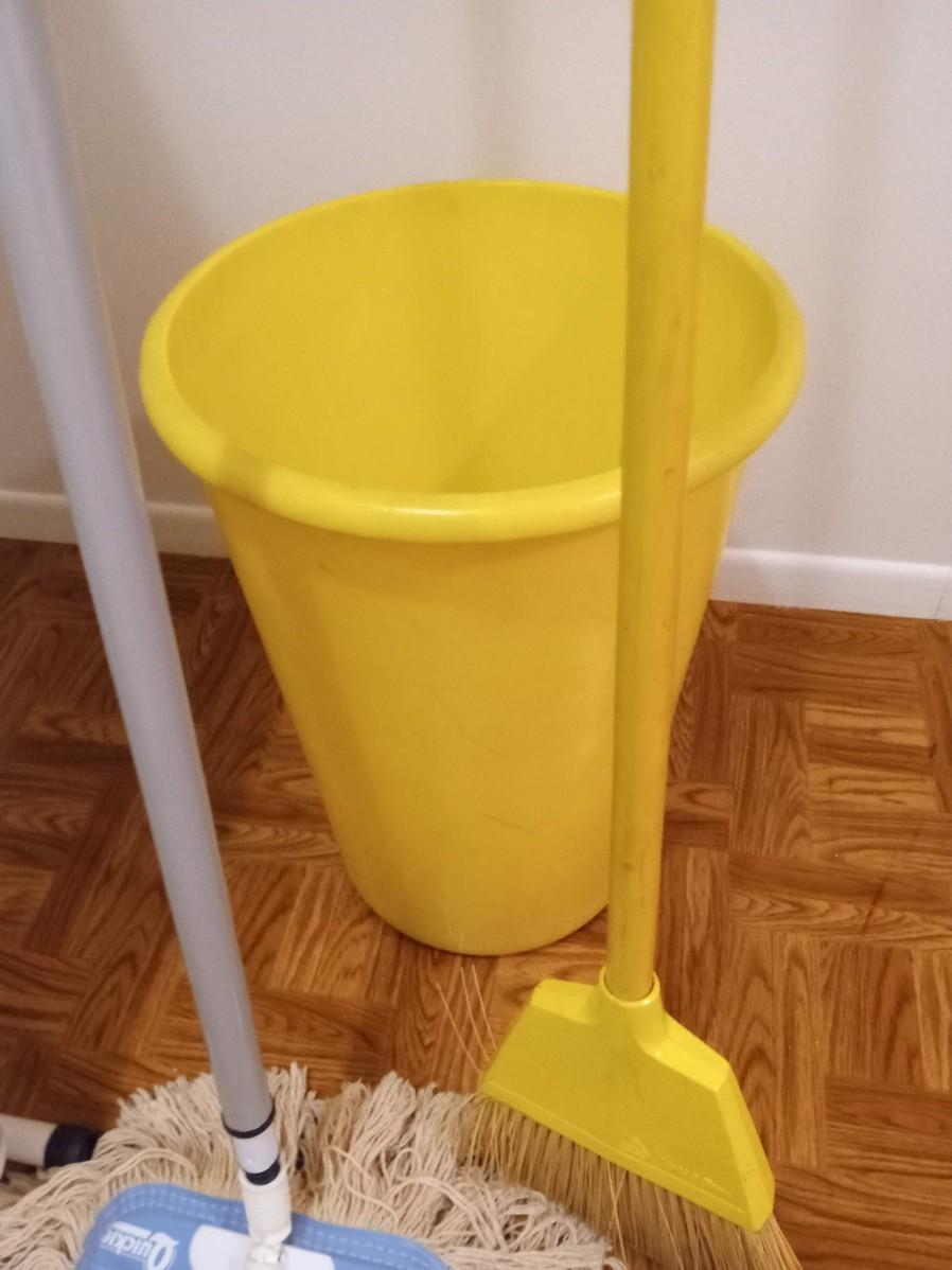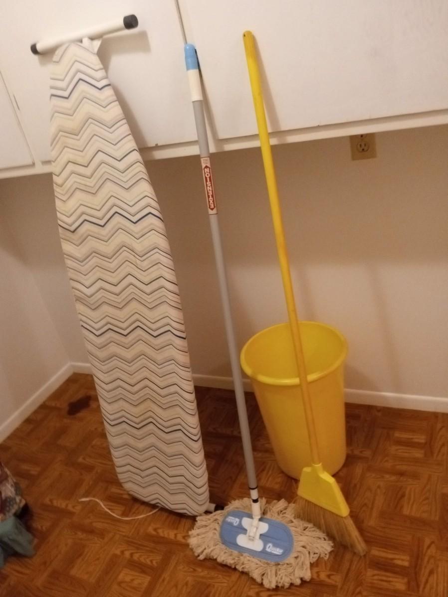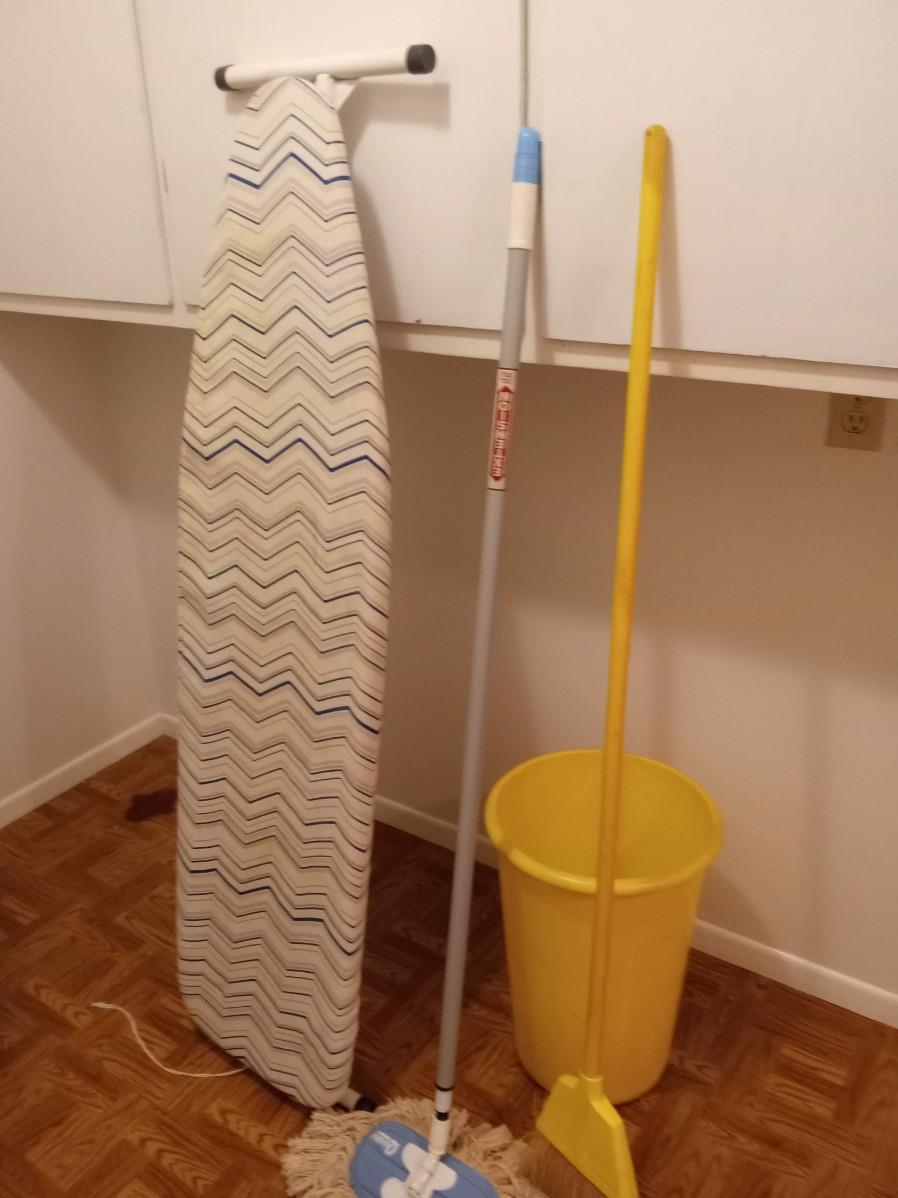 IRONING BOARD, FLOOR DUSTER, BROOM AND TRASH CAN