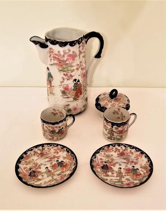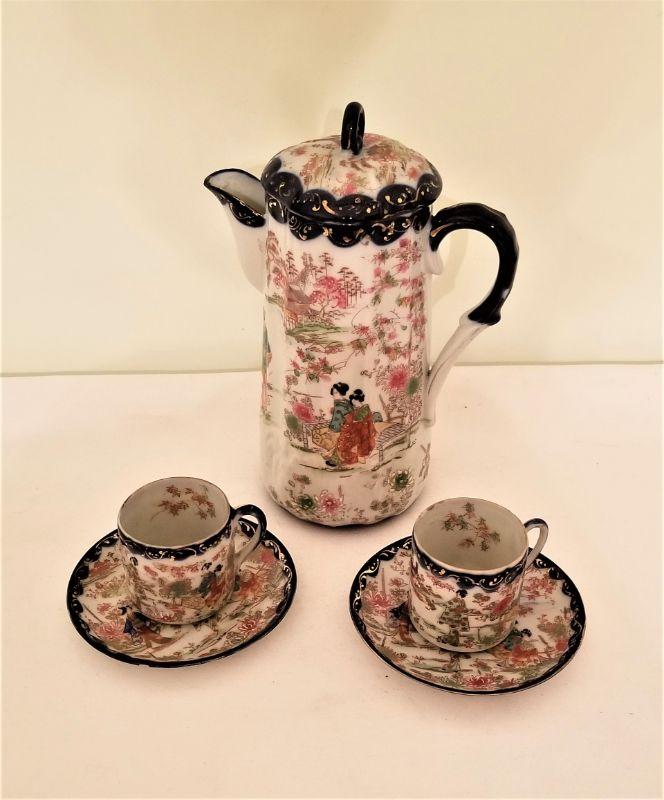 Delicate antique Chinese tea set - Tea pot with 2 matching cups/saucers. Good antique condition. Richly decorated - no maker's mark. Teapot is 9.5" tall.