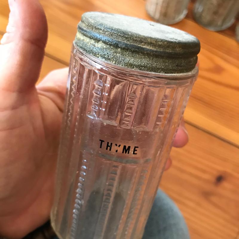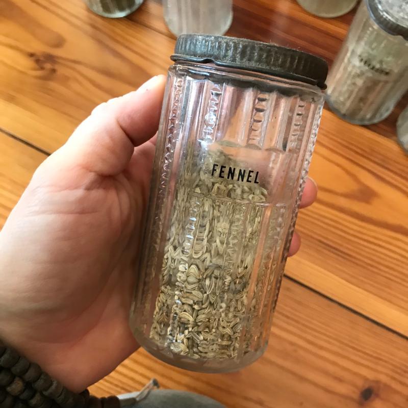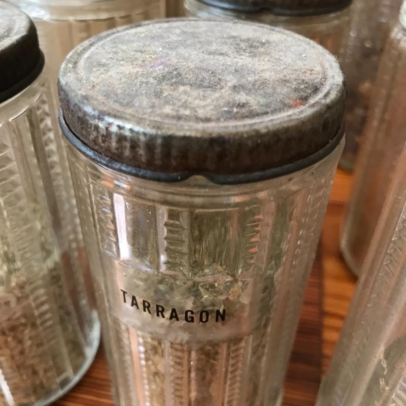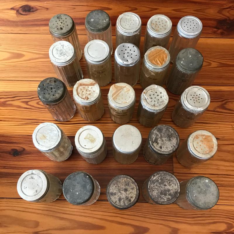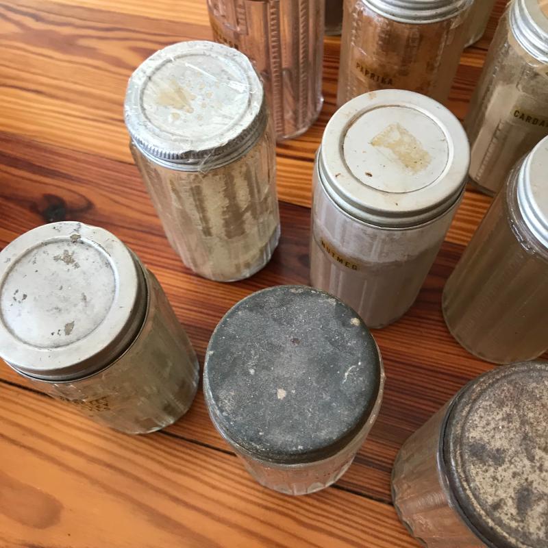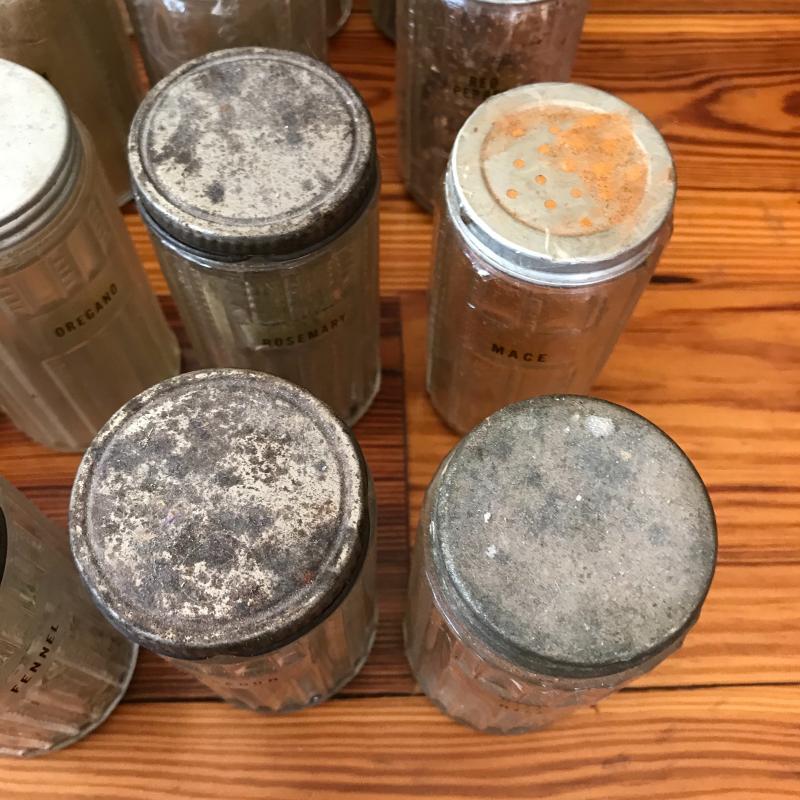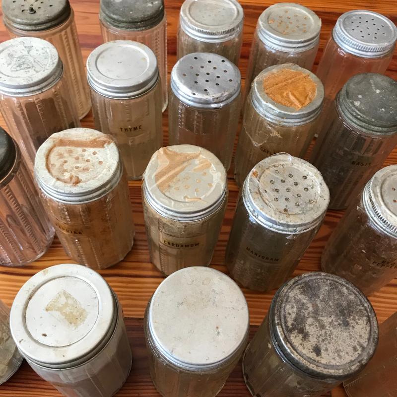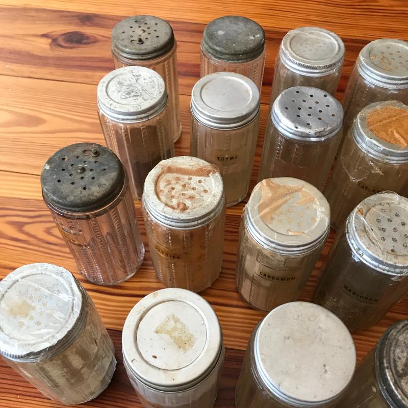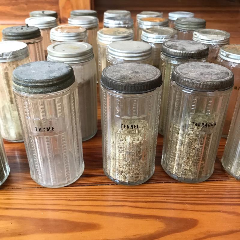 Set of 25 antique glass spice jars. Lids vary in style (and age?). Each stands Approx. 4.25” tall. Shipping available or local pickup in Asheville, NC.