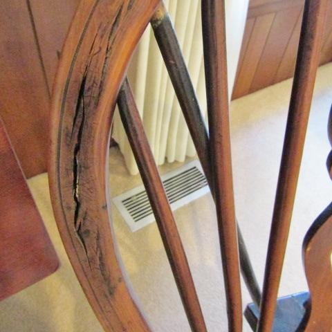 IT APPEARS THAT THE BACK REST WAS MADE FROM WOOD THAT HAD DAMAGE FROM INSECTS (SEE PIC) IT DOESN'T EFFECT THE INTEGRITY BUT DOES GIVE IT MORE CHARACTER