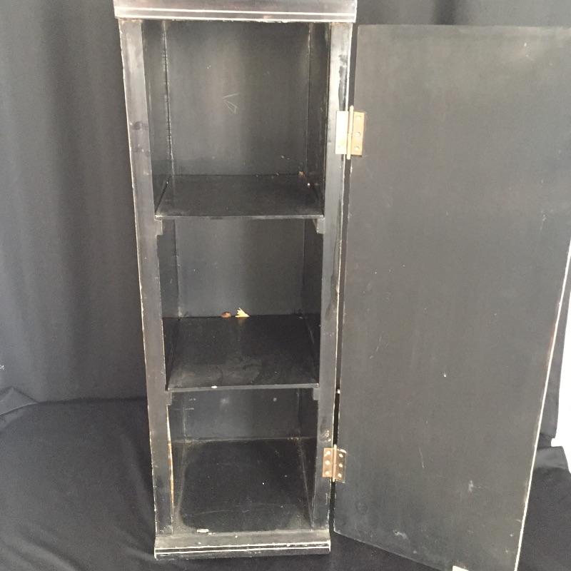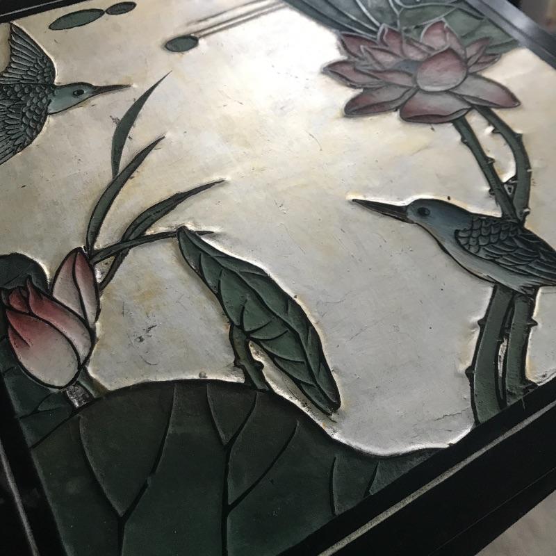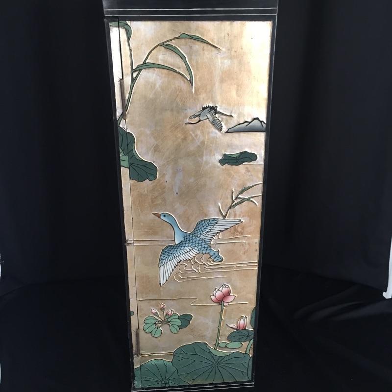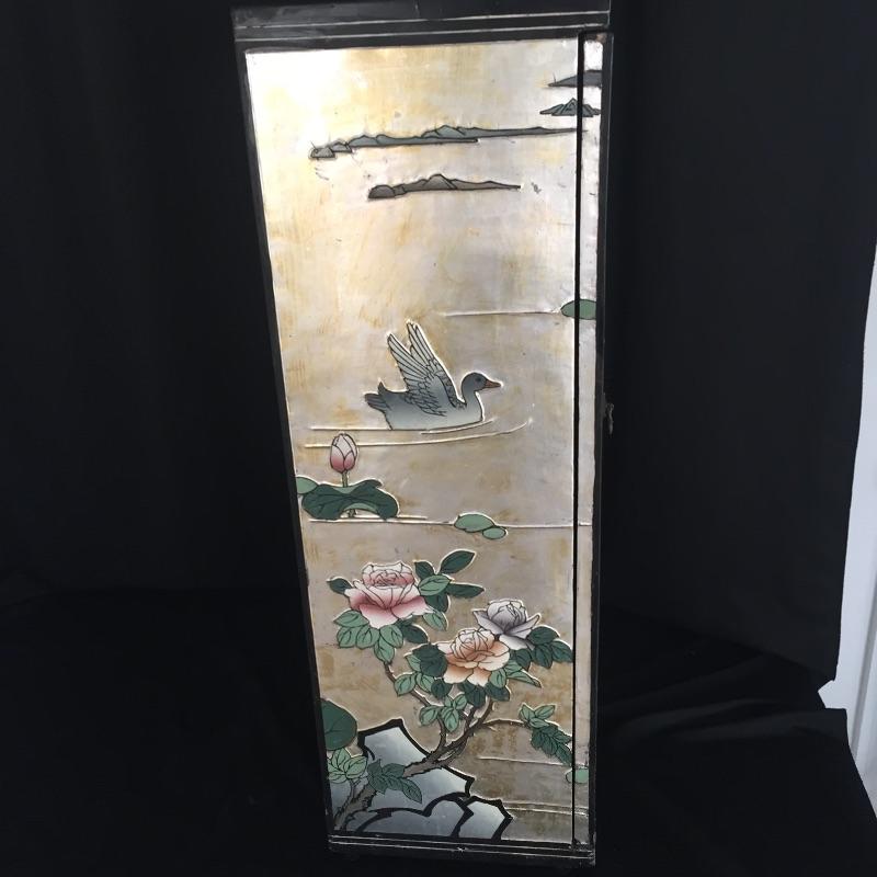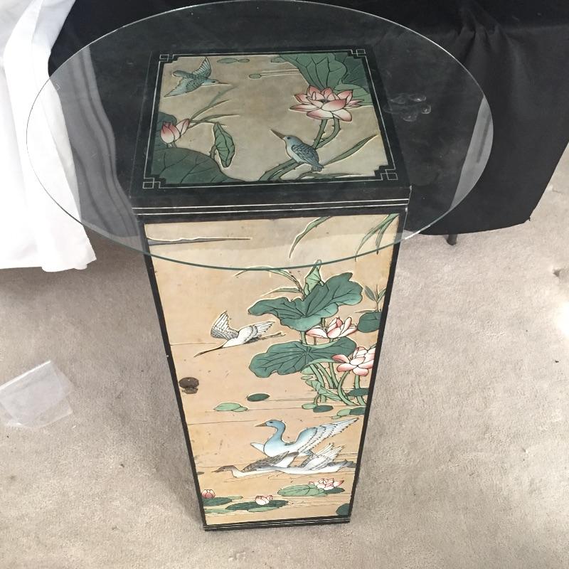 Delightful Asian Inspired table cabinet that can be used with or without glass top to make it a table. Great storage hidden inside this lovely piece. Cabinet measures 12” x 12” x 37”. Glass top measures 22” D.