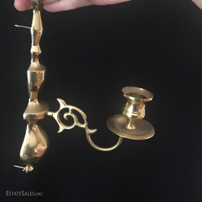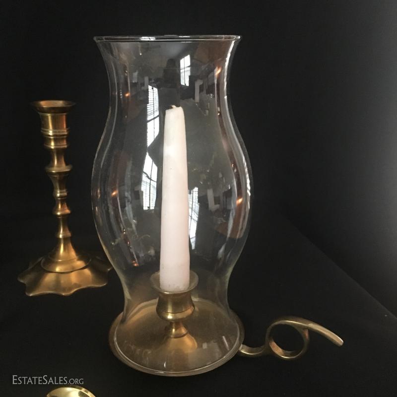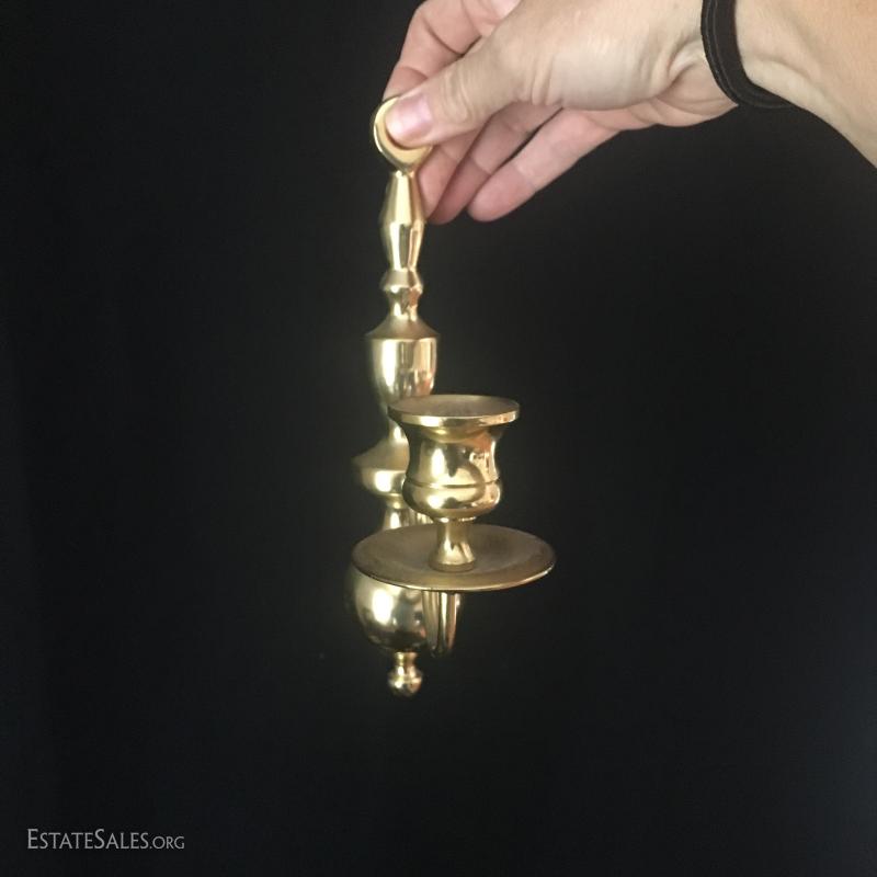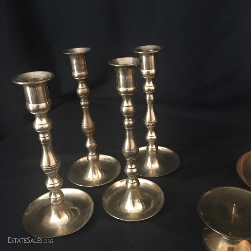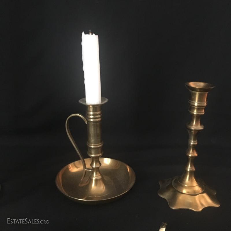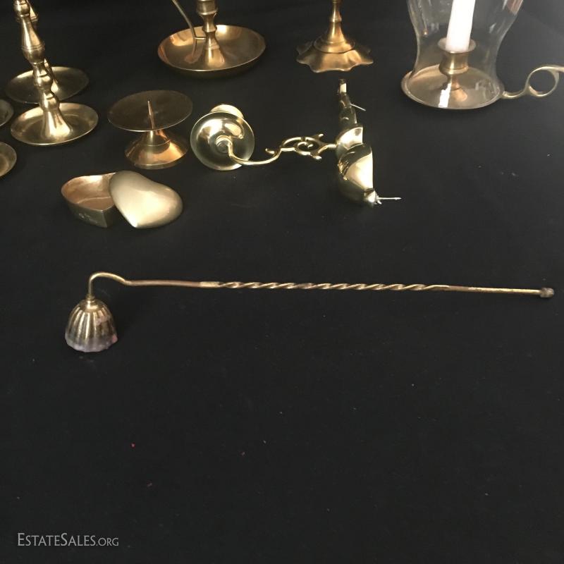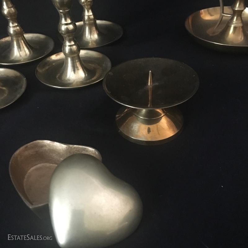 4 matching brass holders made in Japan standing 7.5" tall, one brass candle holder with hurricane lampshade measures 8.5" tall, one wall mount candle holder and one pillar candle holder. There is a brass snuffer and heart-shaped box in this lot as well. Lot is available for shipping or local pick up in Asheville, NC.