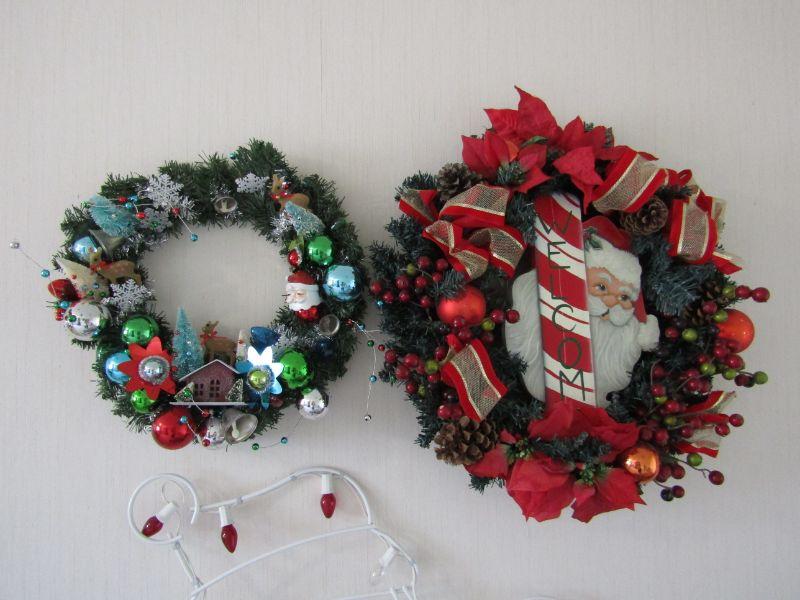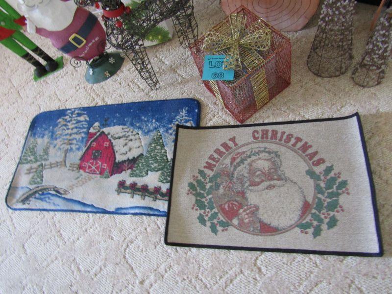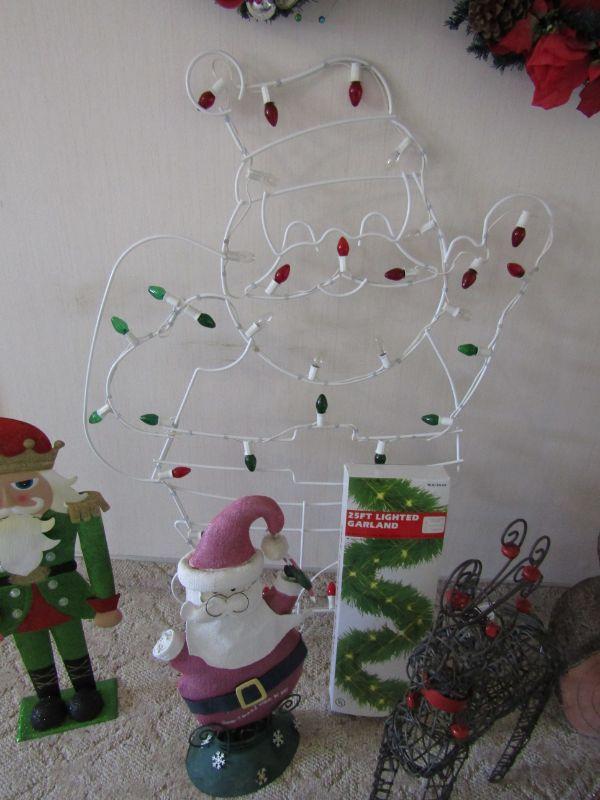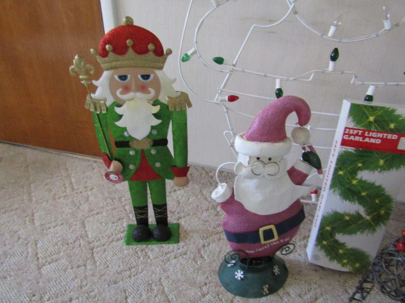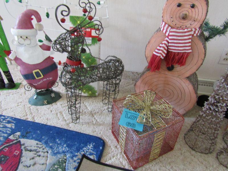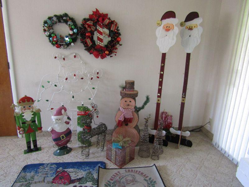 STANDING SANTA CHARACTERS, SANTA'S, SNOWMAN, MADE FROM TREE TRUNK, NUTCRACKER, REINDEER, PRESENTS, RUGS, WREATHS', LIGHTED OUTDOOR SANTA AND SET OF 3 TREES.