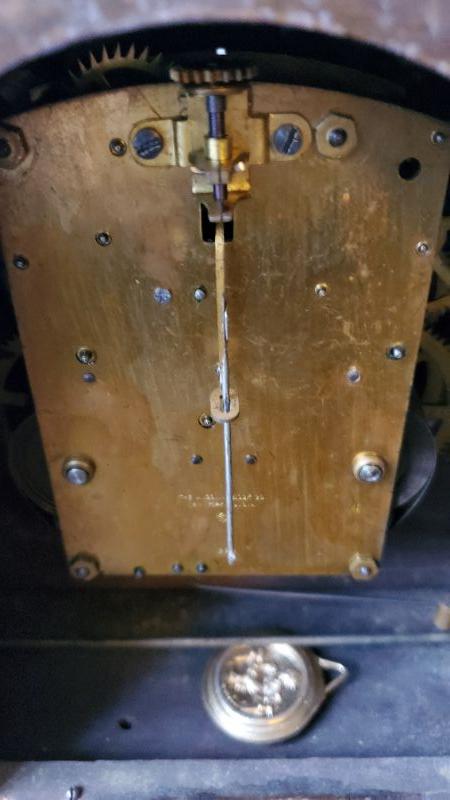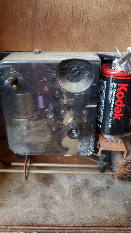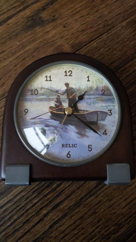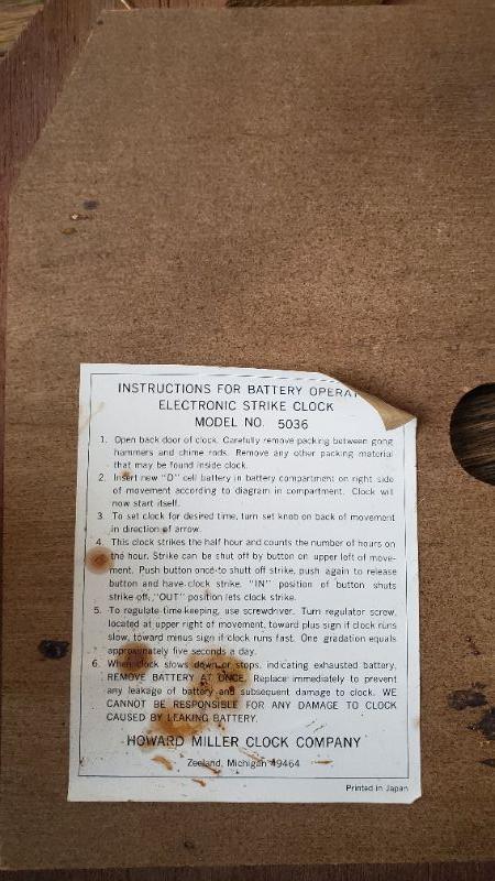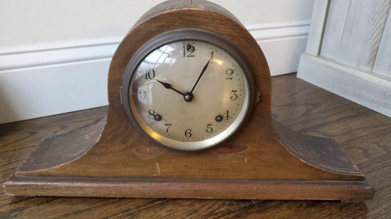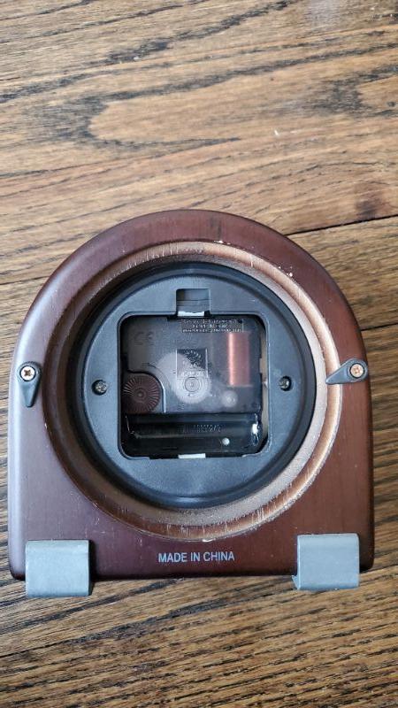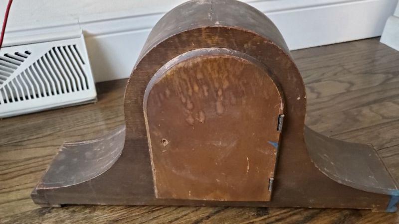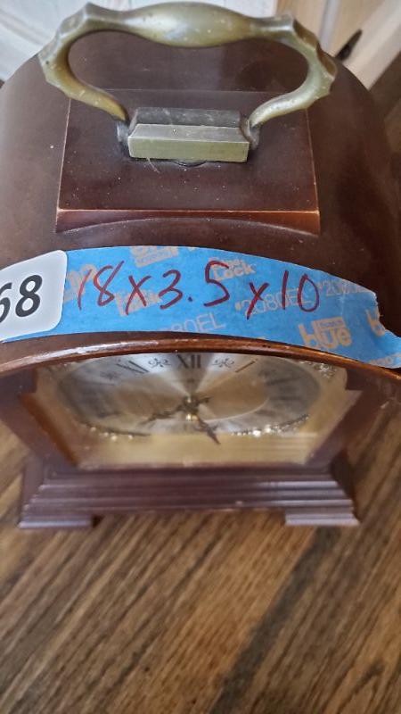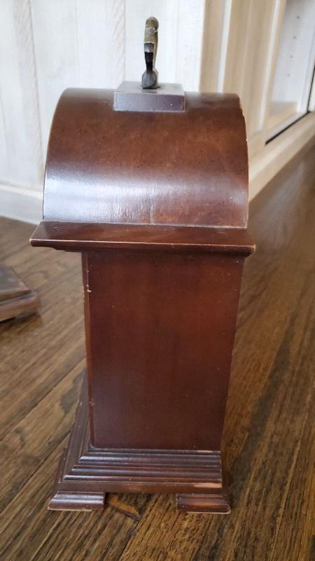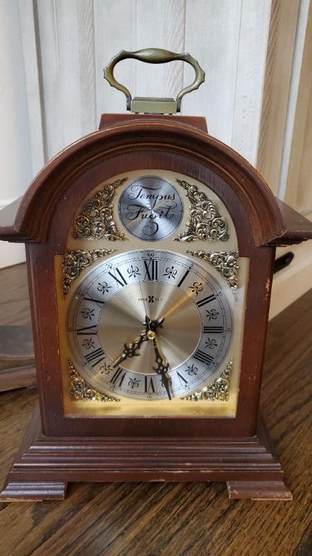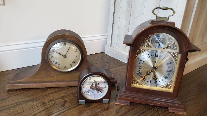 Howard Miller electronic strike clock, vintage wooden mantel clock, and a battery operated alarm clock, back missing. Untested.