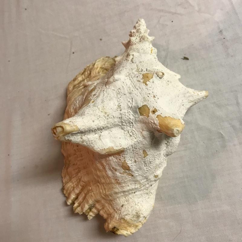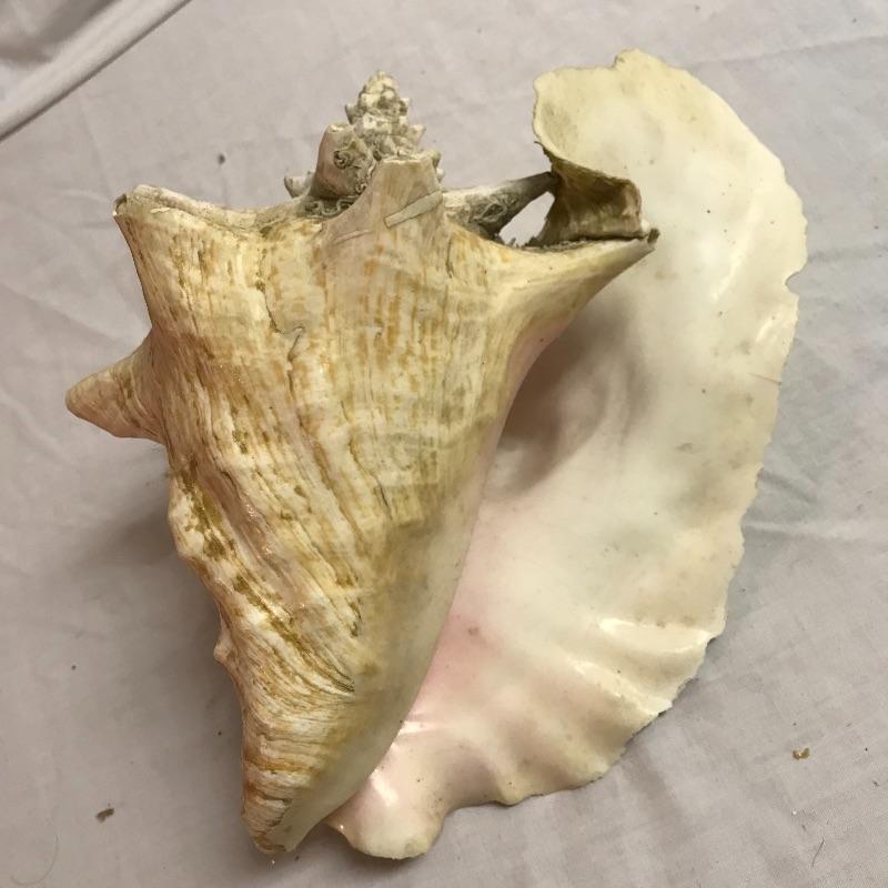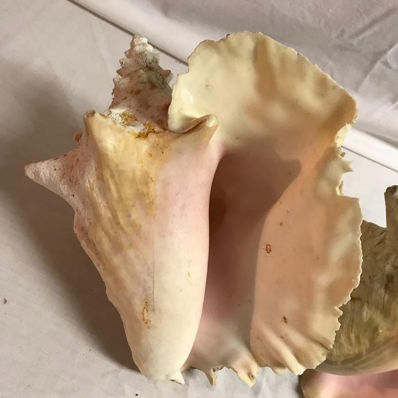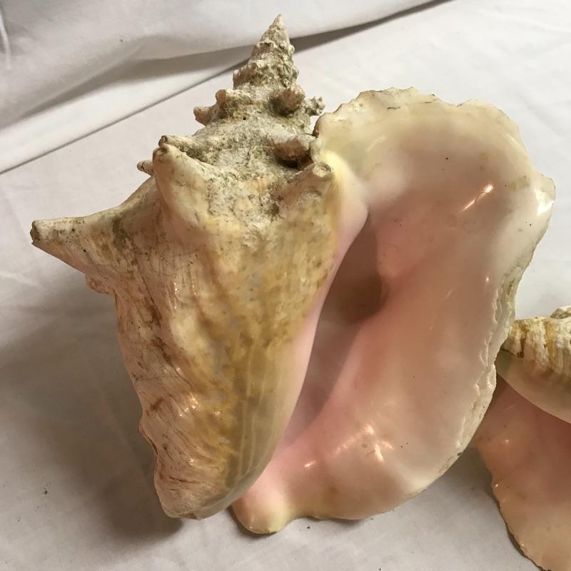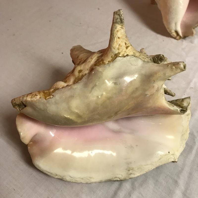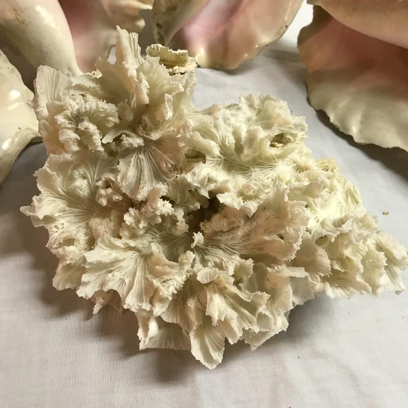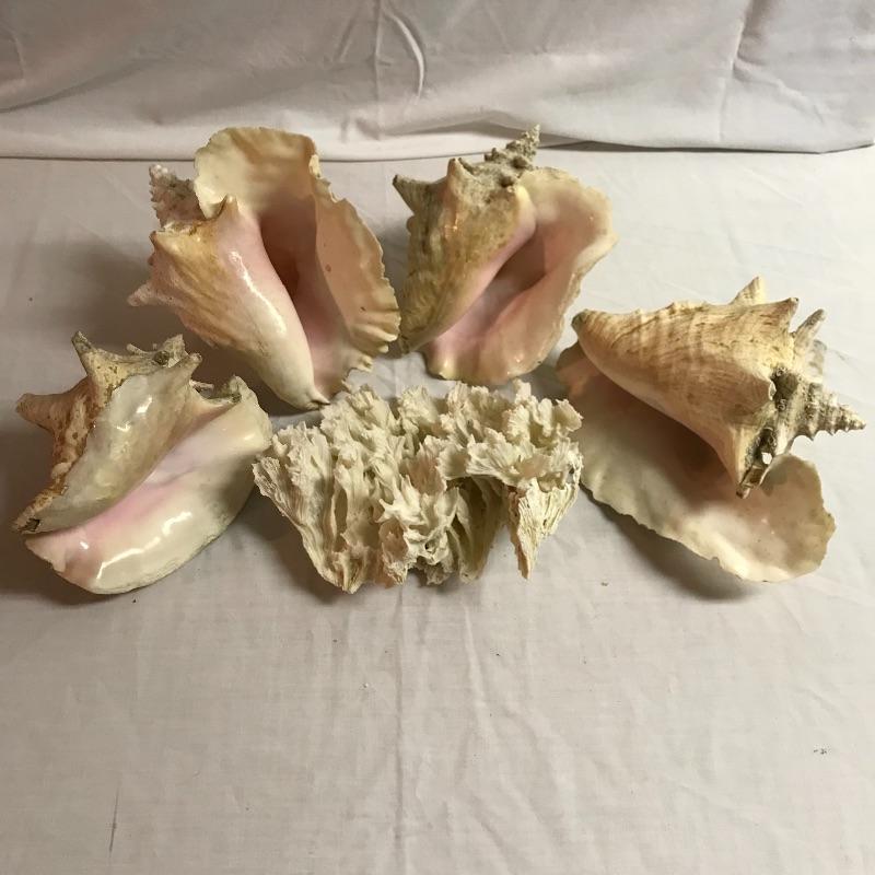 Hear the ocean and feel the serenity! Five large conch shells all with very delicate pink openings. The conches are paired with a whimsical ivory coral measuring approximately 8” x 6” x 3.5”. See photos. No shipping.